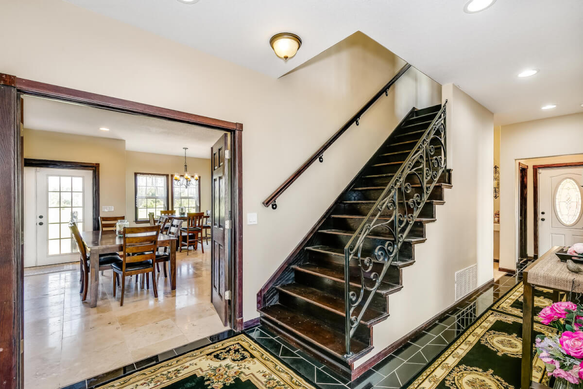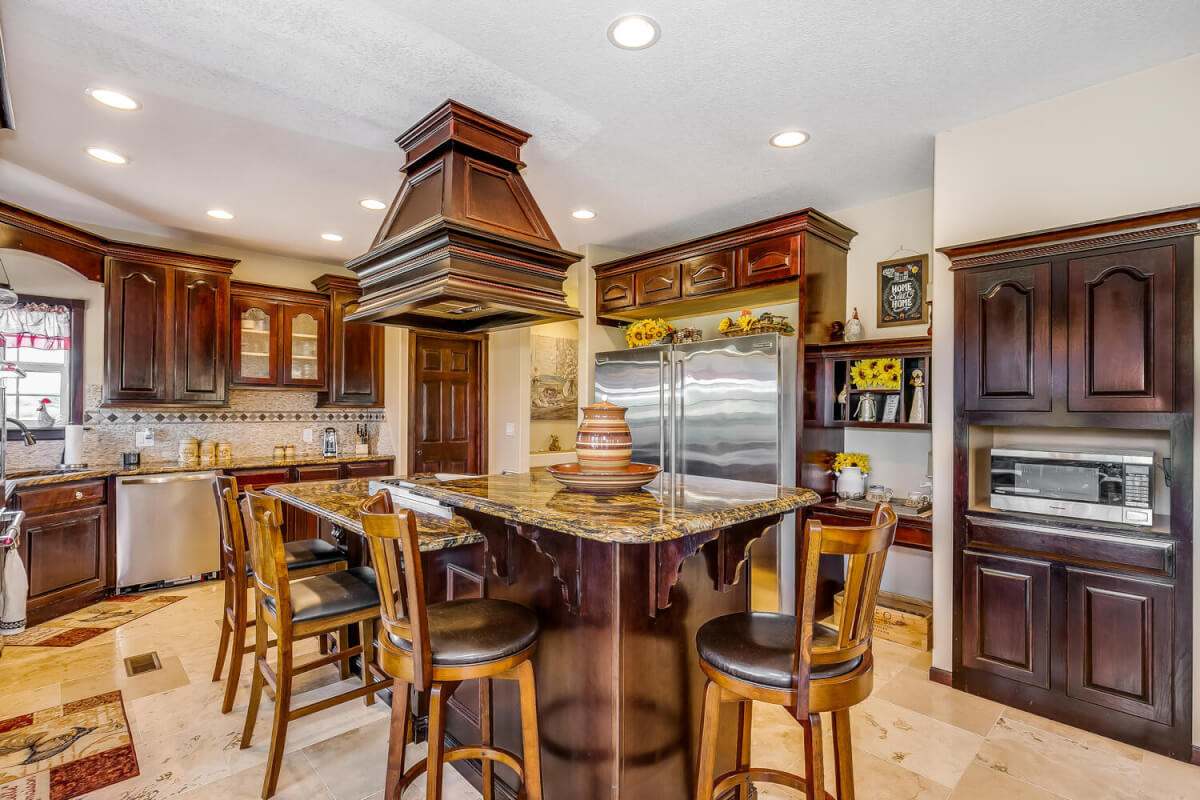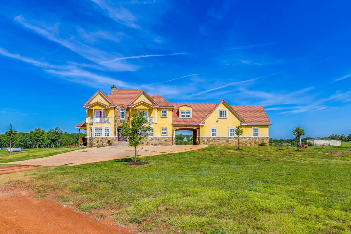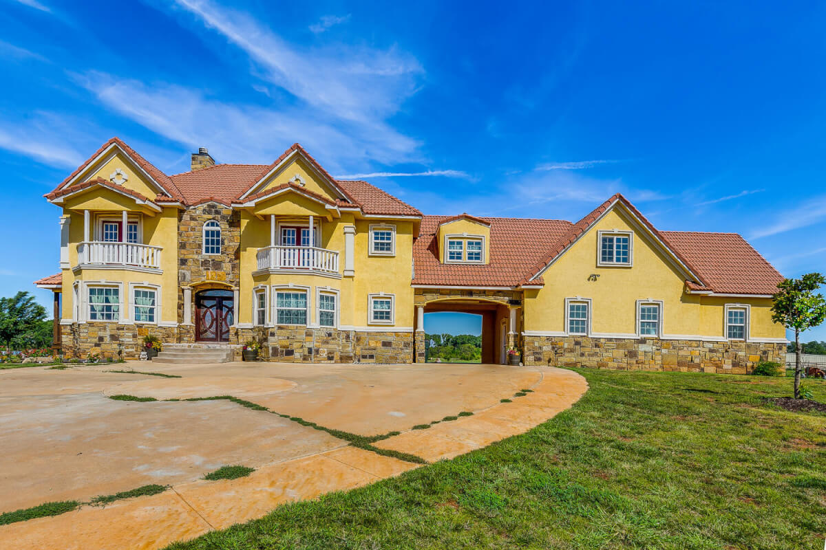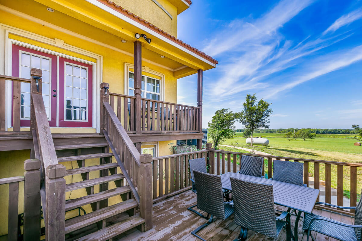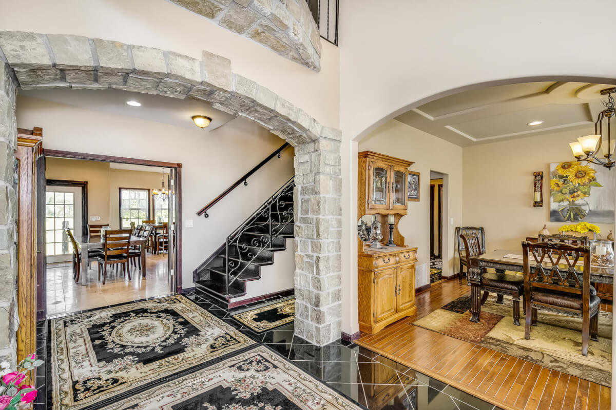 PROPERTY DESCRIPTION: This sprawling home on 58 +/- acres near Murdock, Kansas, is just 40 minutes from the Wichita airport! The impressive home has over 5,500 square feet, has 6 bedrooms, 4 full bathrooms, and 2 half baths, plus an attached oversized 3 car garage with a drive through overhang. The beautiful stucco and masonry siding, and the tile roof are very complimentary of each other. Walking through the front door, you will immediately notice the gorgeous stone archway, a hearth room with wood burning fireplace to your left, and a formal dining room to your right. Keep going straight past the stairway to enter into the living room on your left, with another wood burning fireplace, and the huge kitchen with tons of seating area on your right. The floors are mainly hardwood throughout, with touches of marble flooring in the entry and hallway, and tile in the kitchen. The kitchen has granite countertops, a pantry, a double door stainless steel refrigerator, an island, and a desk. Upstairs, the beauty continues with four bedrooms and three baths, and a gorgeous ensuite bathroom with separate jetted tub, walk-in shower and granite counters. Down in the walk-out basement is two more bedrooms and a bath, plus a beautiful dry bar with more stone features. Walking out back from the basement, you will notice the two-level deck and the gazebo. Even though the pictures are beautiful, they do not do this home justice. You must see this property in person to truly appreciate its uniqueness and beauty!