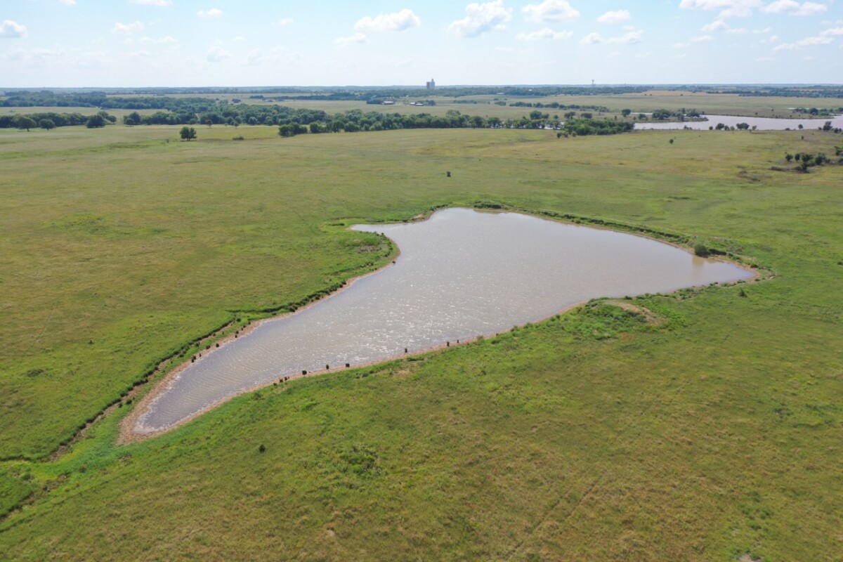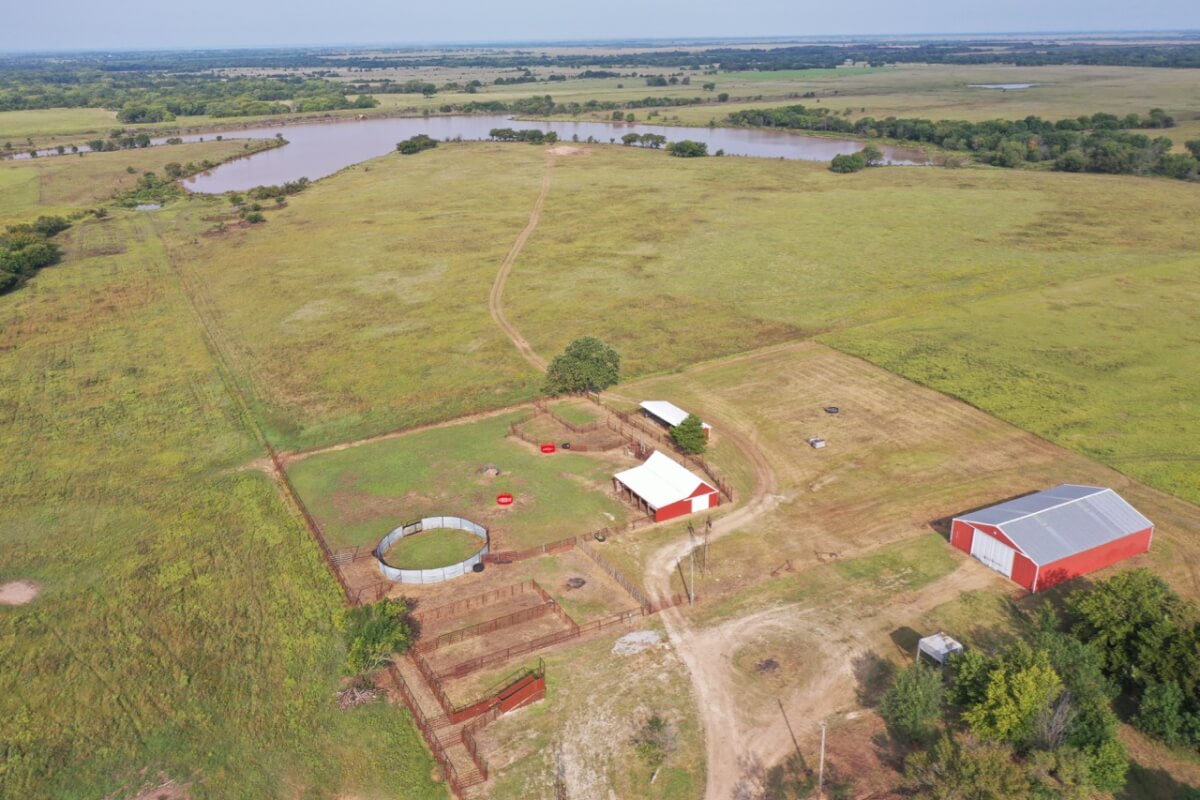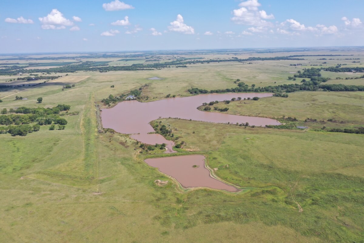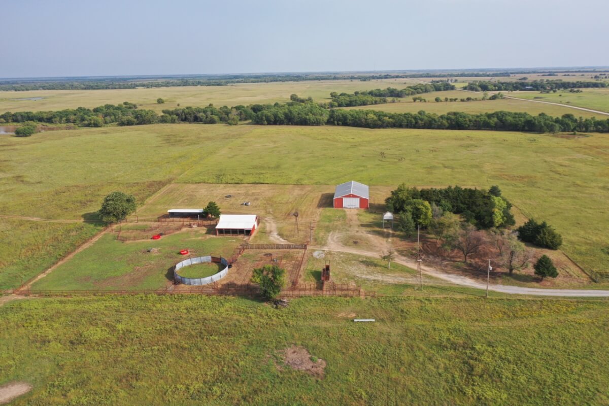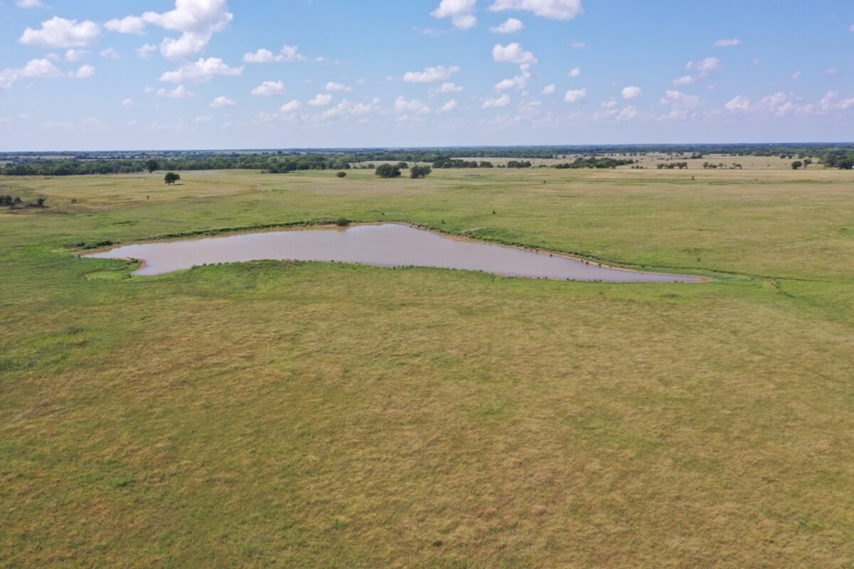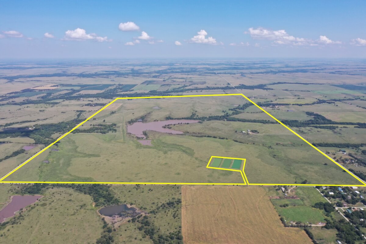 PROPERTY DESCRIPTION: 923+- acres of good quality Kansas Flint Hills pasture, timber, 40+- acre watershed lake, 9 stock ponds, creeks, and improvements. There is a good spring in the creek west of the watershed lake. Perimeter fencing and cross fences on the property are nearly all new or like new. This unique opportunity is entirely contiguous with perimeter roadway all around the property, including 1 1/2 miles of blacktop frontage! Improvements include a 72′ x 45′ foot metal building, a livestock barn, calving shed, livestock working pens, active electric, rural water meter, and 2 windmills, all conveniently set up ready for your livestock operation! There is 18+- acres of tillable in the northwest corner of the property. The timber lined creeks running into and out of the watershed lake provide excellent cover for wintering livestock, but also act as natural traffic ways for an abundance of wildlife that includes Kansas Whitetail Deer, turkey, and quail. If you are looking to start or expand a livestock operation or if you want to include income producing land in your portfolio, this property is turnkey.