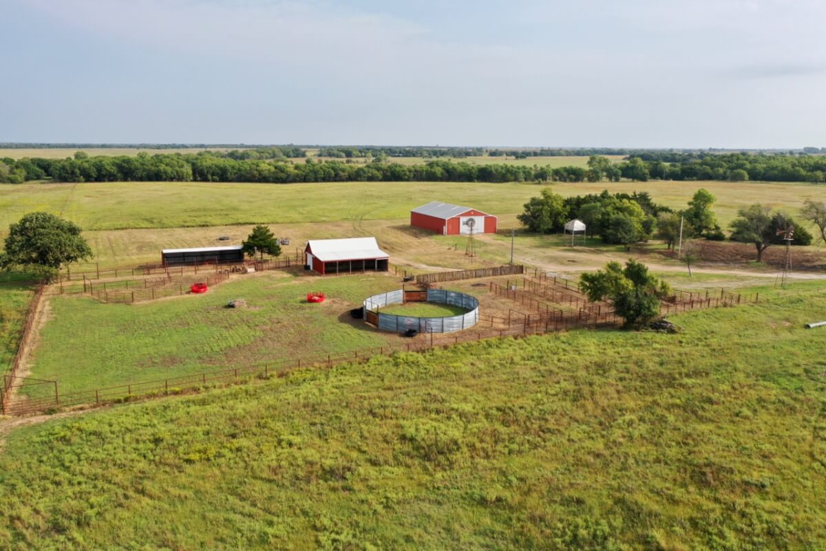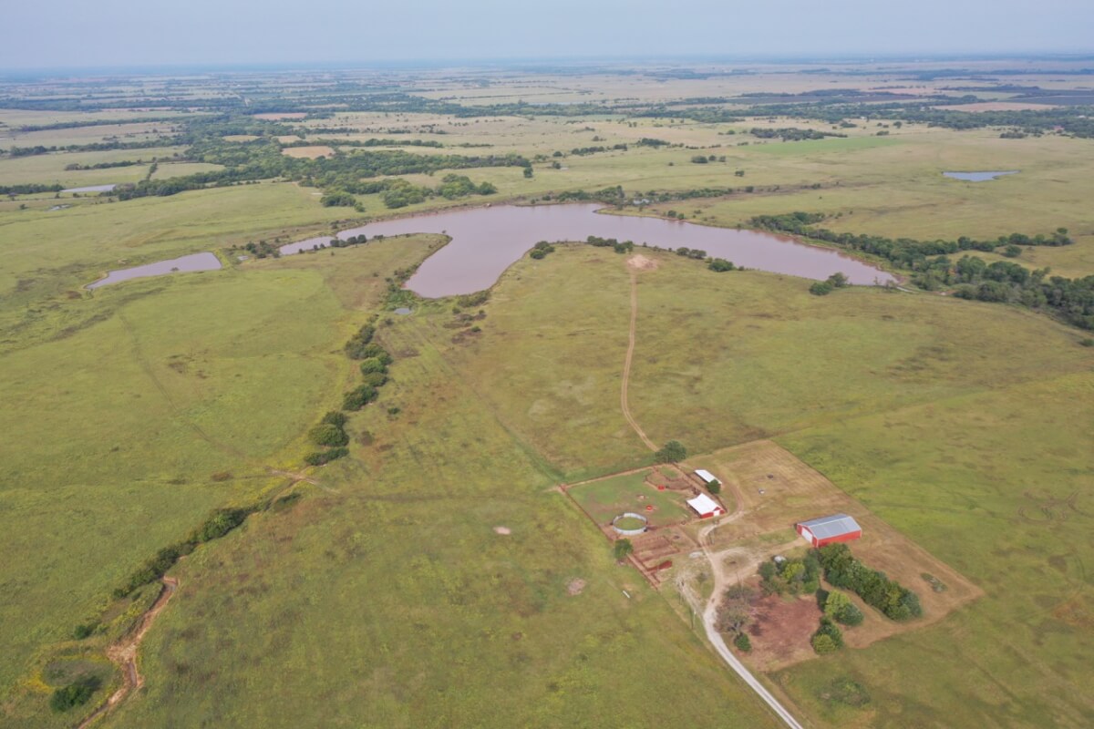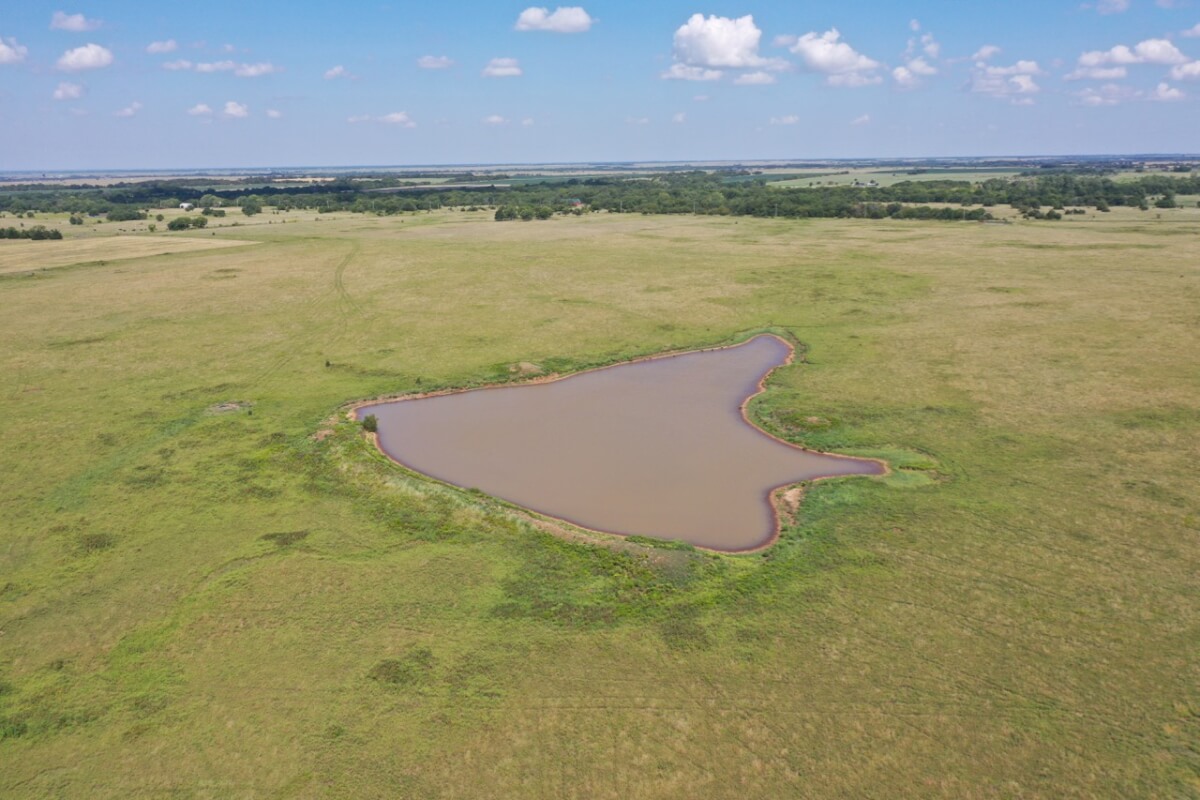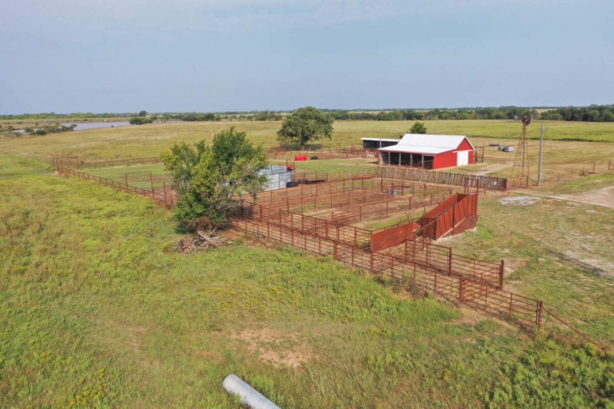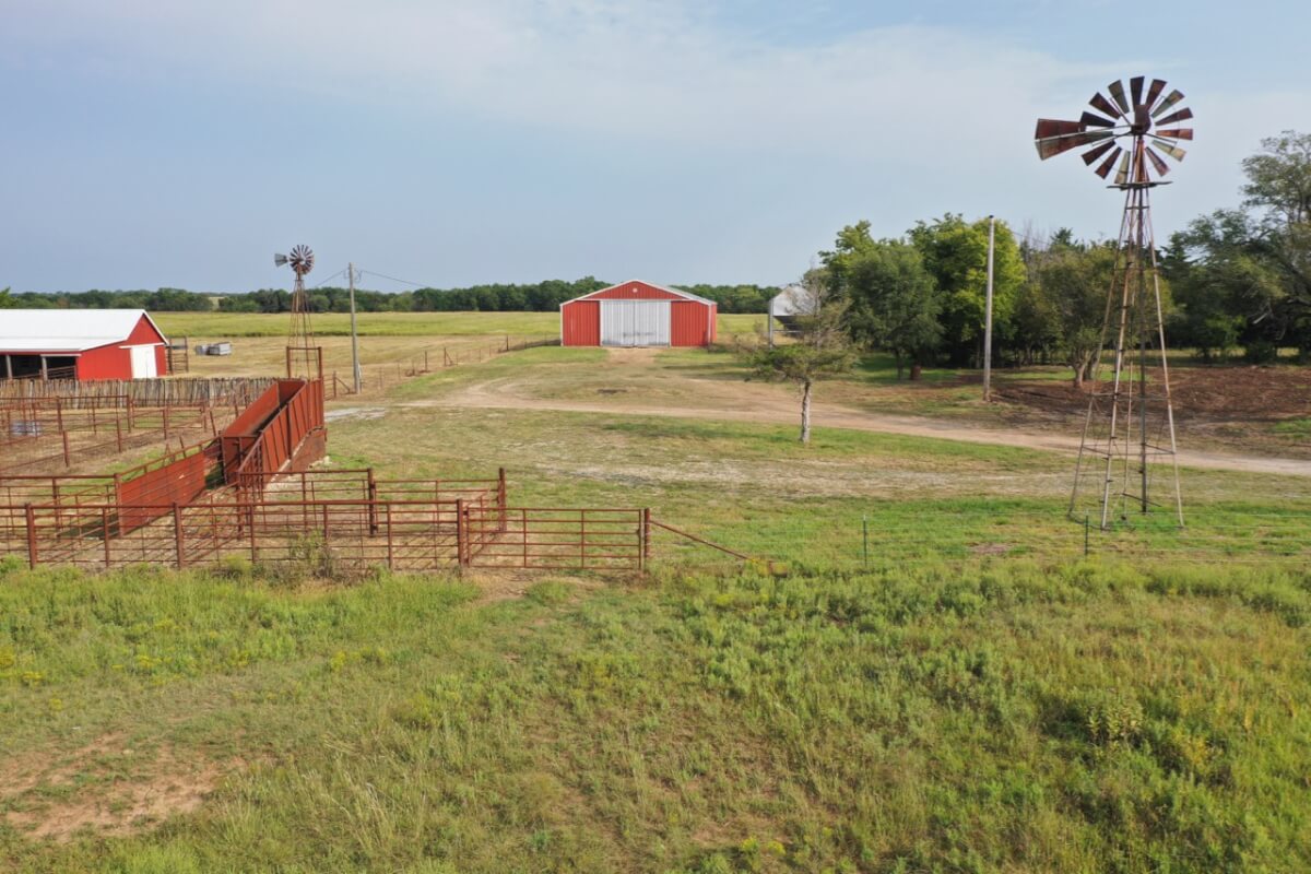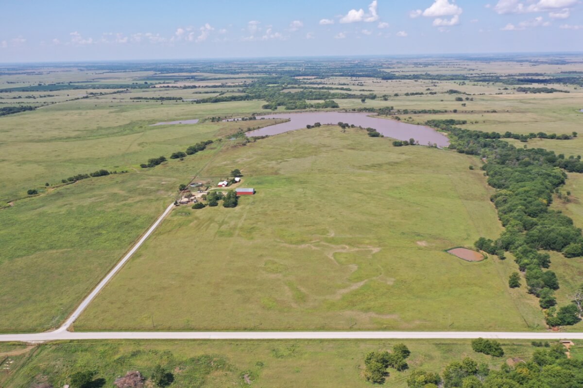 PROPERTY DESCRIPTION: 923+- acres of good quality Kansas Flint Hills pasture, timber, 40+- acre watershed lake, 9 stock ponds, creeks, and improvements. There is a good spring in the creek west of the watershed lake. Perimeter fencing and cross fences on the property are nearly all new or like new. This unique opportunity is entirely contiguous with perimeter roadway all around the property, including 1 1/2 miles of blacktop frontage! Improvements include a 72′ x 45′ foot metal building, a livestock barn, calving shed, livestock working pens, active electric, rural water meter, and 2 windmills, all conveniently set up ready for your livestock operation! There is 18+- acres of tillable in the northwest corner of the property. The timber lined creeks running into and out of the watershed lake provide excellent cover for wintering livestock, but also act as natural traffic ways for an abundance of wildlife that includes Kansas Whitetail Deer, turkey, and quail. If you are looking to start or expand a livestock operation or if you want to include income producing land in your portfolio, this property is turnkey.