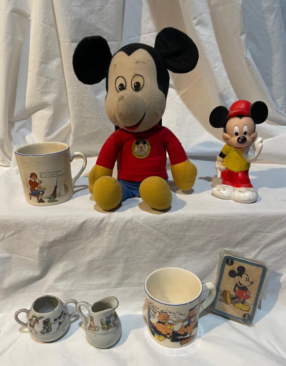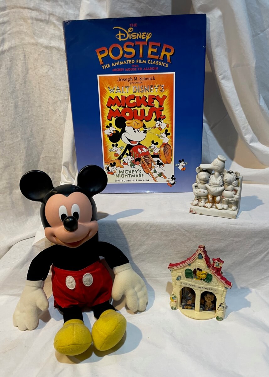 10 Mickey Mouse poster book, bisque toothbrush holder, weather caster, stuffed toy