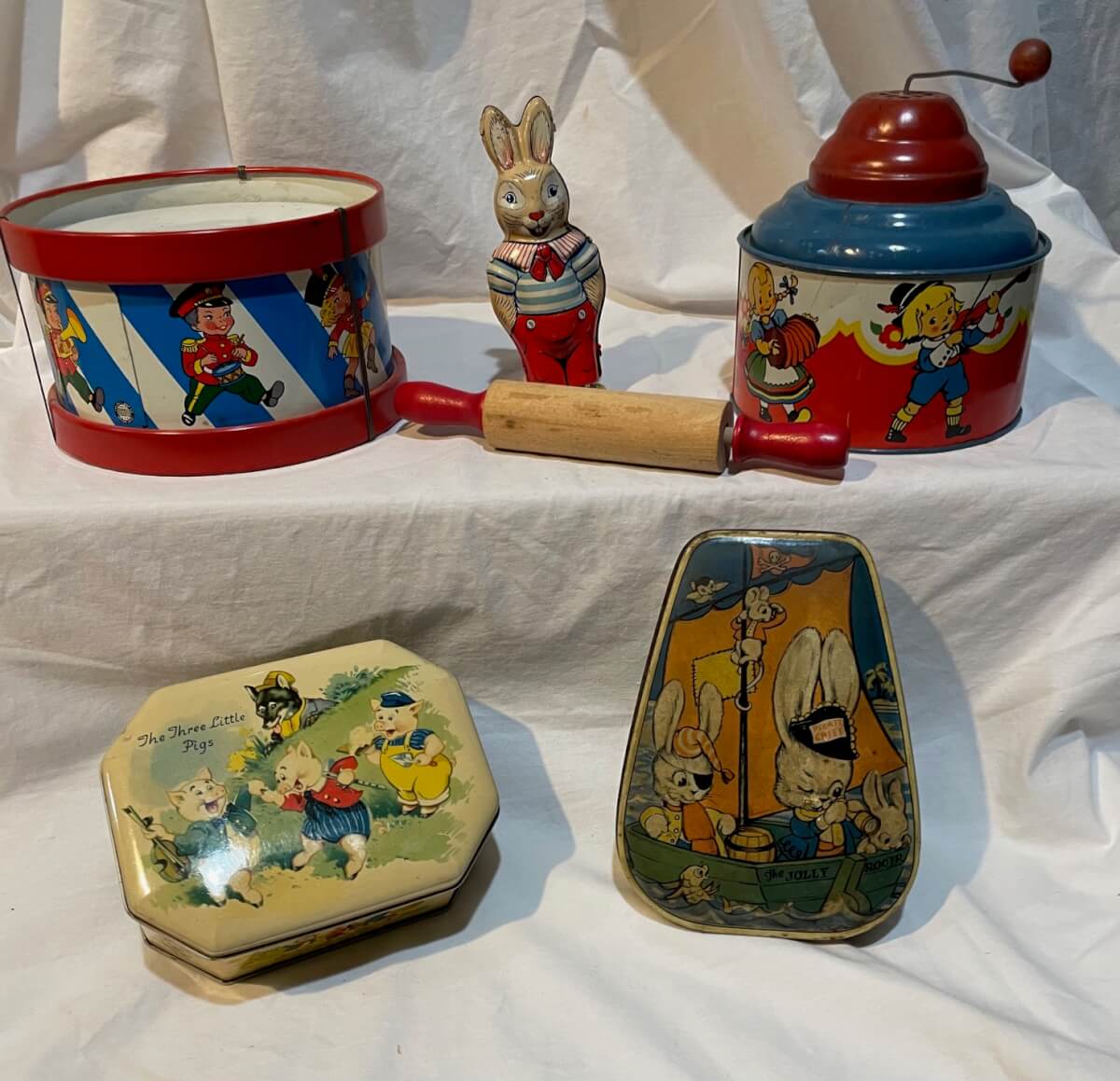 11 Windup bunny, Ohio Art musical, Disney tins, Ohio Art drum