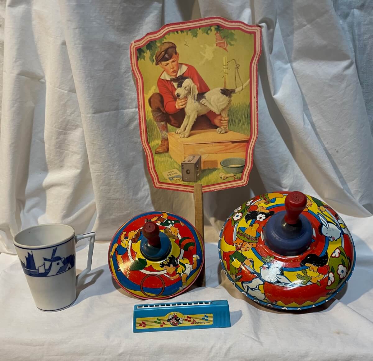 15 2 Ohio Art spinning tops, advertising fan, mickey mouse harmonica, nippon cup