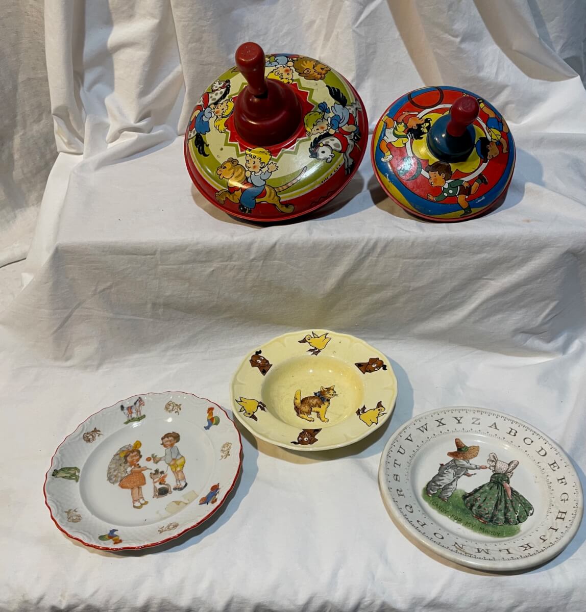 16 2 Ohio Art Spinning tops, 3 baby plates