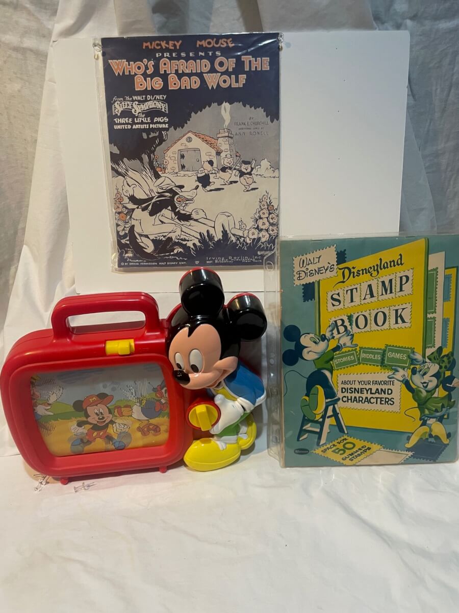 19 Disney sheet music, musical toy & stamp book