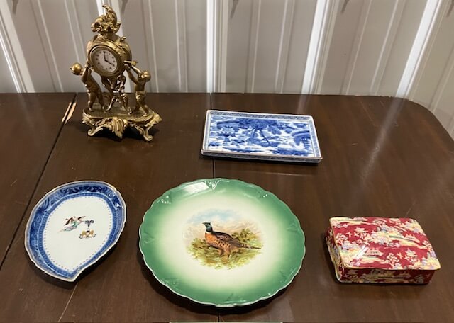 40 gold mantel clock, display only, Pheasant Plate, asst decorative china pcs.