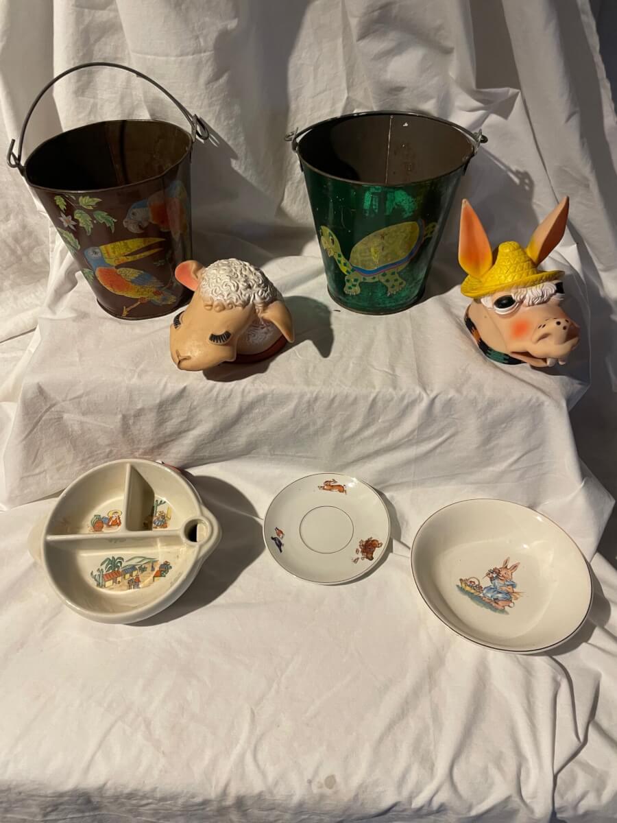 5 Ohio Art Sand Pails & hand puppets baby plates