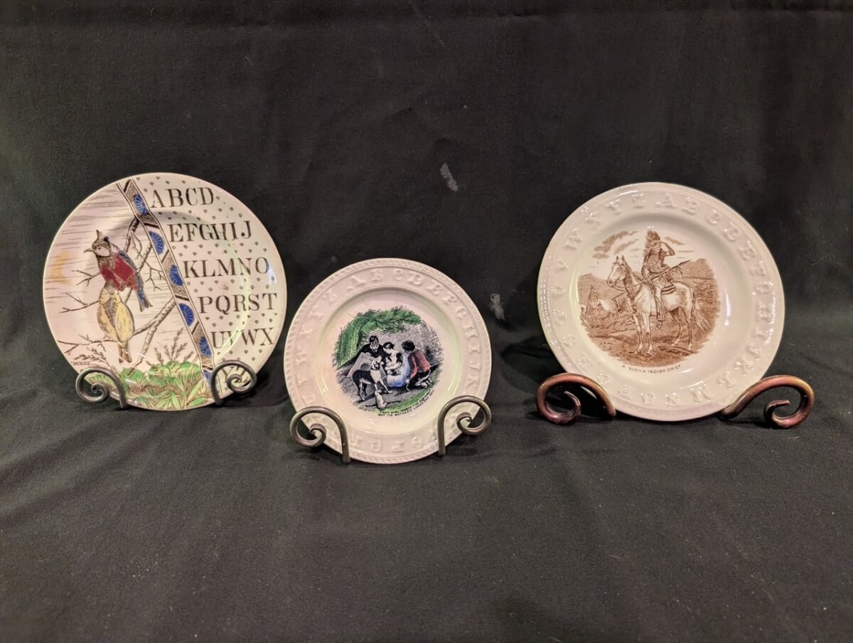 53 Antique ABC Plates, Birds, Sioux Indian Chief, Family with dog