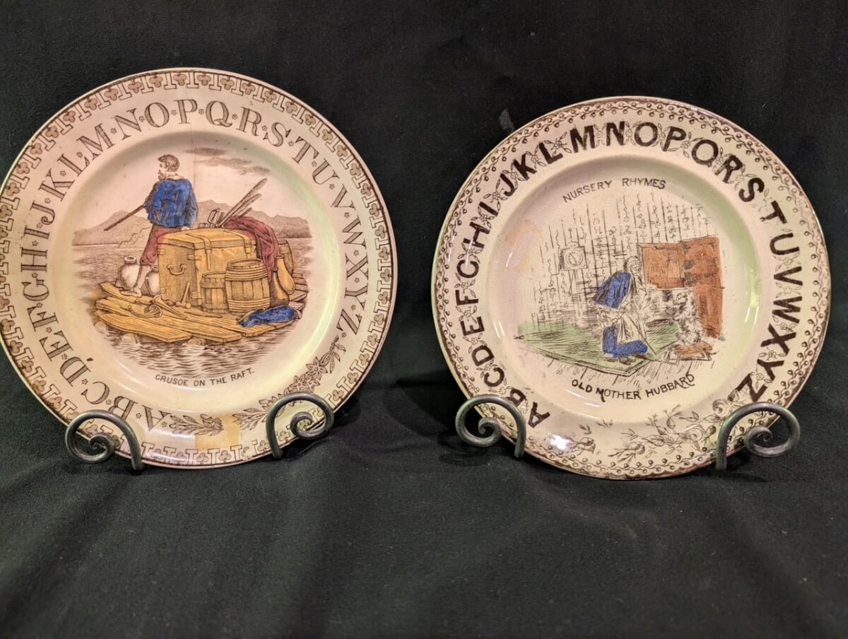 54 2 Antique ABC Plates Robinson Carusoe & Old Mother Hubbard
