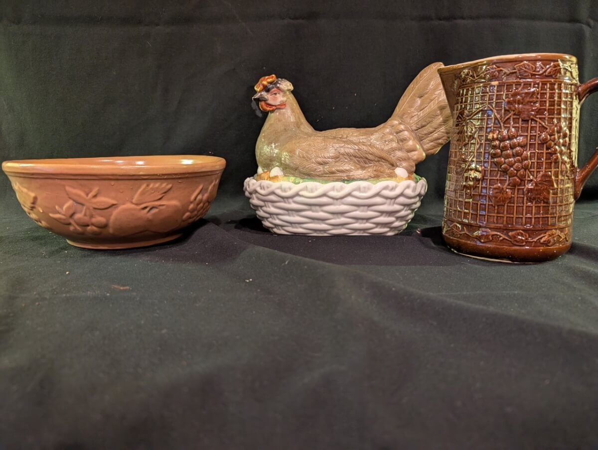 59 Brown Stoneware fruit bowl, 10″ Bisque nesting hen, brown grape lattice stoneware pitcher