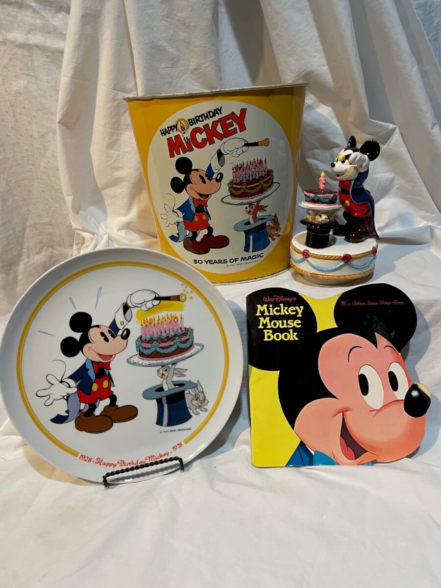 6 Mickey Mouse musical, birthday plate, Trash can & book