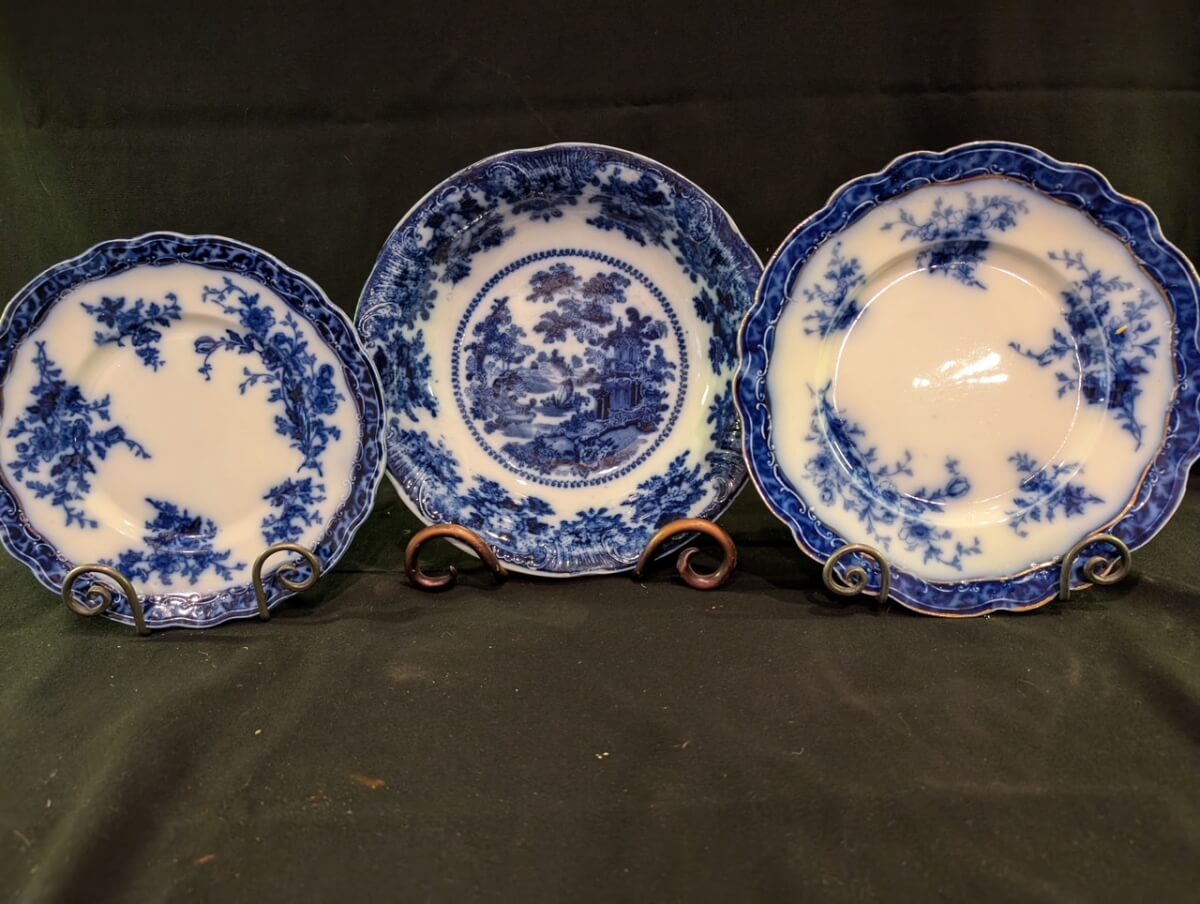 60 Flow Blue bowl 10″, 8 1/2″ Plate, 10″ Plate