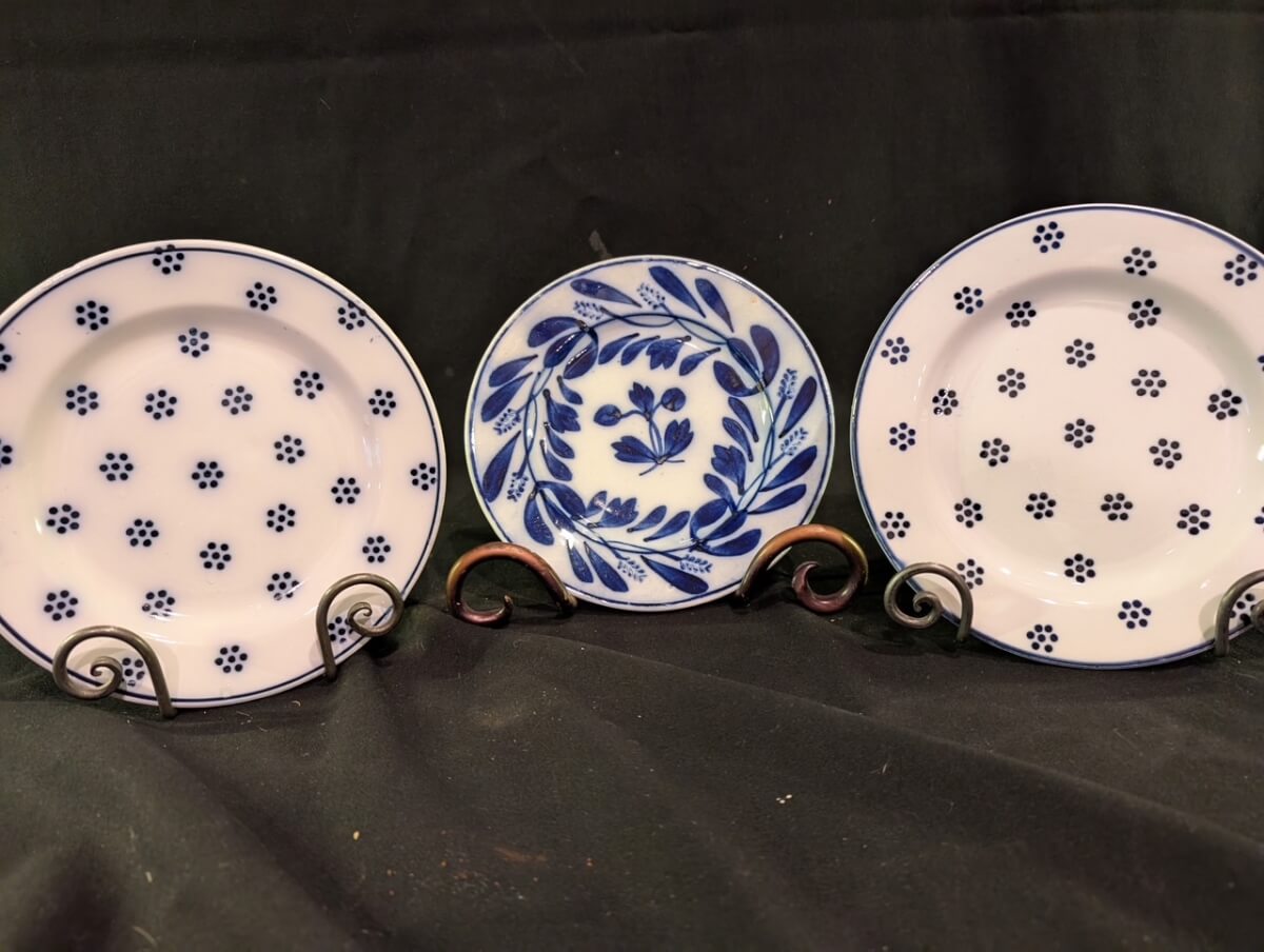 61 Flow Blue 7″ plate, 2 8″ Daisydot plates
