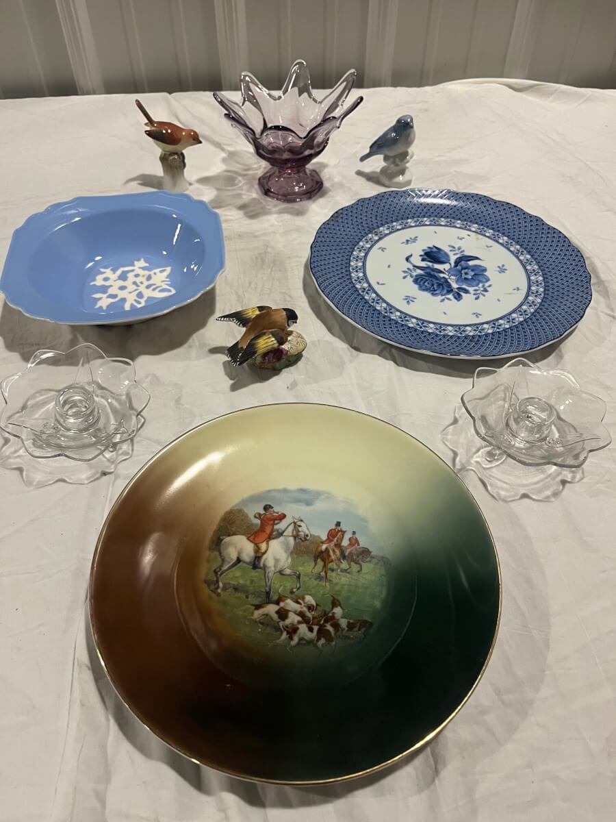 65 Bird figurines, Hunting plate, candlesticks, plate & bowl
