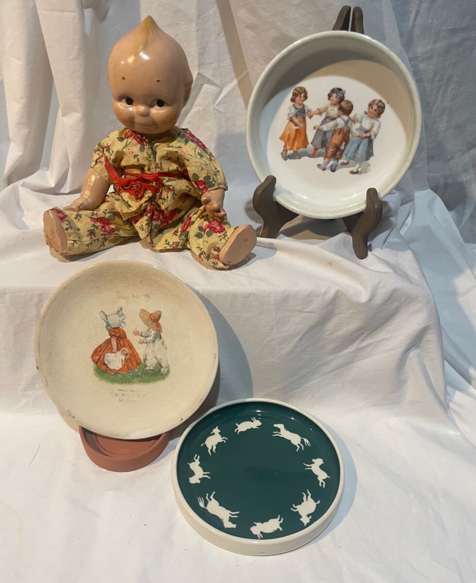 66 1920’s composite kewpie doll, 3 asst. baby plates