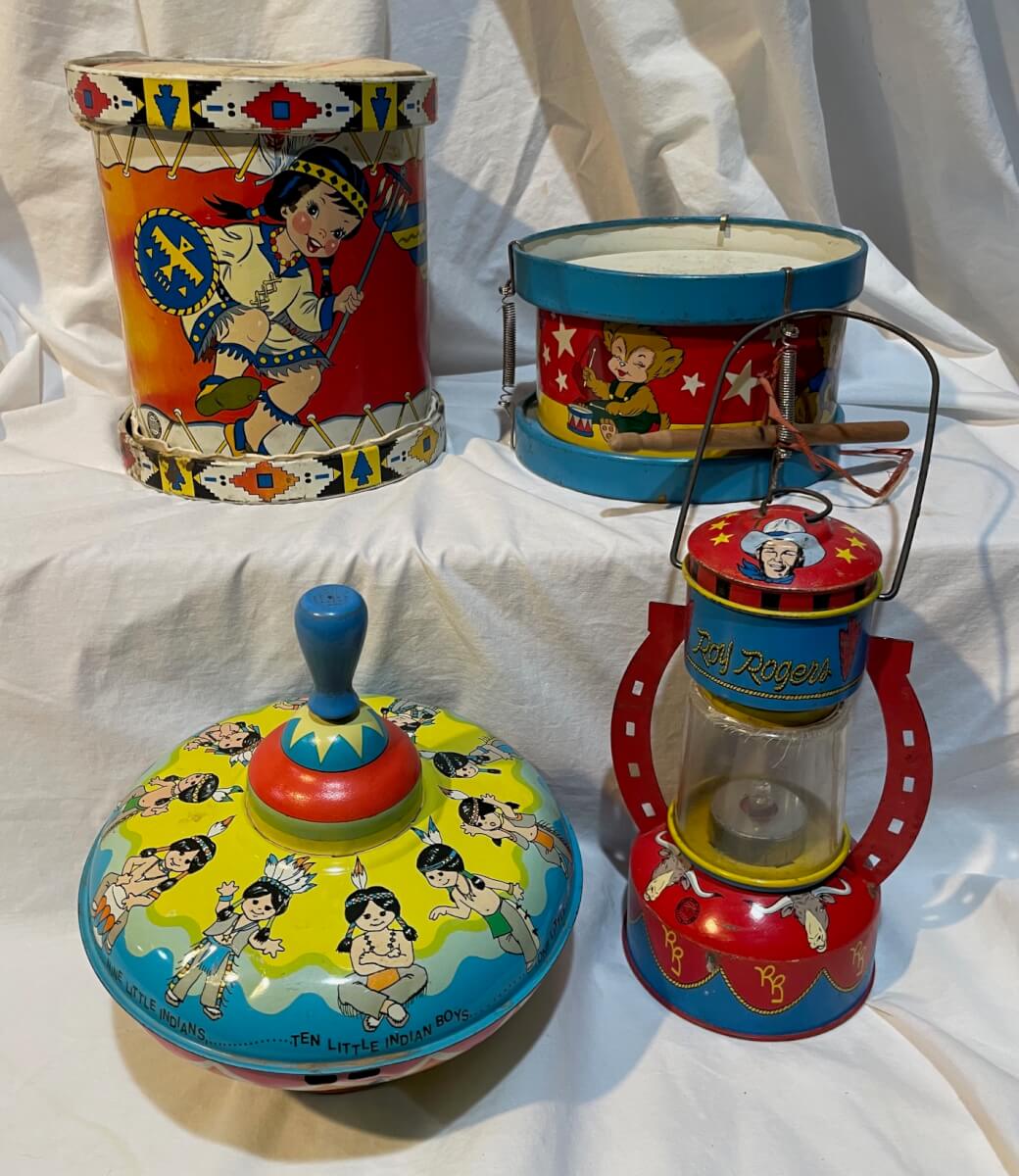 7 Ohio Art Drum, spinning top, Roy Rogers lantern, Drum