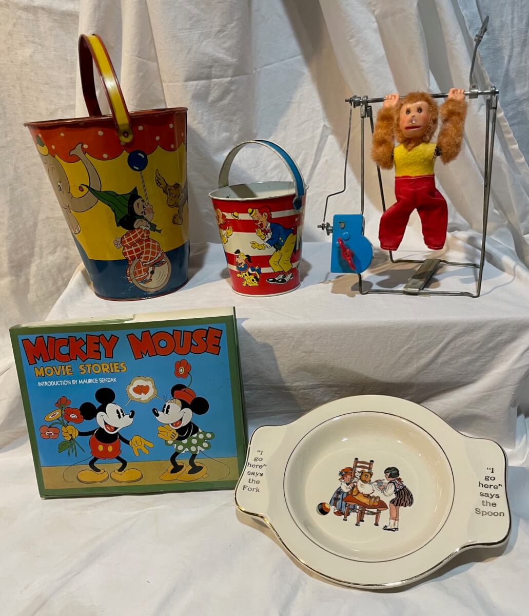 8 Ohio Art circus sand pail, baby plate, windup monkey & Mickey mouse book