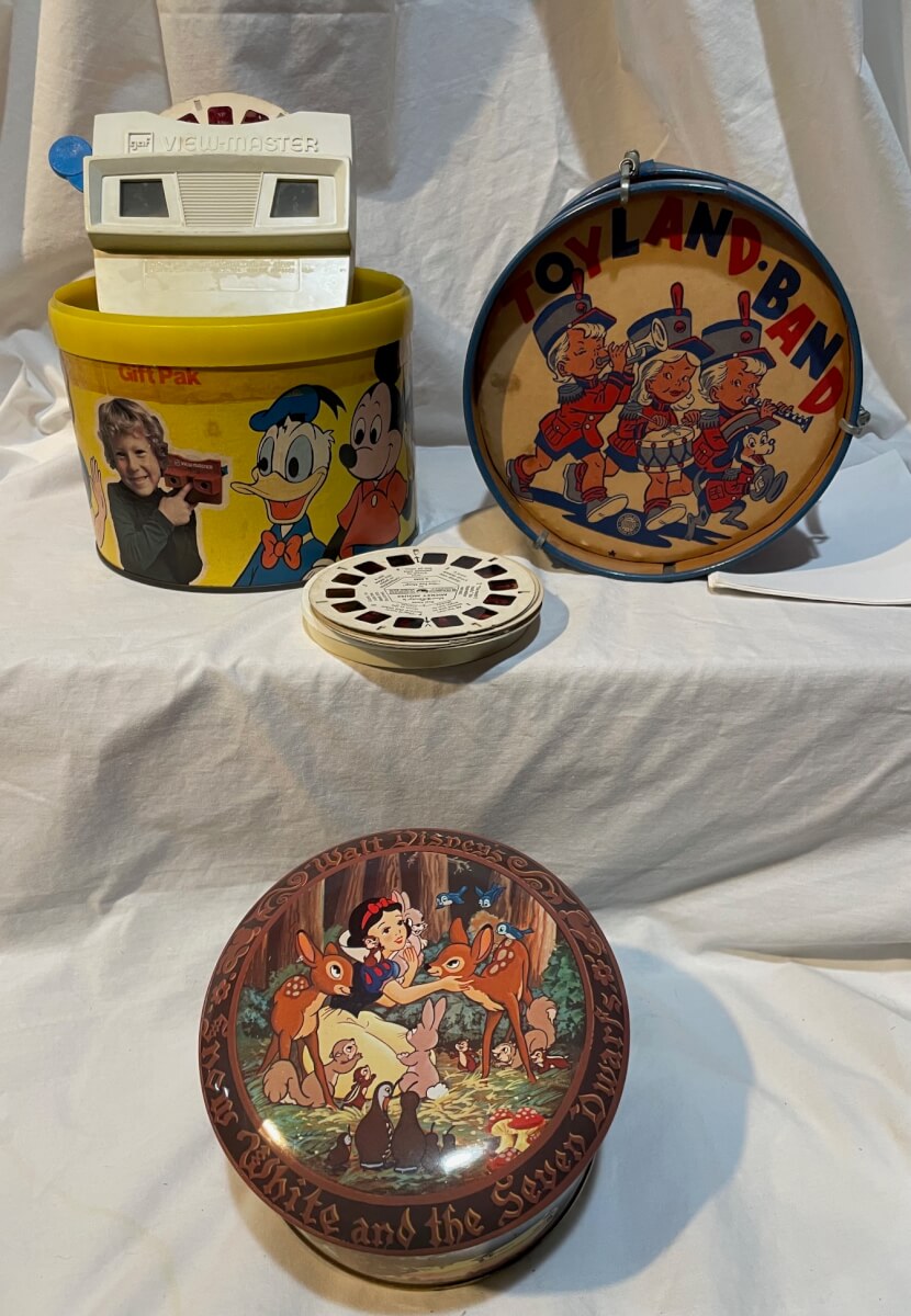 9 Disney view finder, Snow White tin, toy drum