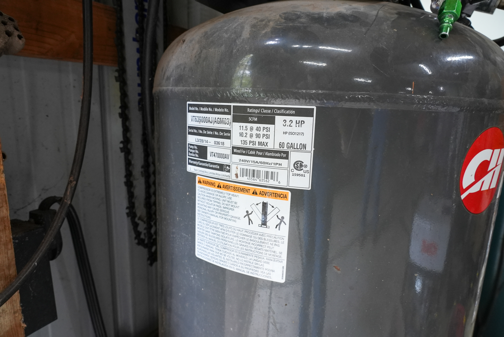 Campbell Hausfeld Air Compressor 3.2 Hp, 60 Gallon