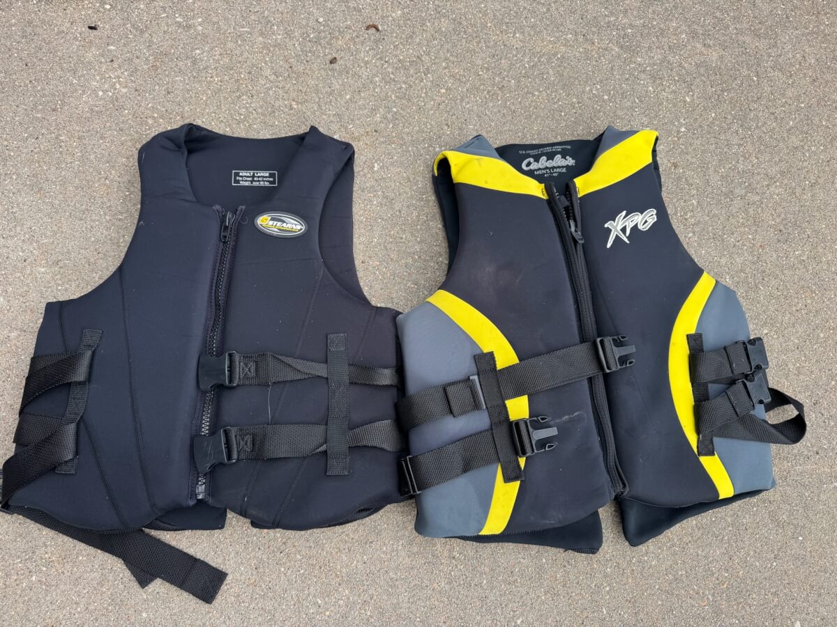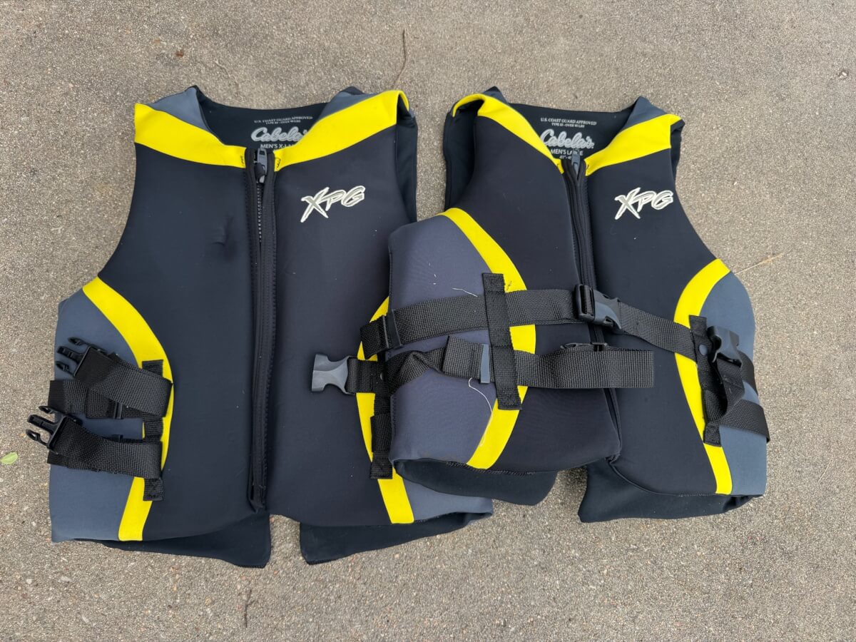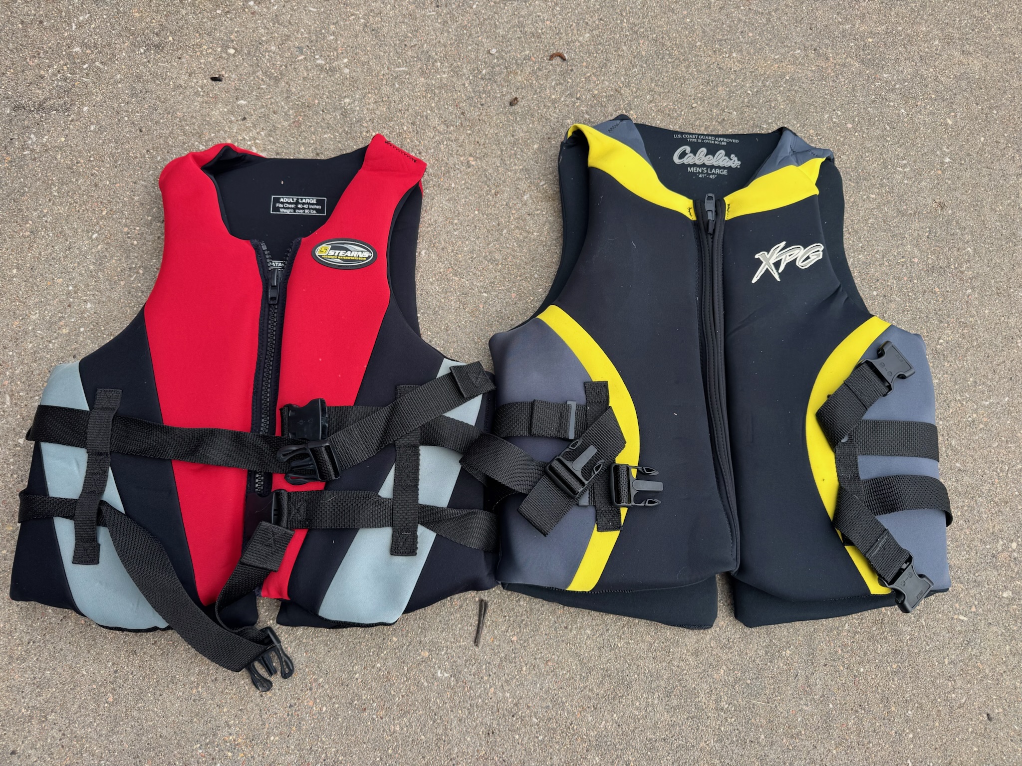 129 1 Adult Large Stearns Life Vest (Red) 1 Mens Large Cabela’s Life Vest (Yellow)