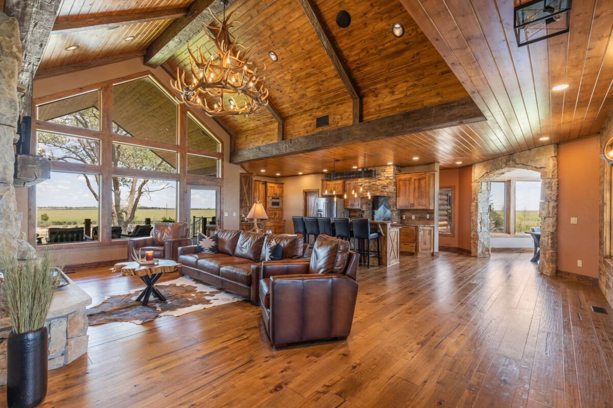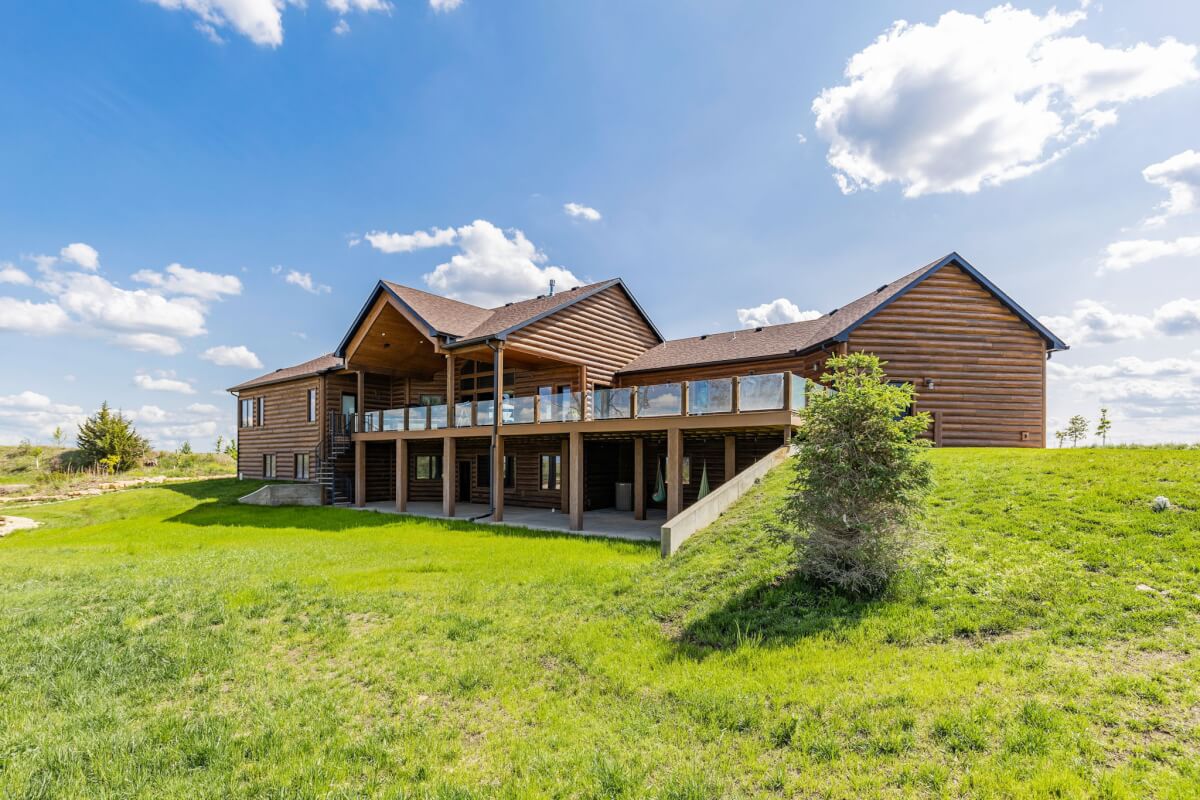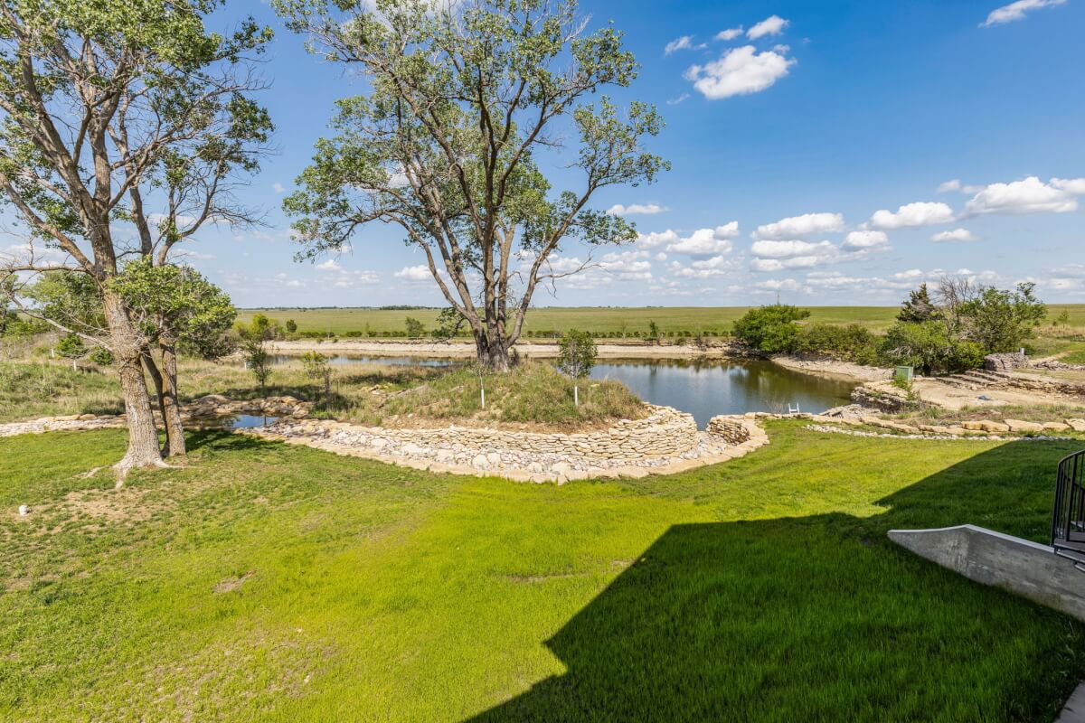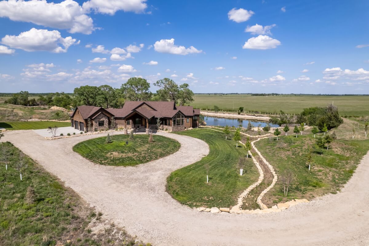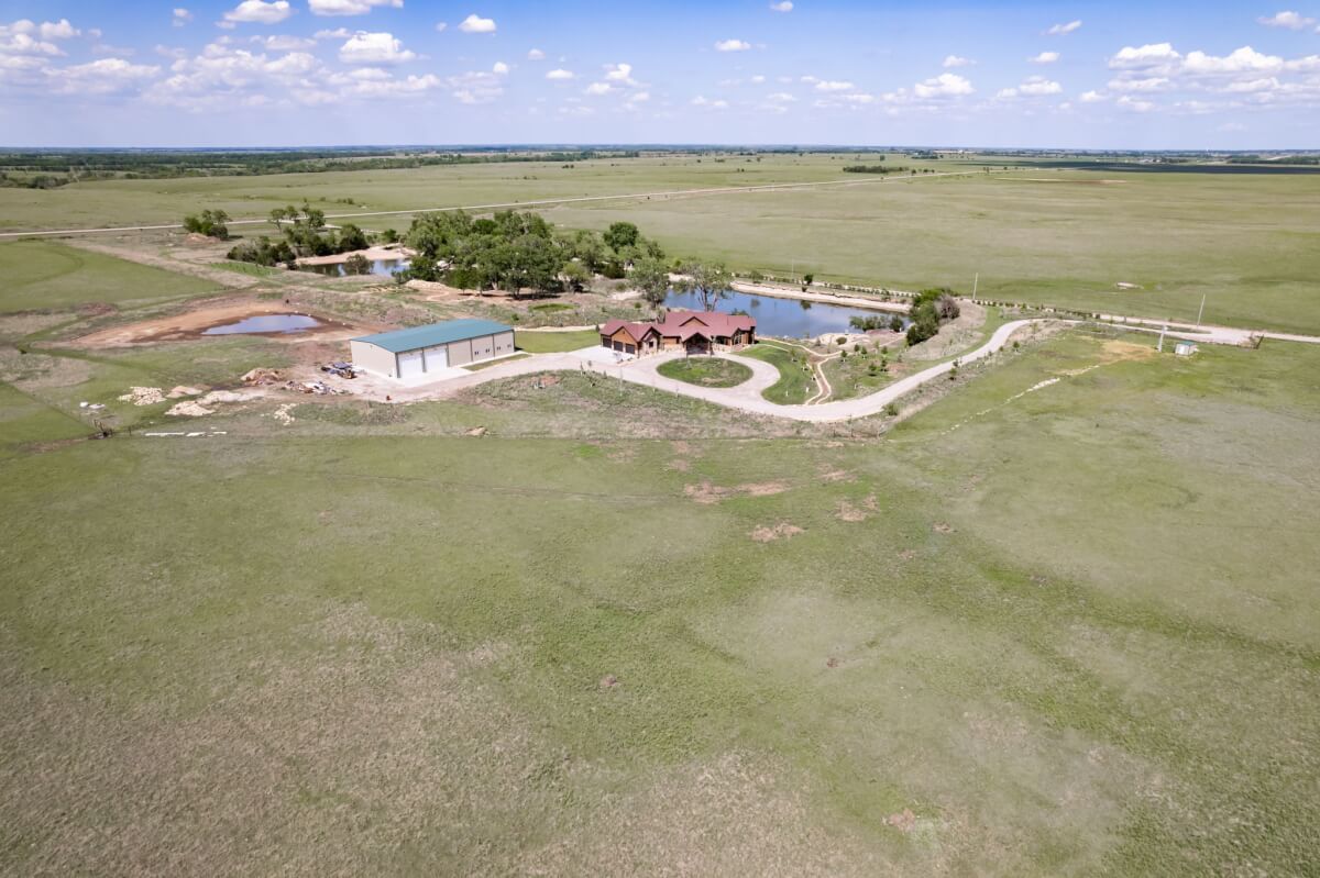 HOUSE & GENERAL DESCRIPTION: 5 Bedroom 4.5 Bath home on 154 acres east of Leon in Butler County, Kansas with a beautiful home, tremendous shop building, rock quarry lake, cabin, ponds, and pasture just 30 minutes east of Andover, Kansas. The house was completed in 2022 and has 2810 square feet of finished living area on the main level plus a full finished basement. Additional rooms include an office, craft room, theatre/workout room, sun room, safe room, main floor laundry, mud room and pantry. There is an attached 3 car oversized garage Large bedrooms with oversized closets in each. Very large oversized master bedroom closet with built-in drawers and adjustable hanging racks. “Car Wash” master shower with body sprays, hand spray, shower head, ceiling waterfall PLUS heated tile floor in master bathroom. You will love the incredible dining room with native stone archway, large windows on 3 sides, perfectly positioned and angled to capture the beautiful country sunrise, sunset, incoming storms, native pasture, and Colorado-inspired landscaping all in 1 room. Truly one of a kind space with unmatched views of the ranch, any time of day. One of many features of the basement is the unique and rustic custom wet bar. It includes a stainless fridge, ice maker, sink, glass cleaner, wine racks, ample cabinet storage, magnetic child safety locks, LED accent lighting, wood slab bar counter, lower granite counter. There is an amazing composite back deck with glass panel handrails to maintain scenic views of the backyard, Colorado cobblestone creek, and rock quarry lake.A large covered roof is over the sitting area and grilling station to enjoy the view in any weather, with a large uncovered area to enjoy your time in the sun. Wires stubbed out on deck for future TV. The ultimate custom grilling station on the deck has the XL Big Green Egg, Yoder YS640S wifi pellet smoker, large Blackstone flat grill, propane side burner, and ample stainless storage cabinets. Propane supply is plumbed directly from the house so you never have to replace propane bottles.