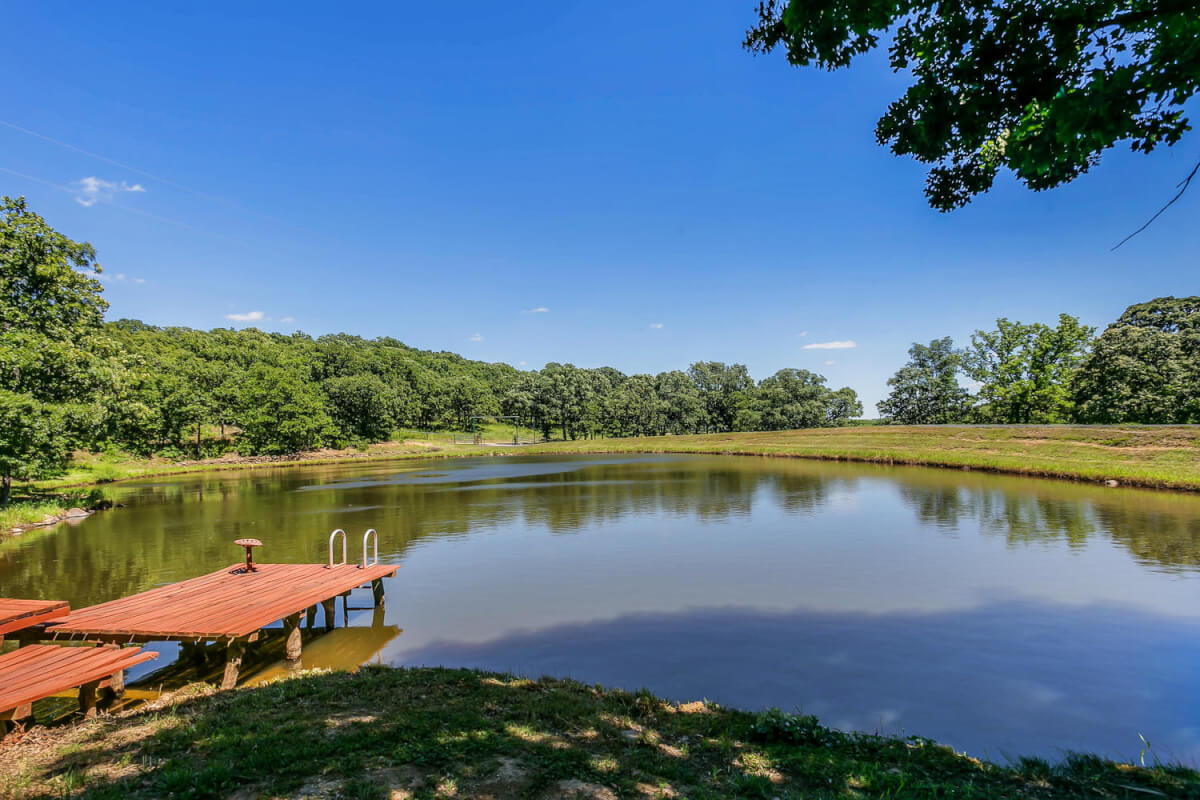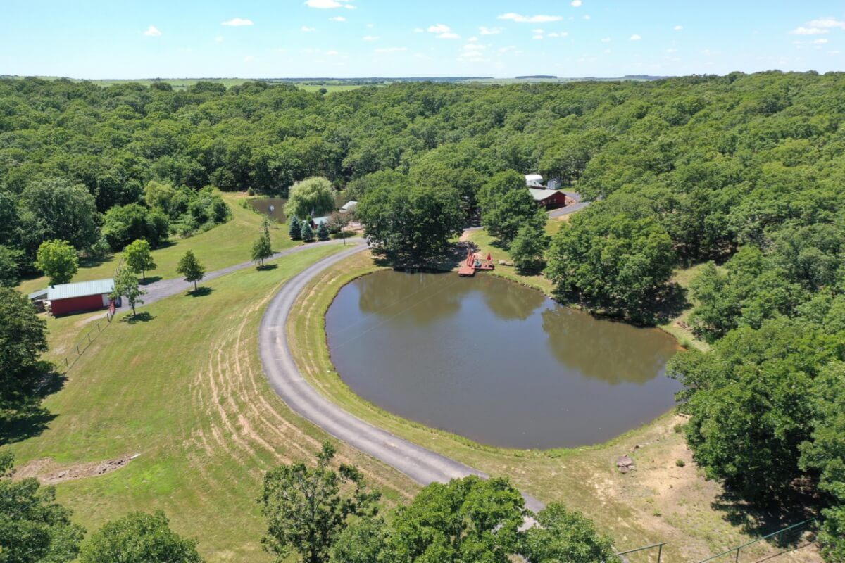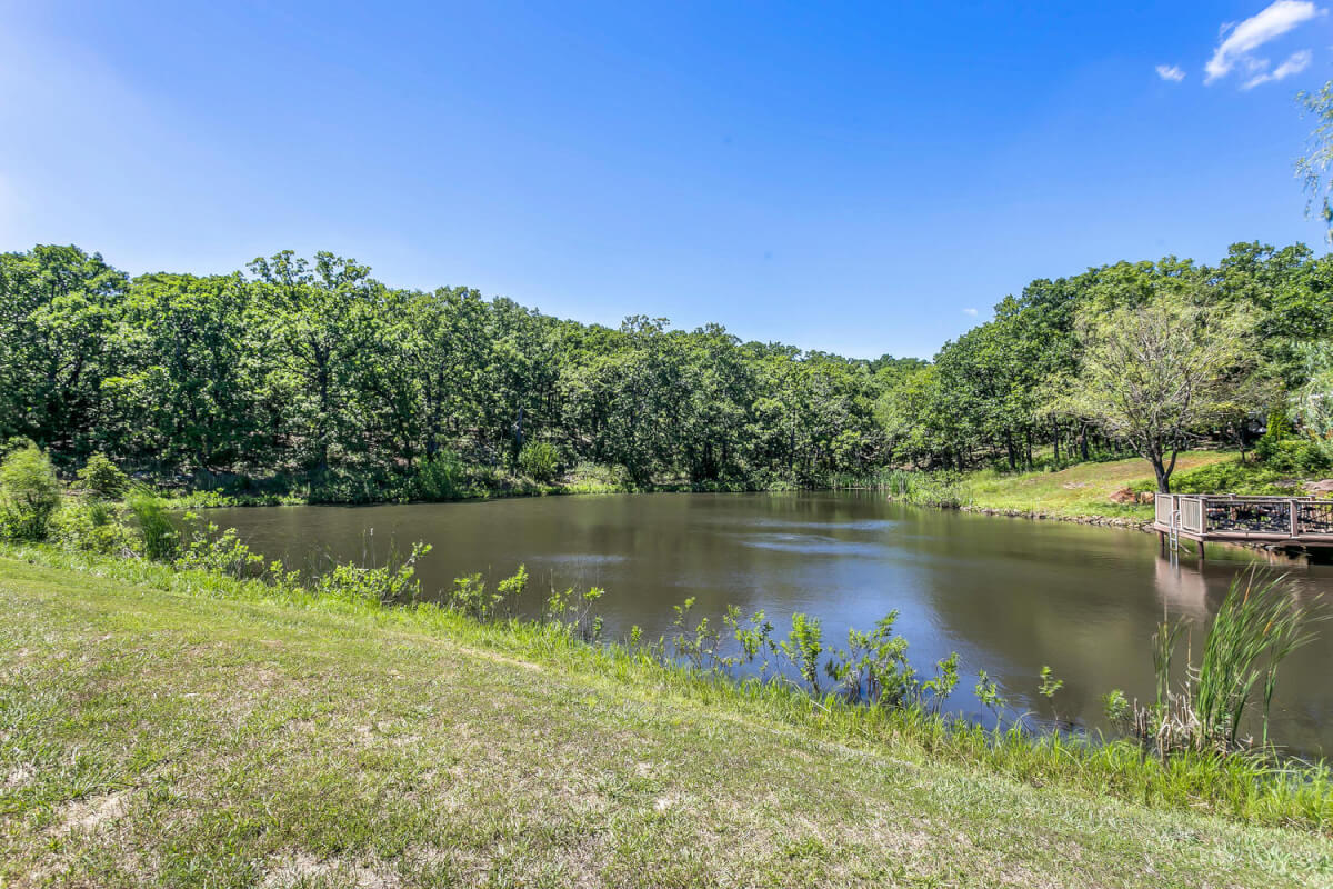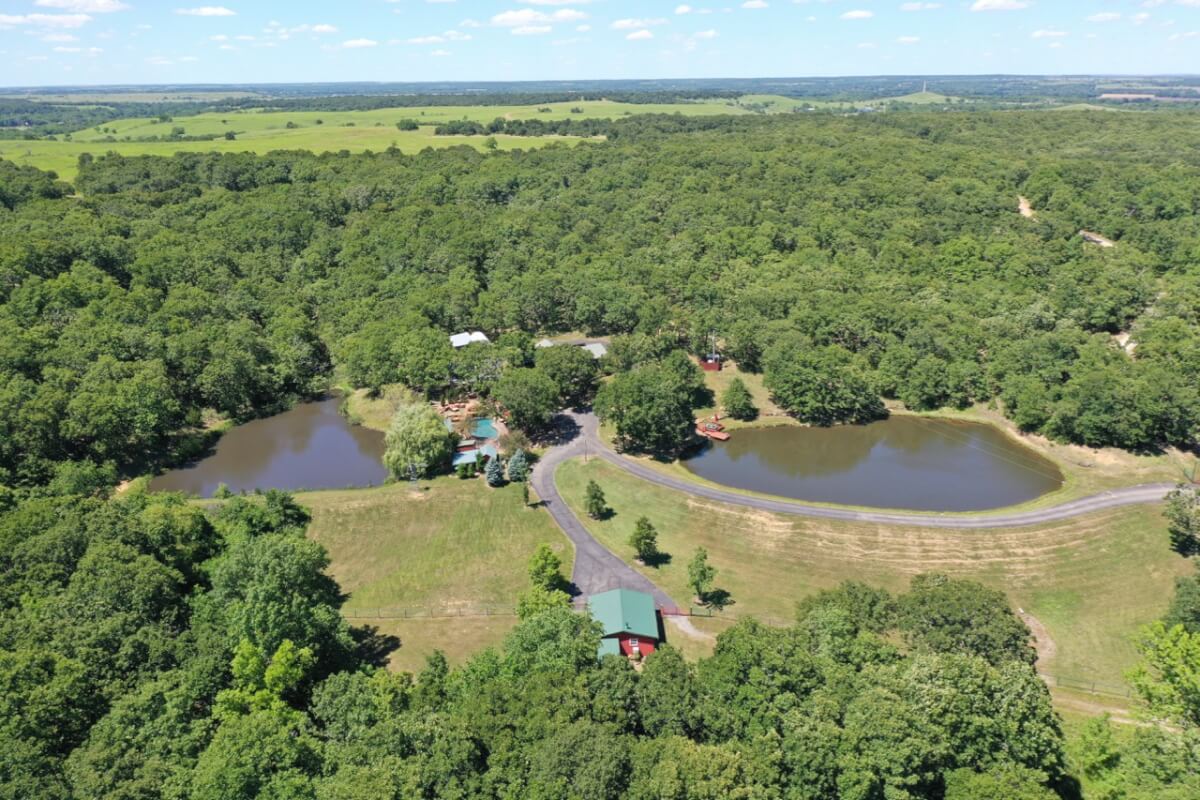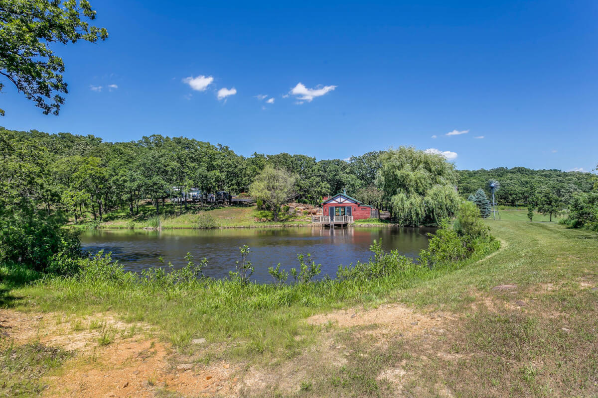 PROPERTY DESCRIPTION: 960+- acres of scenic retreat in the heart of the rolling hills of southeast Kansas. The main cabin is 1384 square feet currently set up with 3 bedrooms plus an additional bunk room. Furnishings, decor, and updates are all very tasteful and attractive. Enjoy both the interior and exterior fireplaces on a cool evening or during the heart of winter. Other amenities include steam shower, backup generator, reverse osmosis water filtration, and the list goes on and on!! The pool house has a native limestone wood burning fireplace, full bath, and an amazing view the native stone infinity pool, hot tub, and fishing pond.  Step right out the back door onto the dock and fish or jump in for a swim, then step into the outdoor shower to rinse off! Several additional buildings offer storage for vehicles, ATV’s, and gear. With two nice fishing ponds directly outside your front door, you won’t have an excuse not to fish!