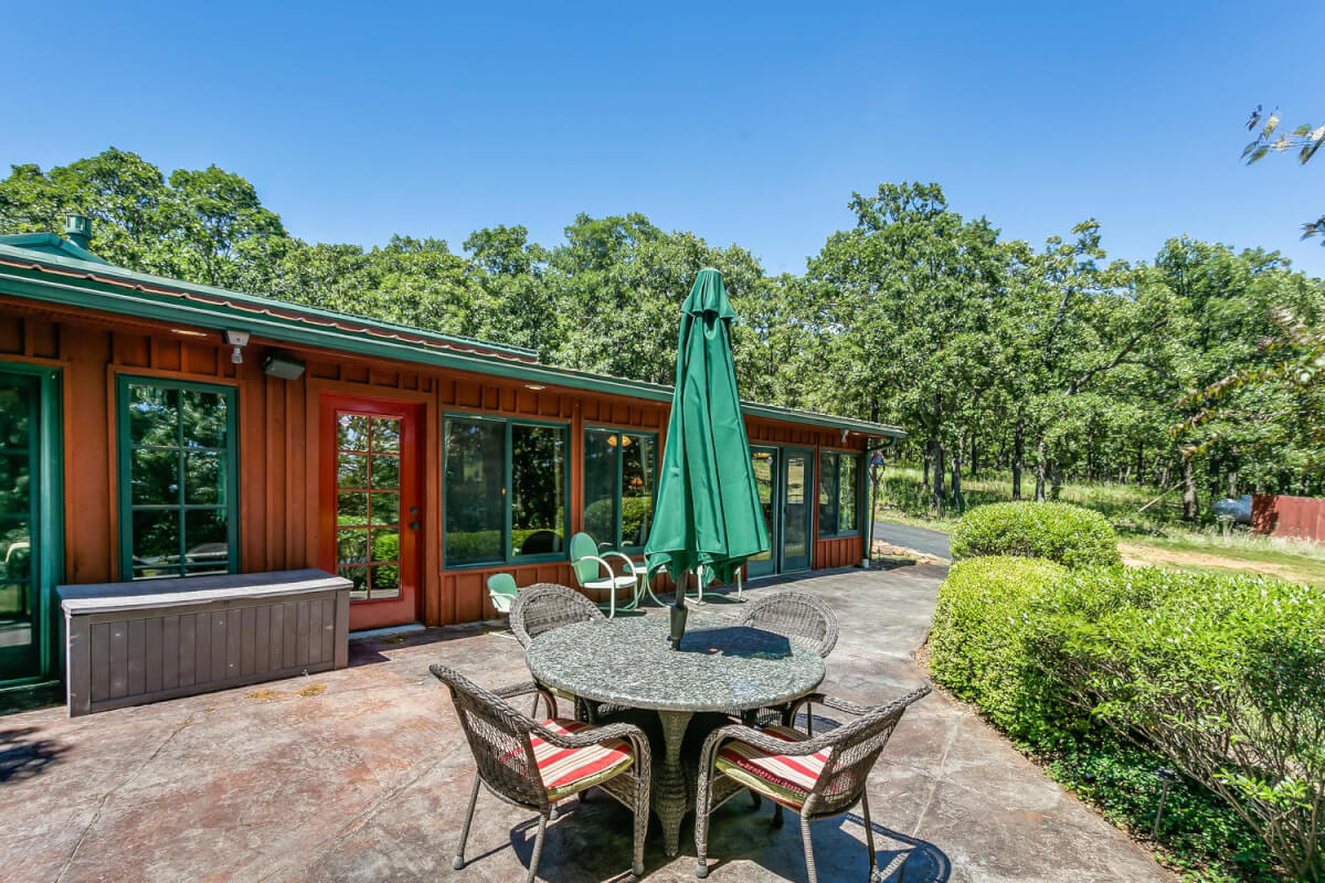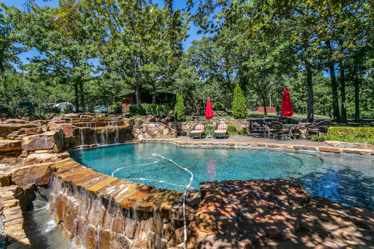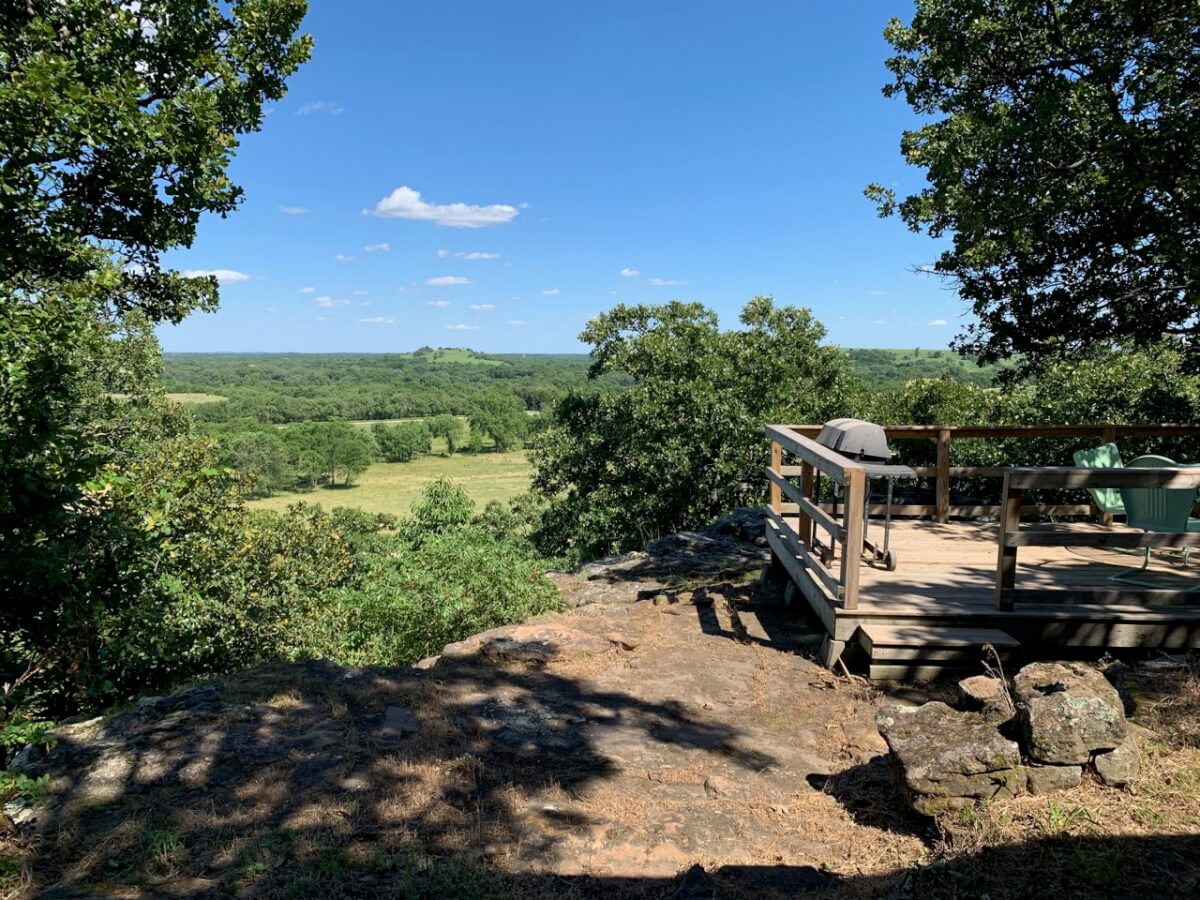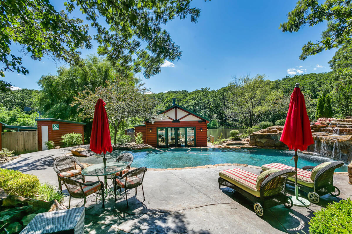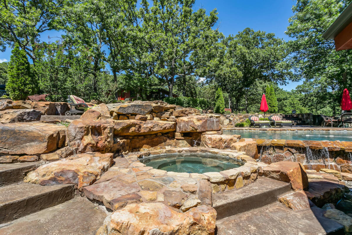 PROPERTY DESCRIPTION: 960+- acres of scenic retreat in the heart of the rolling hills of southeast Kansas. The main cabin is 1384 square feet currently set up with 3 bedrooms plus an additional bunk room. Furnishings, decor, and updates are all very tasteful and attractive. Enjoy both the interior and exterior fireplaces on a cool evening or during the heart of winter. Other amenities include steam shower, backup generator, reverse osmosis water filtration, and the list goes on and on!! The pool house has a native limestone wood burning fireplace, full bath, and an amazing view the native stone infinity pool, hot tub, and fishing pond.  Step right out the back door onto the dock and fish or jump in for a swim, then step into the outdoor shower to rinse off! Several additional buildings offer storage for vehicles, ATV’s, and gear. With two nice fishing ponds directly outside your front door, you won’t have an excuse not to fish!