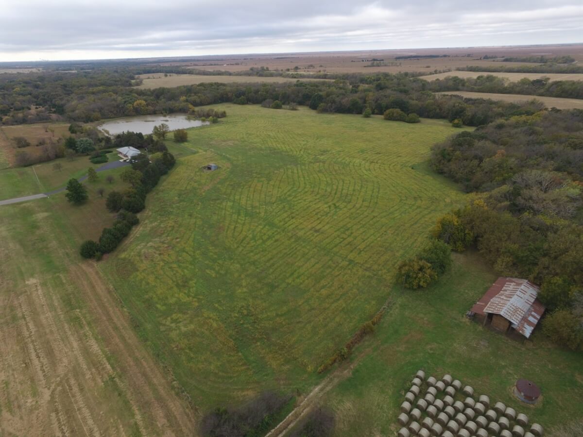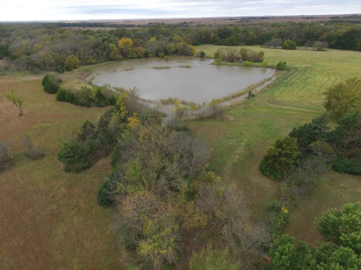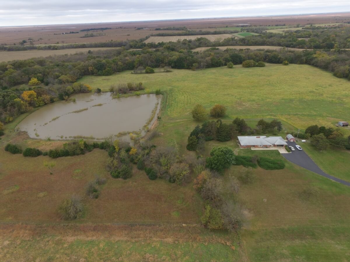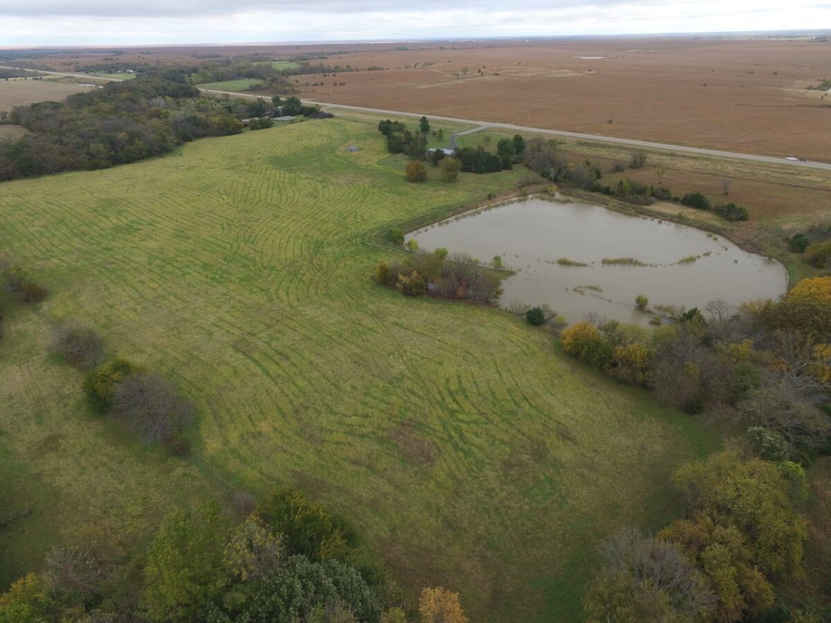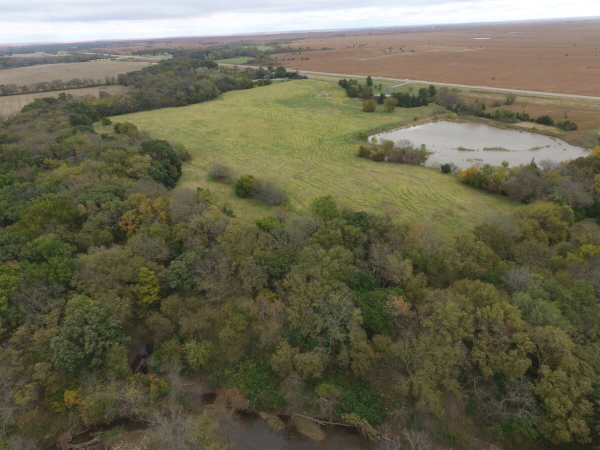 LAND FEATURES: This beautiful property has 50+- acres consisting of a large pond, creek, the West Branch of the Walnut River, tillable bottom ground currently planted to brome, and heavy timber. The timber lined creek has large mature Oak, Walnut, & Sycamore trees, among many other varieties. Kansas Whitetail Deer and Turkey are abundant.