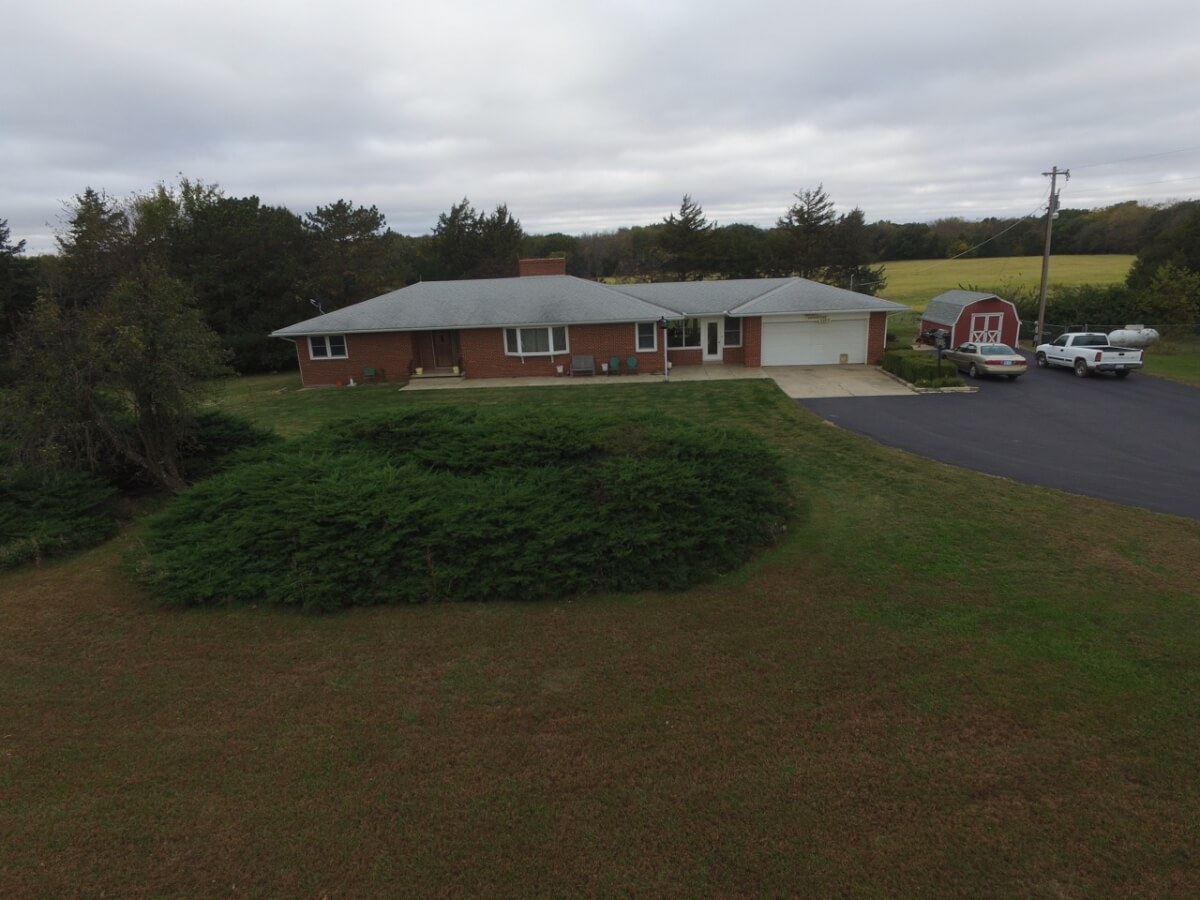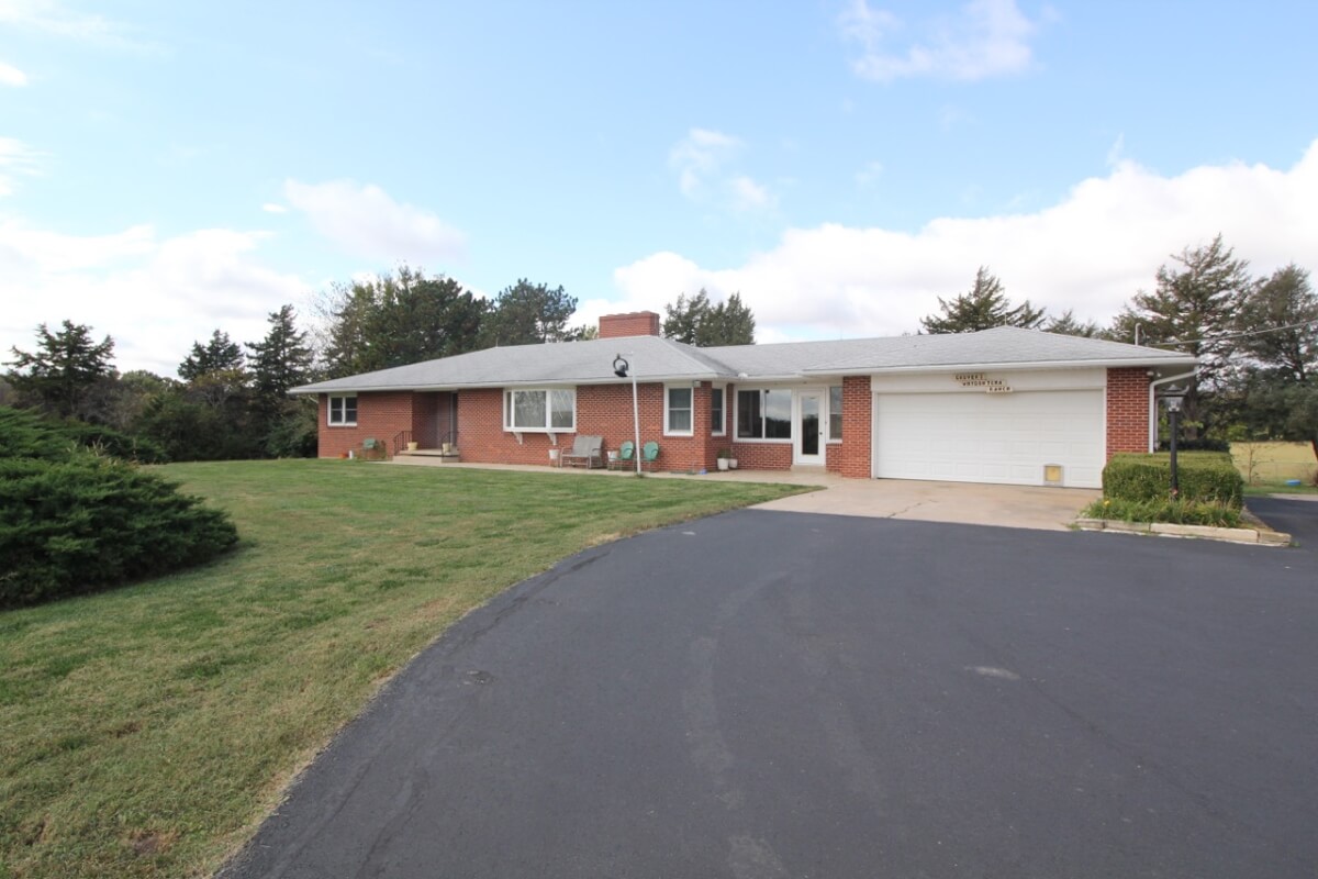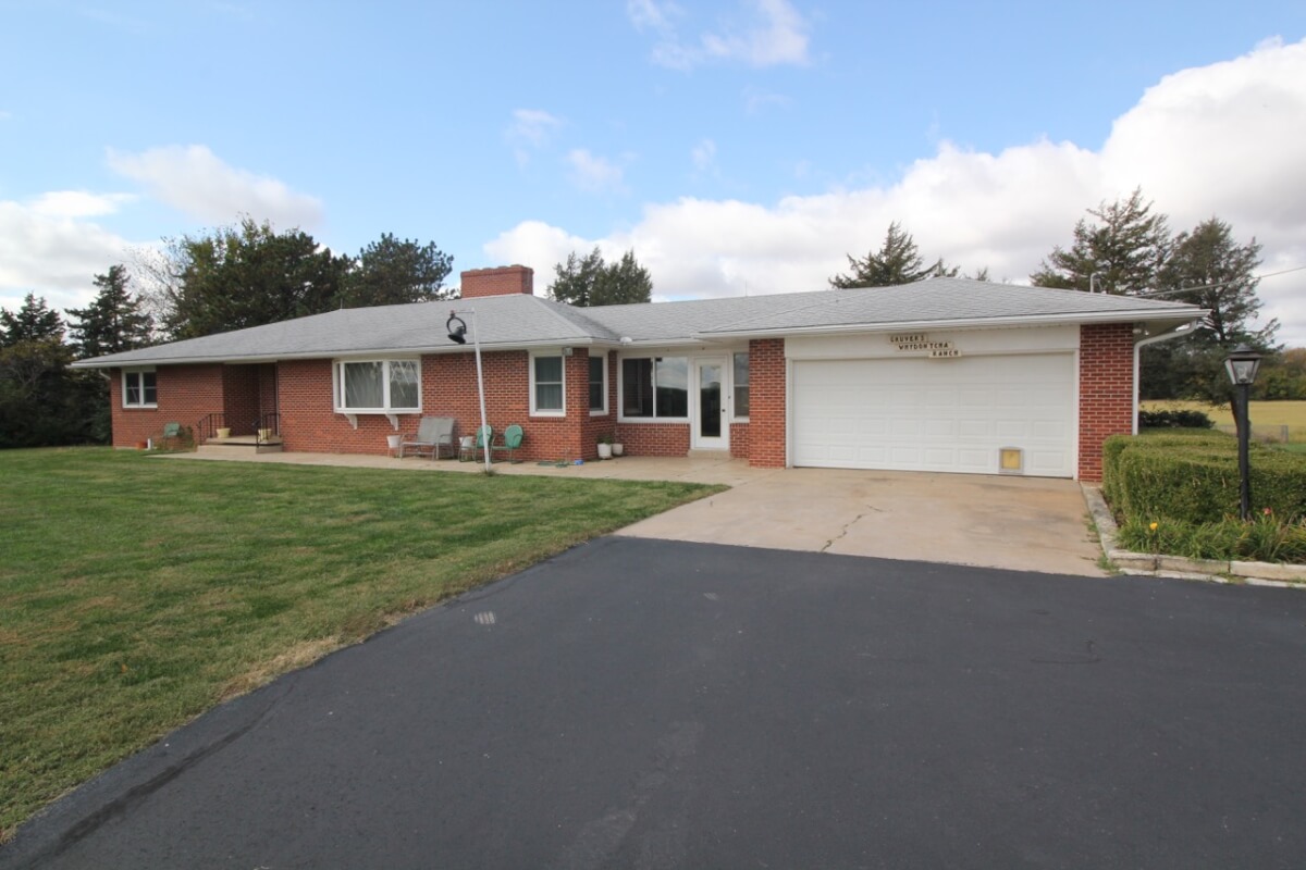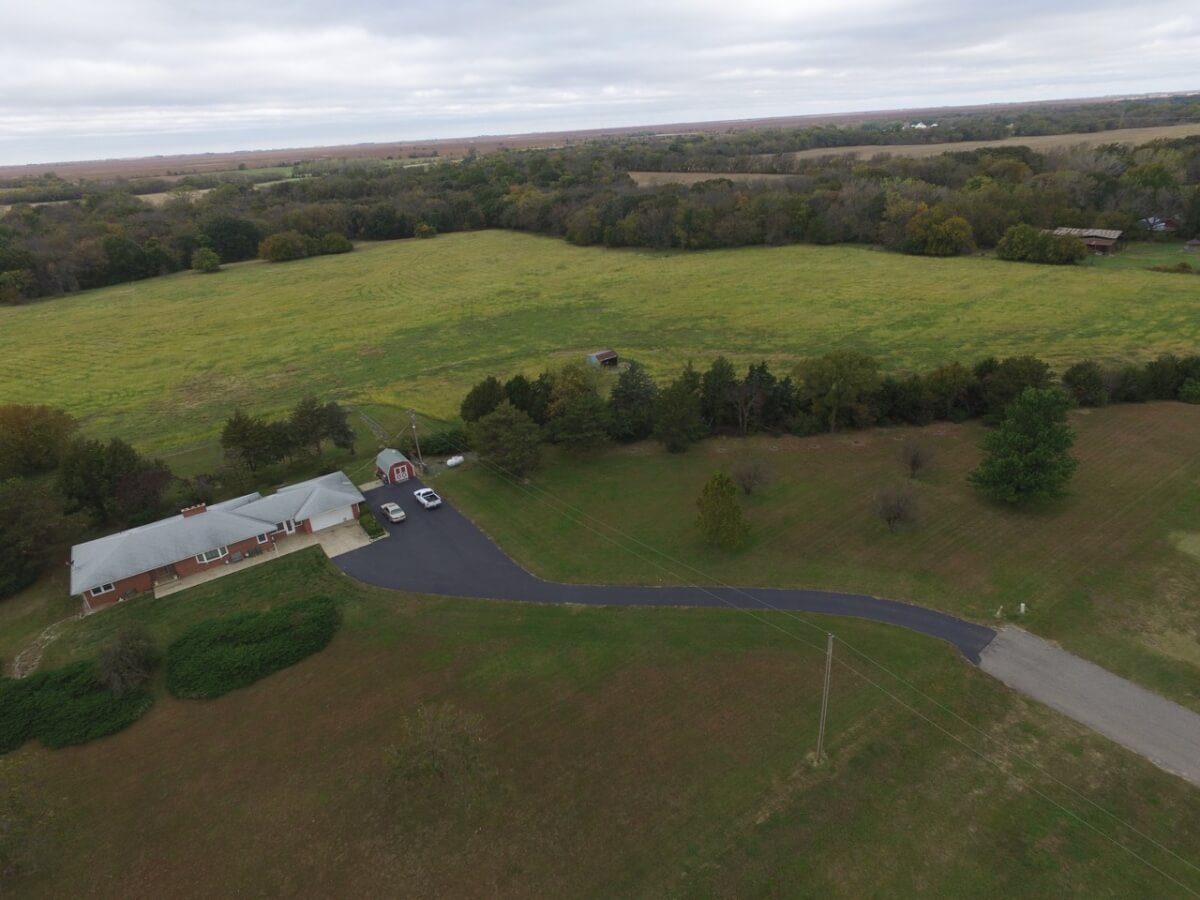 IMPROVEMENTS: Great all brick ranch style home on 50+- acres just north of El Dorado, Kansas with blacktop frontage. Interior amenities include 3 fireplaces, 3 bedrooms, 2 bathrooms, living room & formal dining combination, eating area in the kitchen, and an attic fan in the enclosed breezeway. The full basement features a kitchenette and large wide open space. A nice large 2 car attached garage provides good built in storage. Other improvements include a storage building, tools shed, and hay pole barn.