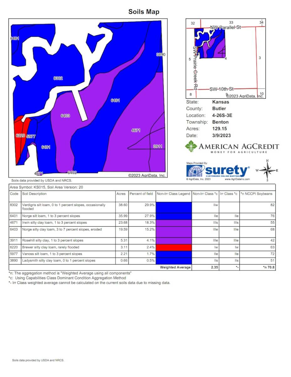 PROPERTY DESCRIPTION: 155.2 acres located north of Benton in Butler County, Kansas. This diverse property features quality tillable farm ground, over 1 mile of Whitewater Creek, a small cabin, and a silo with an observation deck! The 32′ x 24′ cabin was built in 2008. It has a bunk room, bathroom, and garage. Utilities include rural water and electric. In addition to the 130+- acres of tillable farm ground, the balance of the property consists of creek and trees. This property is a great weekend getaway candidate with agriculture income and hunting/recreation appeal! Invest In Land!