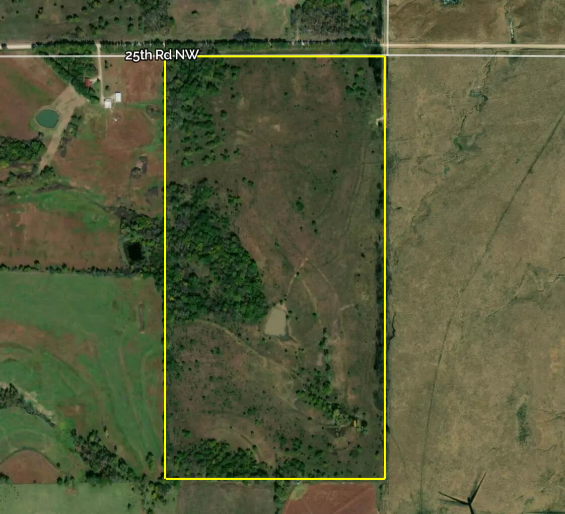 PROPERTY DESCRIPTION: 80+- acres of pasture and timber with 1 pond straight west of Waverly, Ks at the intersection of Oxen Rd and 25th Rd. Fences are fair to average and there is a set of old pens. Road access and electric run along the north boundary of the property.