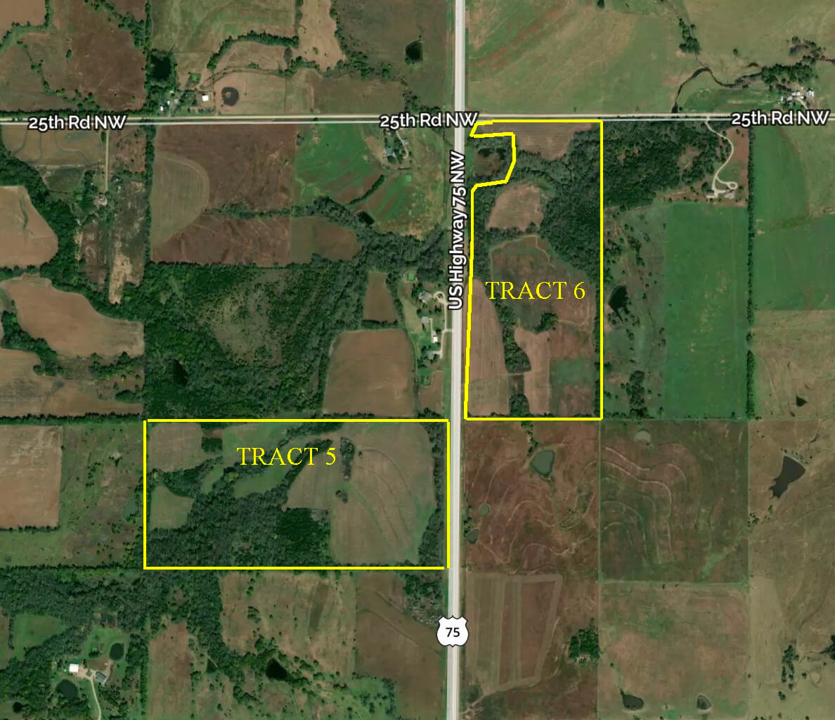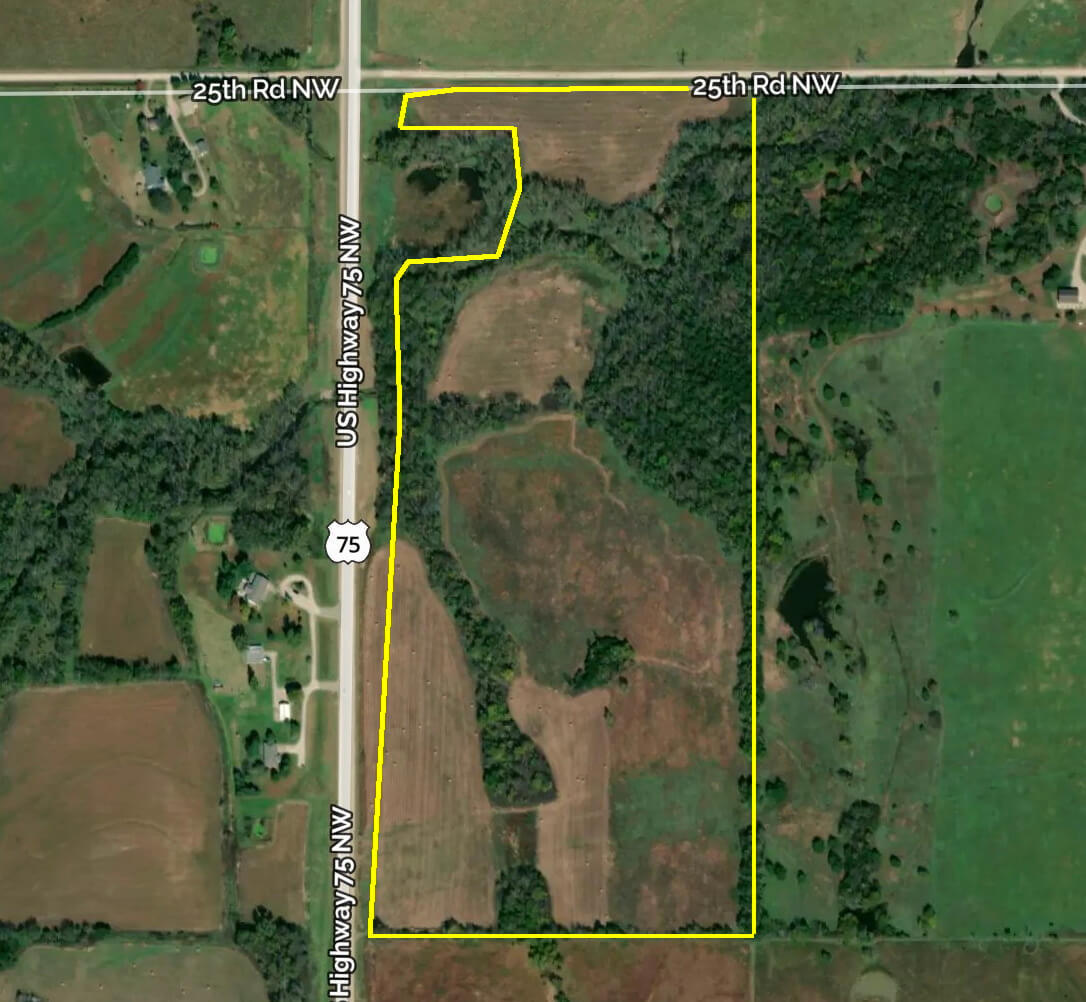 PROPERTY DESCRIPTION: 63.7+- acres of timber, pasture, and creek at the intersection of HWY 75 and 25th Rd between Lebo, Ks and Waverly Ks. Unique opportunity to own a diverse land tract with blacktop frontage, over 1/4 mile of a branch of Long Creek, pasture, and concentrated areas of heavy timber. There is a hedge row along most of the east boundary. There is 7.13 acres enrolled in the CRP program. Access along the north is a township road. Kansas Whitetail Deer, Turkeys, and Quail are common on this land tract, plus winter Waterfowl in the creek! This property would make a great future home building site, hunting and recreation property, or another great chance to Invest In Land!