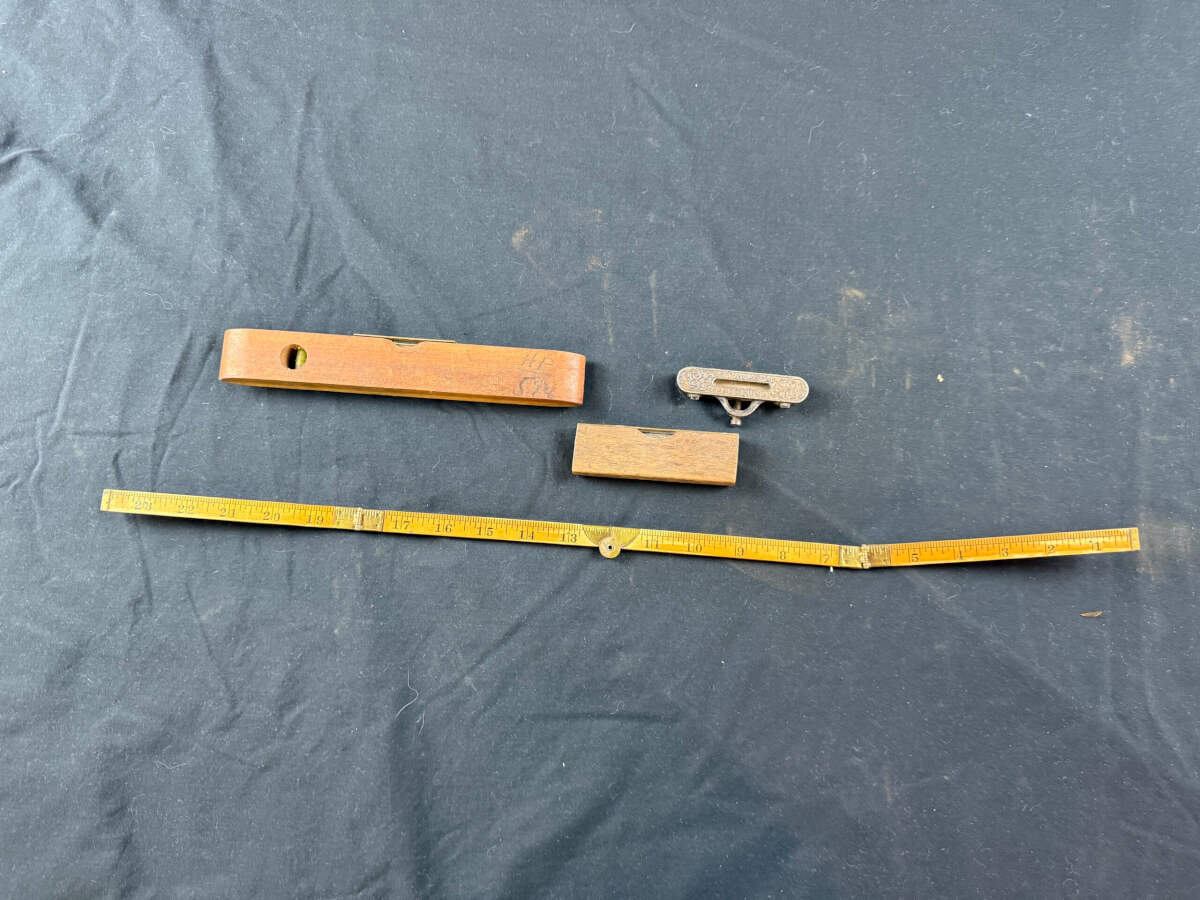 30 (4) Pieces: 4 Fold Line Level, (2) Wooden Levels & Measuring Stick