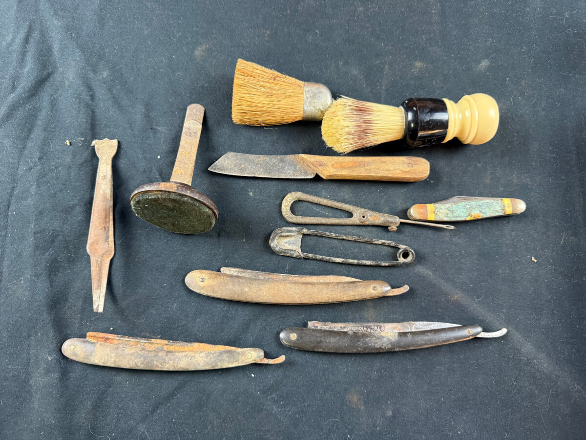 64 Misc Lot of Shaving Supplies, Brushes, Straight Razors, Etc