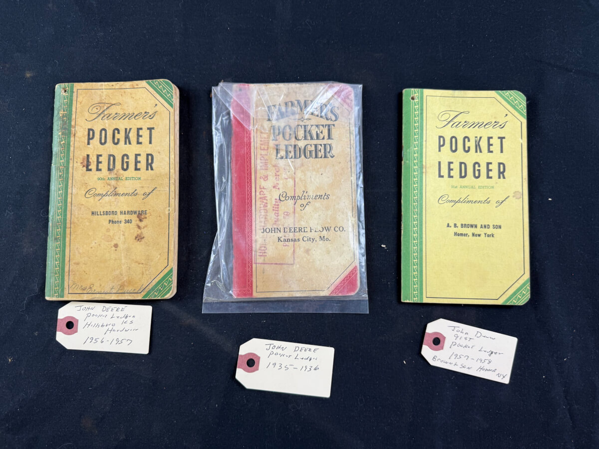 76 (3) Farmer’s Pocket Ledgers: AB Brown & Son New York, John Deere KC, MO & Hillsboro Hardware