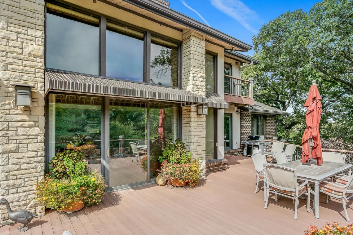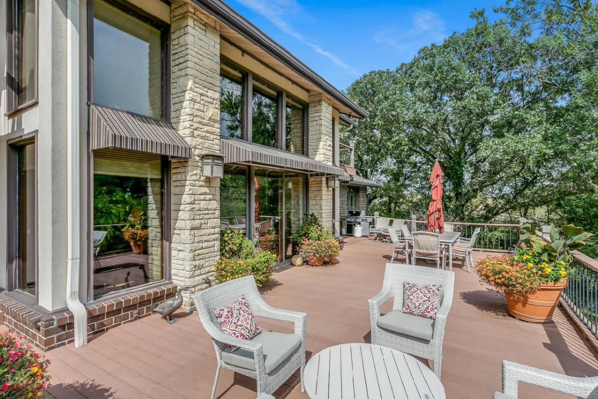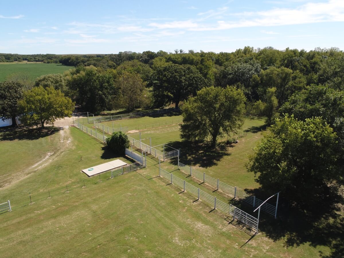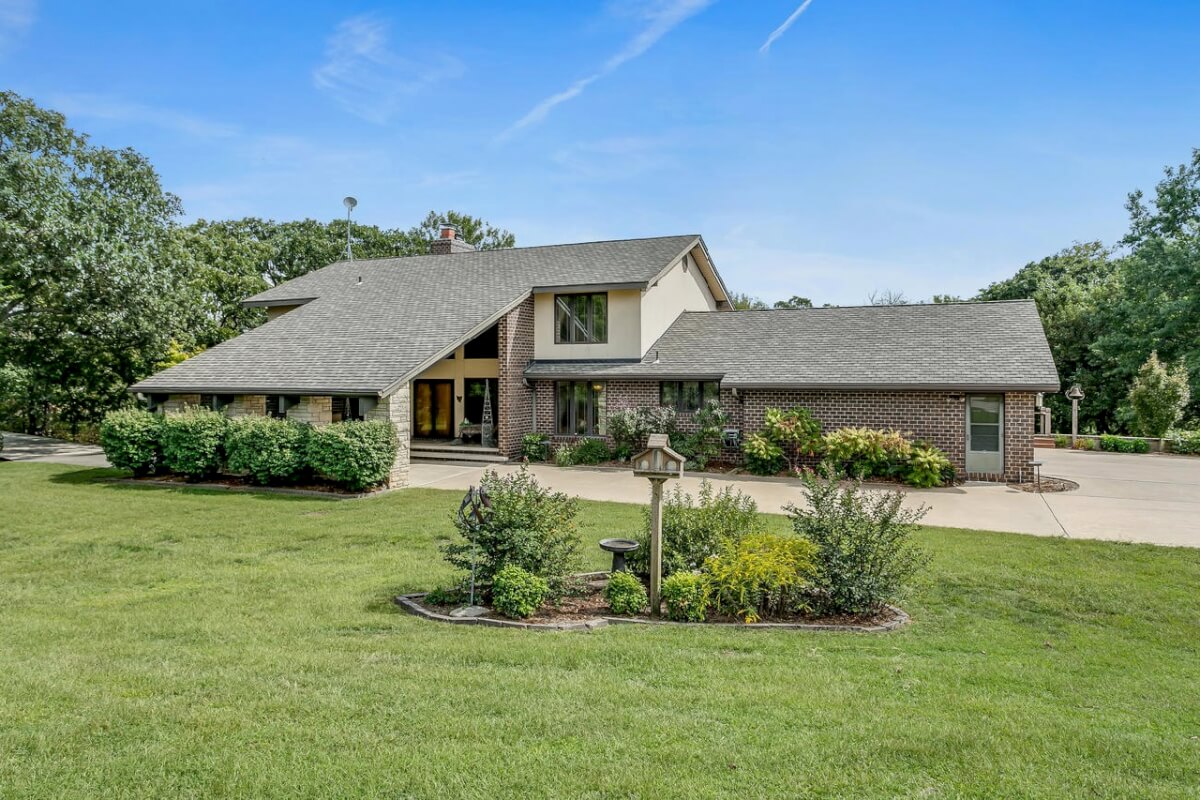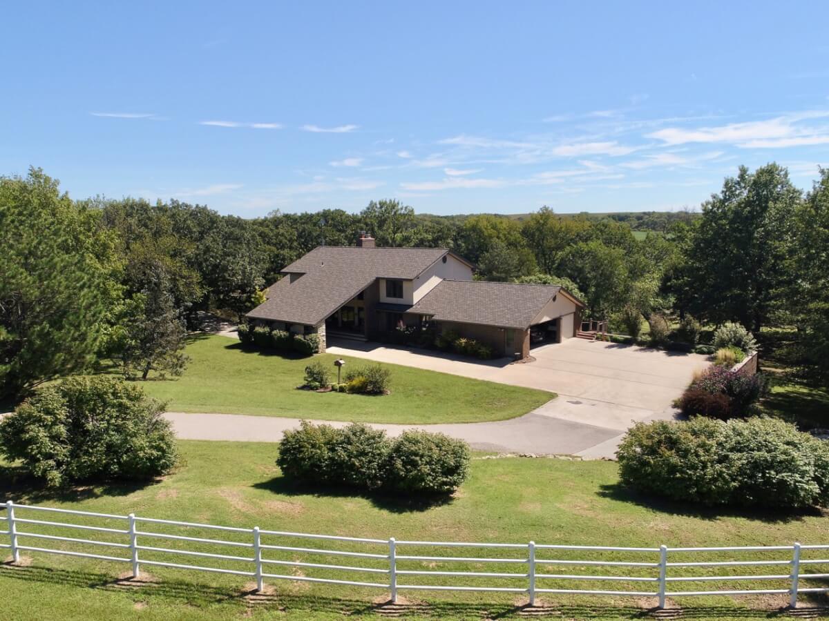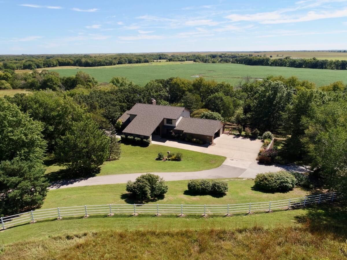 PROPERTY DESCRIPTION: BEAUTIFUL 5 bed/3.5 bath home with impressive & unique architecture. Nestled among the trees on 46.9 lovely acres! Located on a paved road, behind a gated entrance, at the end of a paved driveway, and with a covered entry way that is both beautiful AND functional. Country living doesn’t get any more convenient than this! Enjoy unprecedented natural light on all levels of this home. The amenities include gorgeous stone details/fireplaces, oversized windows, a main floor office space, downstairs game room and wine cellar, and a whole house back-up generator. A secluded, quality deck off of the back of the home reveals a view like no other. The property also includes a 58′ x 80′ outbuilding with concrete floor and attached lean-to, chicken coop, pond, 3 livestock pens, a part of the Little Walnut River, and a beautiful wooded area that has been well maintained to allow for a fire pit and outdoor entertaining. This listing is ideal for a horse property, an outdoors enthusiast, or anyone who wants to own a little chunk of paradise! Schedule a private viewing today.