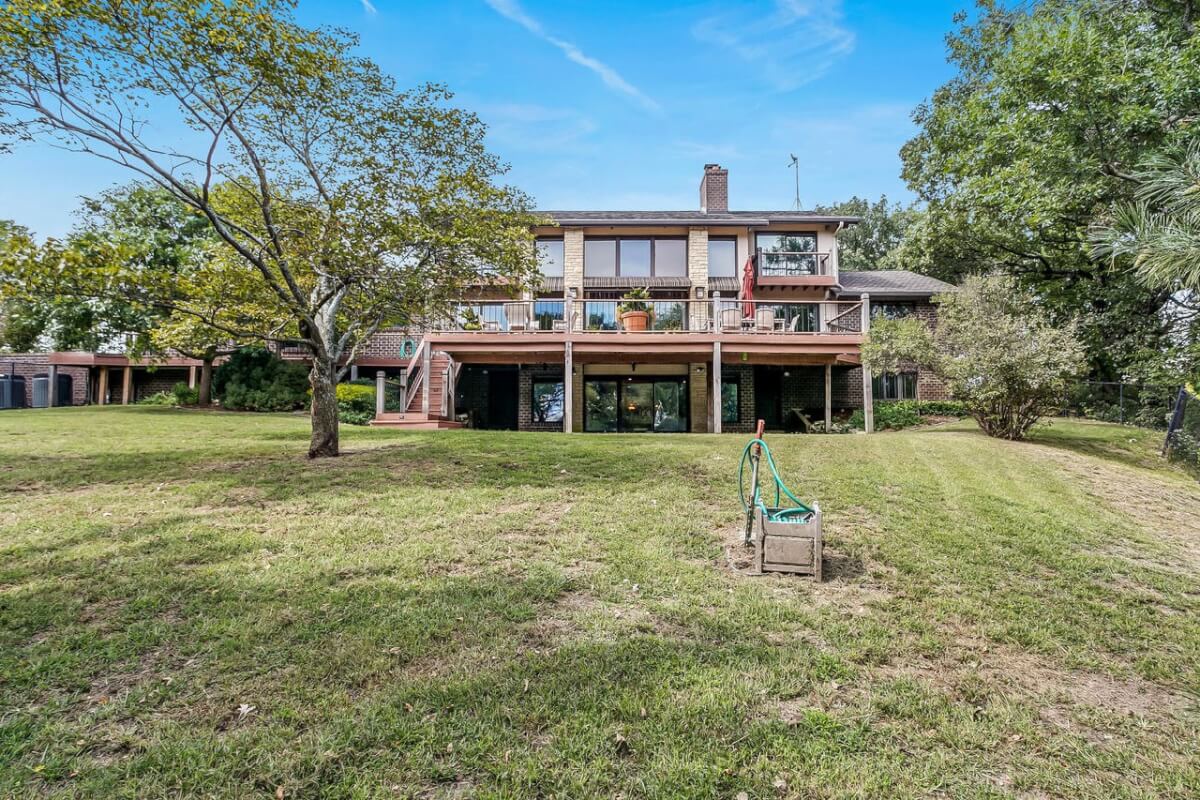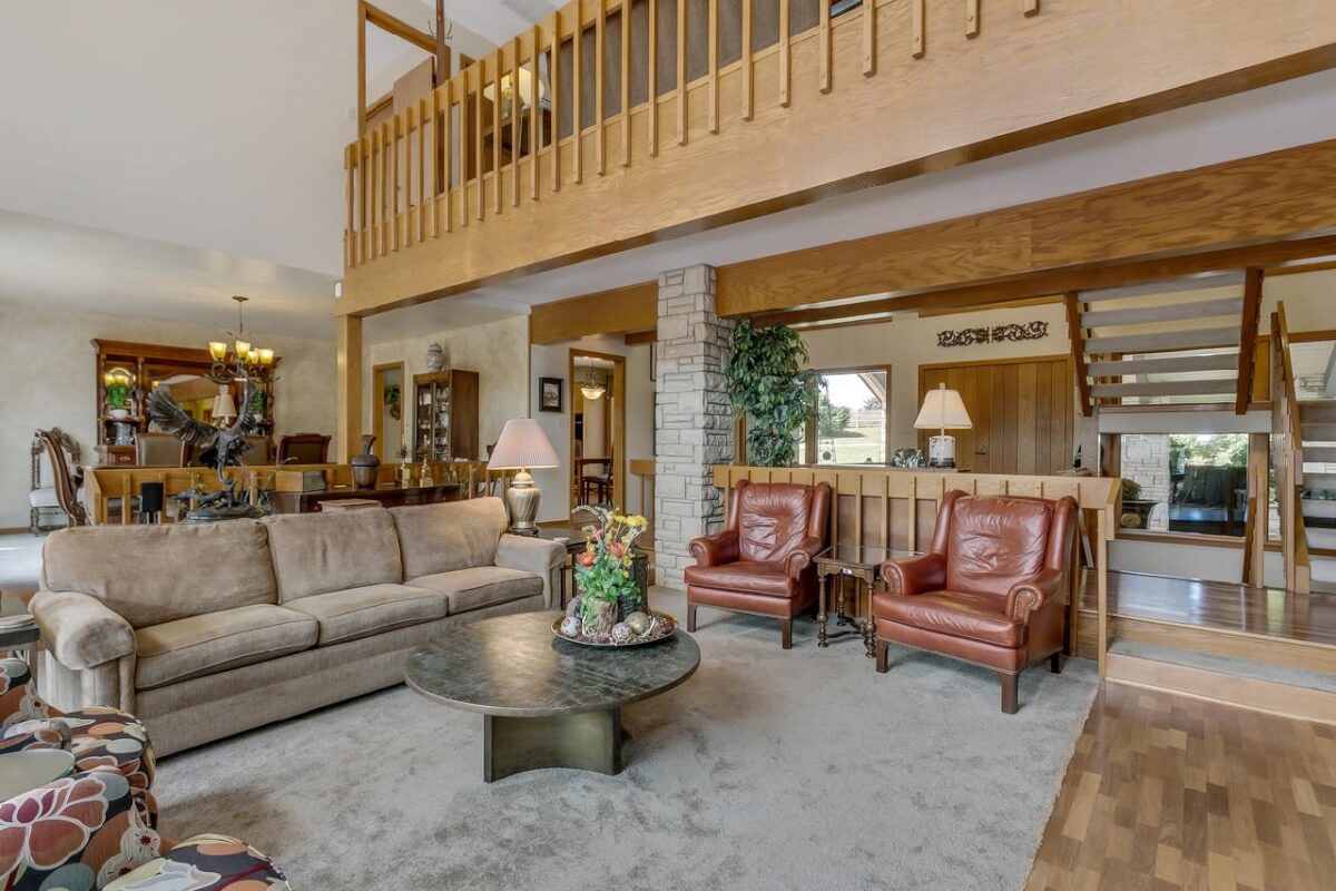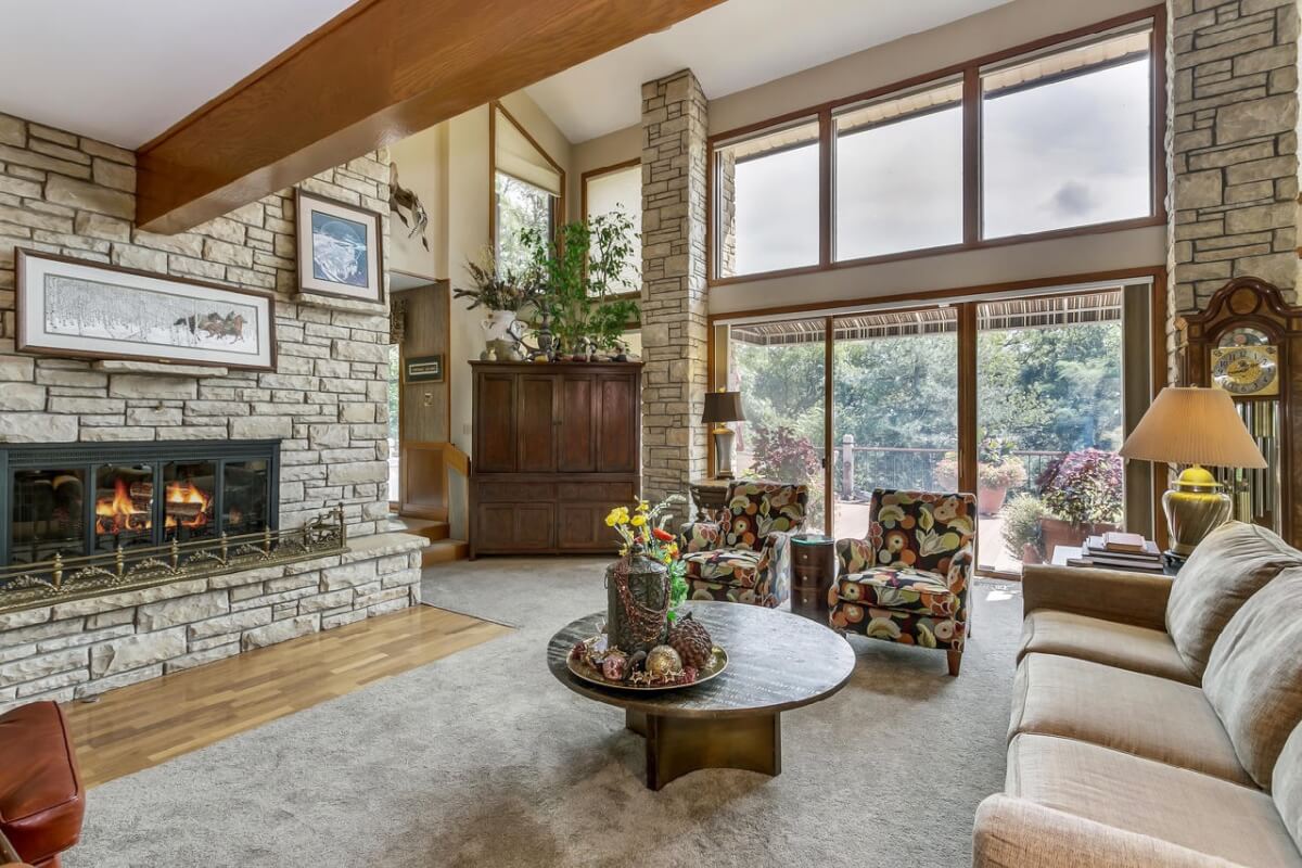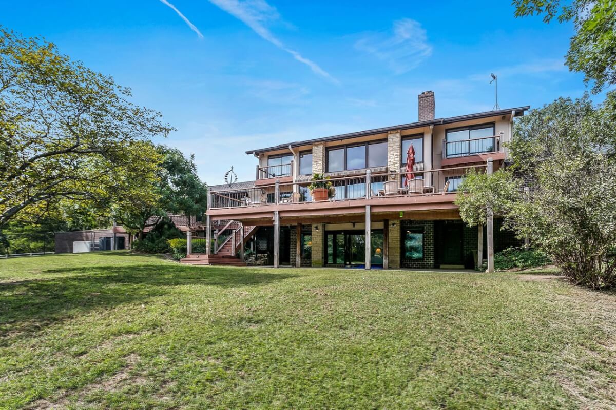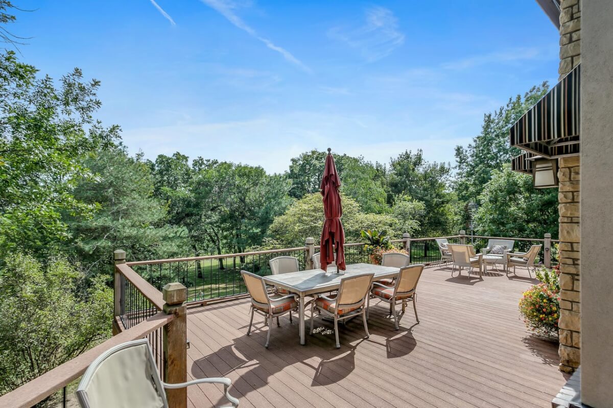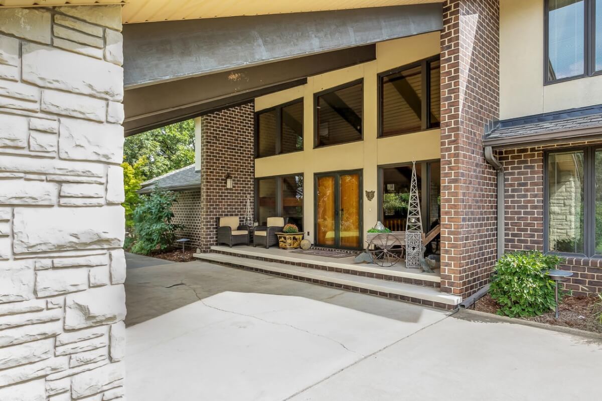 PROPERTY DESCRIPTION: BEAUTIFUL 5 bed/3.5 bath home with impressive & unique architecture. Nestled among the trees on 46.9 lovely acres! Located on a paved road, behind a gated entrance, at the end of a paved driveway, and with a covered entry way that is both beautiful AND functional. Country living doesn’t get any more convenient than this! Enjoy unprecedented natural light on all levels of this home. The amenities include gorgeous stone details/fireplaces, oversized windows, a main floor office space, downstairs game room and wine cellar, and a whole house back-up generator. A secluded, quality deck off of the back of the home reveals a view like no other. The property also includes a 58′ x 80′ outbuilding with concrete floor and attached lean-to, chicken coop, pond, 3 livestock pens, a part of the Little Walnut River, and a beautiful wooded area that has been well maintained to allow for a fire pit and outdoor entertaining. This listing is ideal for a horse property, an outdoors enthusiast, or anyone who wants to own a little chunk of paradise! Schedule a private viewing today.