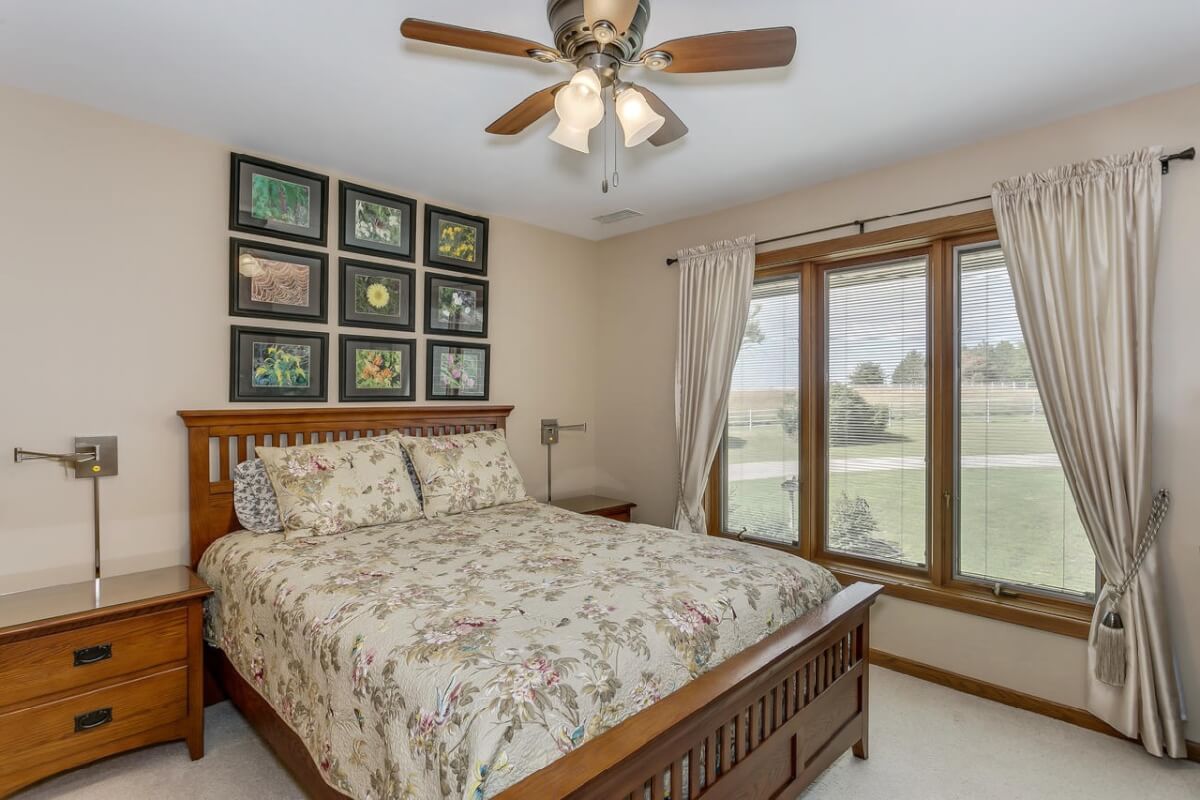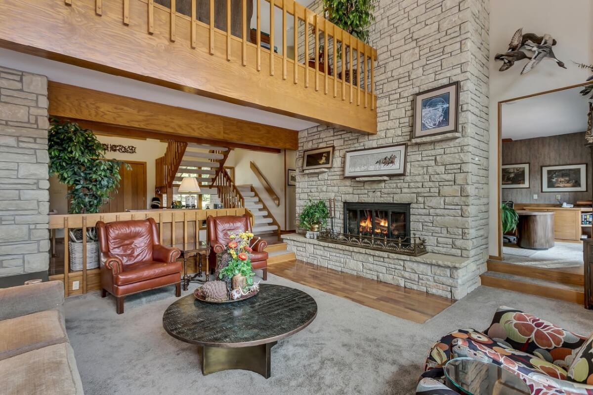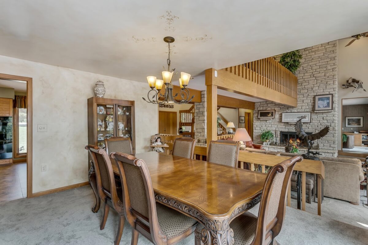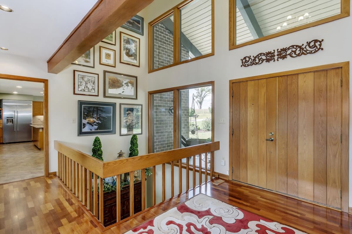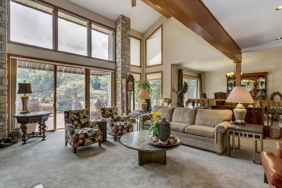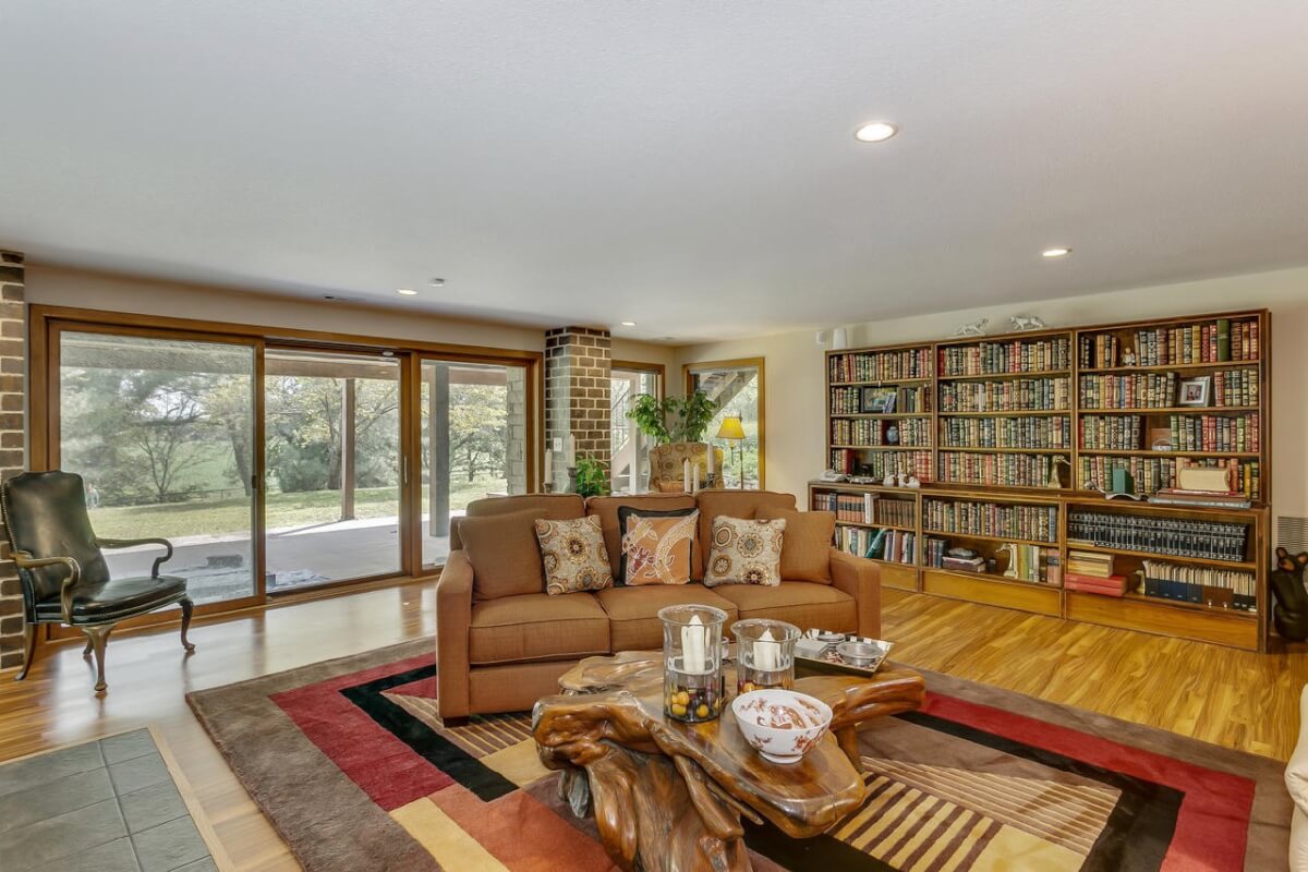 PROPERTY DESCRIPTION: BEAUTIFUL 5 bed/3.5 bath home with impressive & unique architecture. Nestled among the trees on 46.9 lovely acres! Located on a paved road, behind a gated entrance, at the end of a paved driveway, and with a covered entry way that is both beautiful AND functional. Country living doesn’t get any more convenient than this! Enjoy unprecedented natural light on all levels of this home. The amenities include gorgeous stone details/fireplaces, oversized windows, a main floor office space, downstairs game room and wine cellar, and a whole house back-up generator. A secluded, quality deck off of the back of the home reveals a view like no other. The property also includes a 58′ x 80′ outbuilding with concrete floor and attached lean-to, chicken coop, pond, 3 livestock pens, a part of the Little Walnut River, and a beautiful wooded area that has been well maintained to allow for a fire pit and outdoor entertaining. This listing is ideal for a horse property, an outdoors enthusiast, or anyone who wants to own a little chunk of paradise! Schedule a private viewing today.