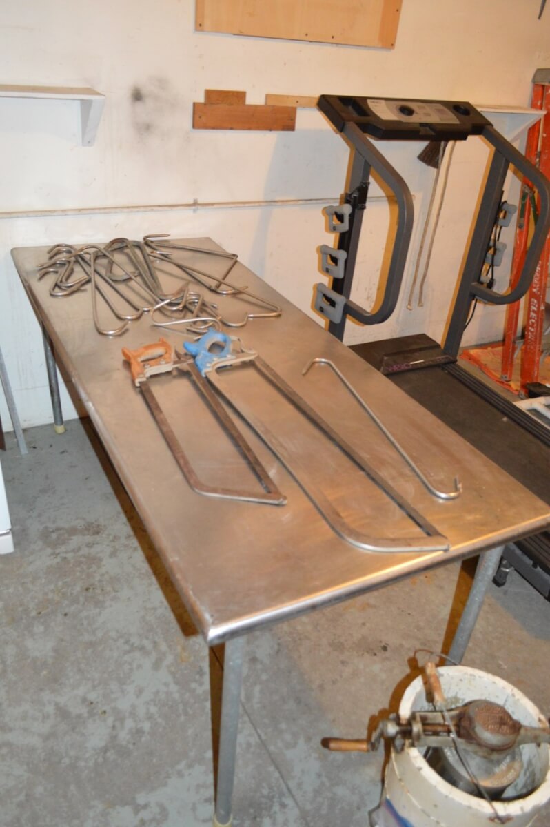 Stainless Steel Butcher Table, Hooks & Meat Saws