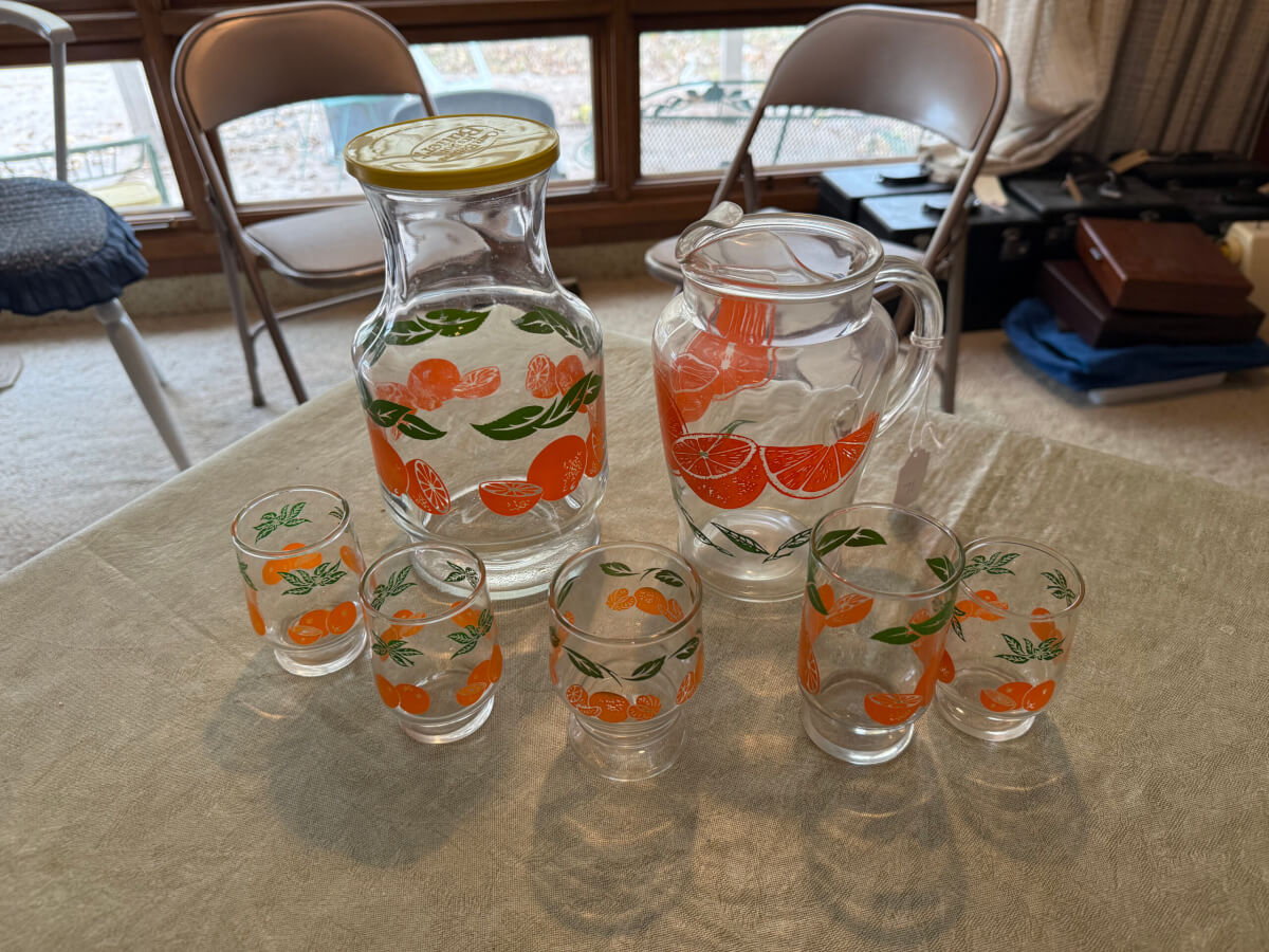 | 74 | Fire King Measuring Cups, Tang Pitcher & Glasses |