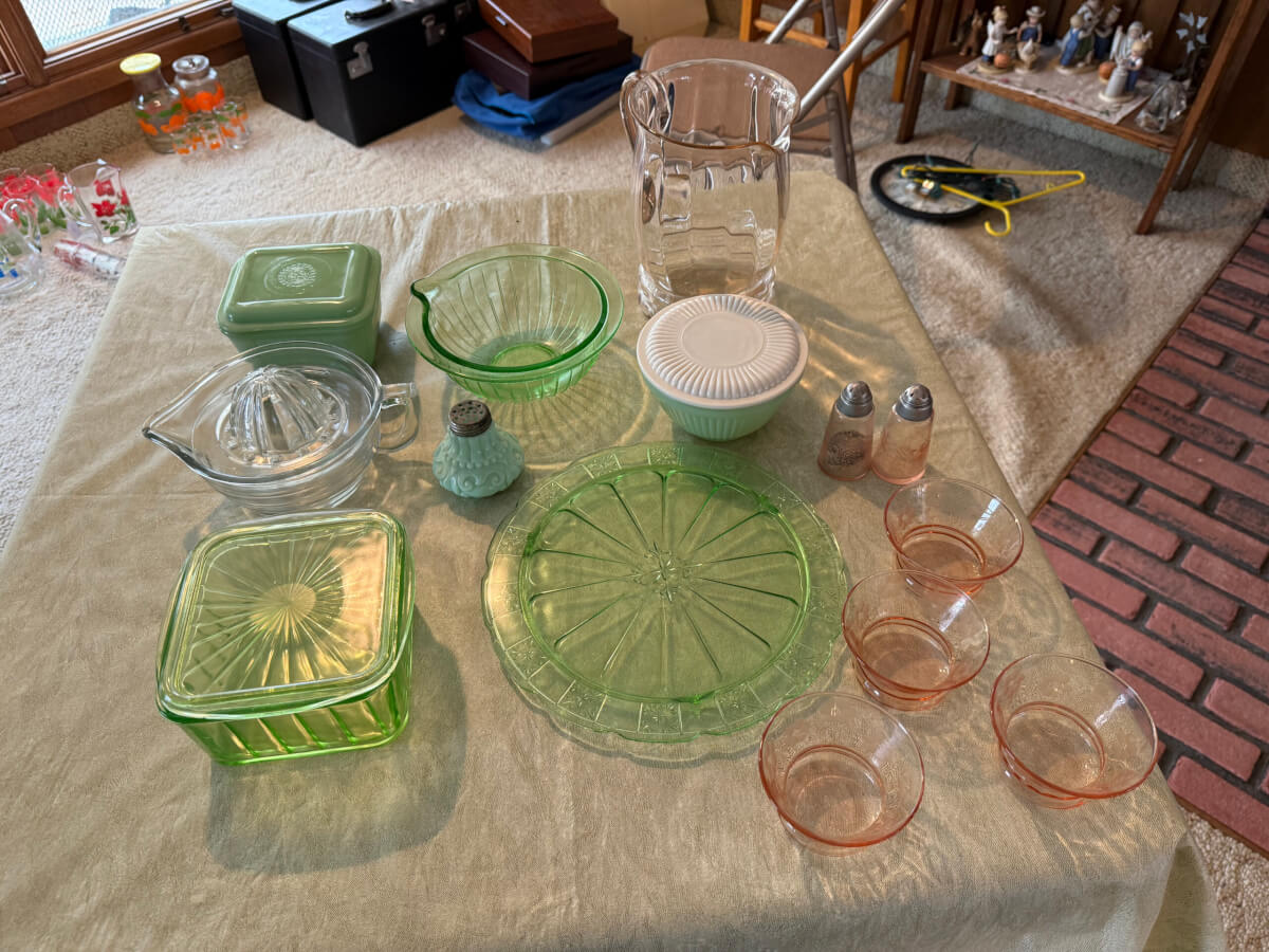 | 77 | Depression Green, Juicer, Jadeite Green Fridge Dish, Pink Depression Glasses, Shakers |