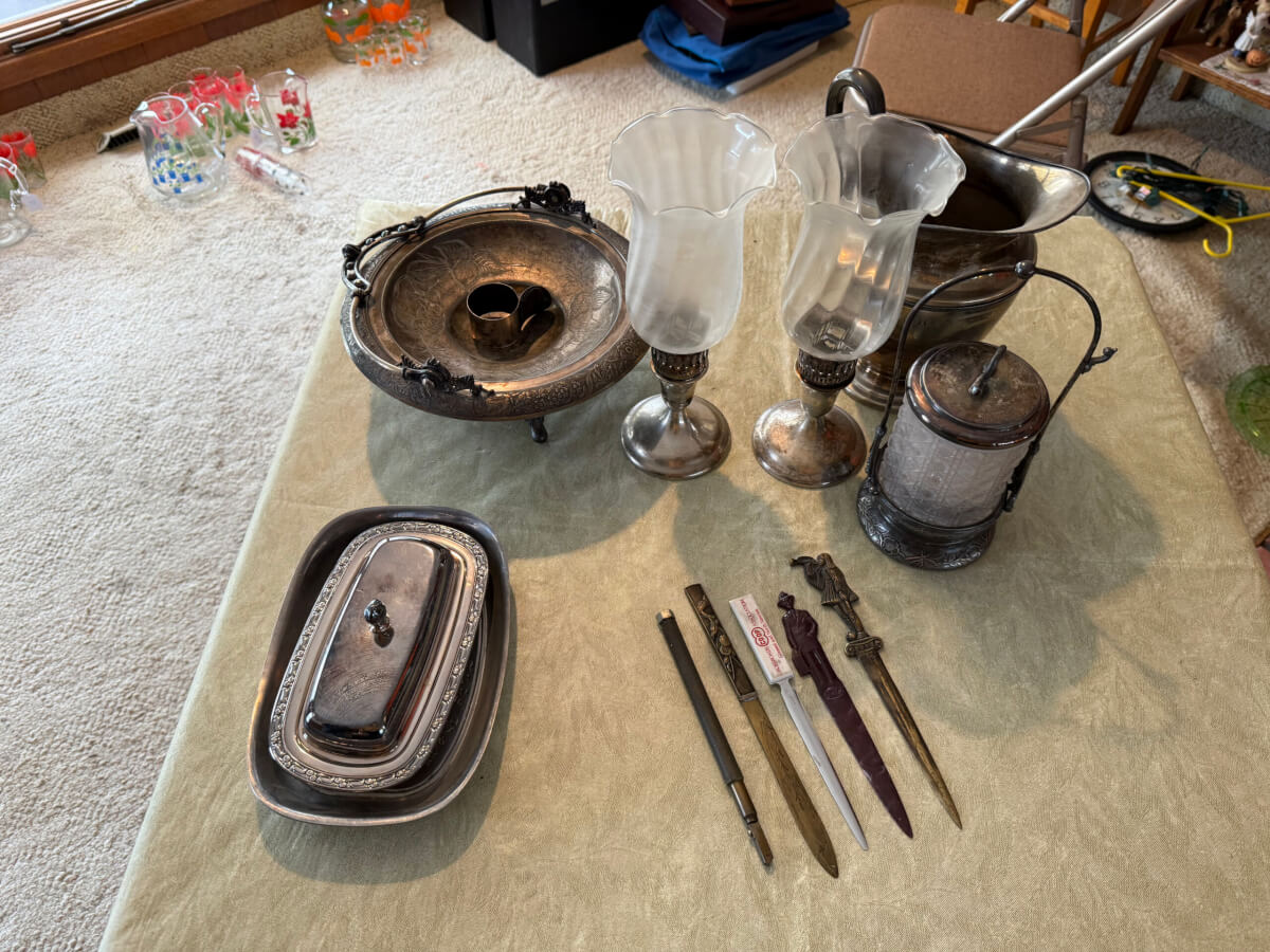 | 78 | Pickle Caster, Letter Openers, International Silver Co. Candlesticks, Butter Dish |