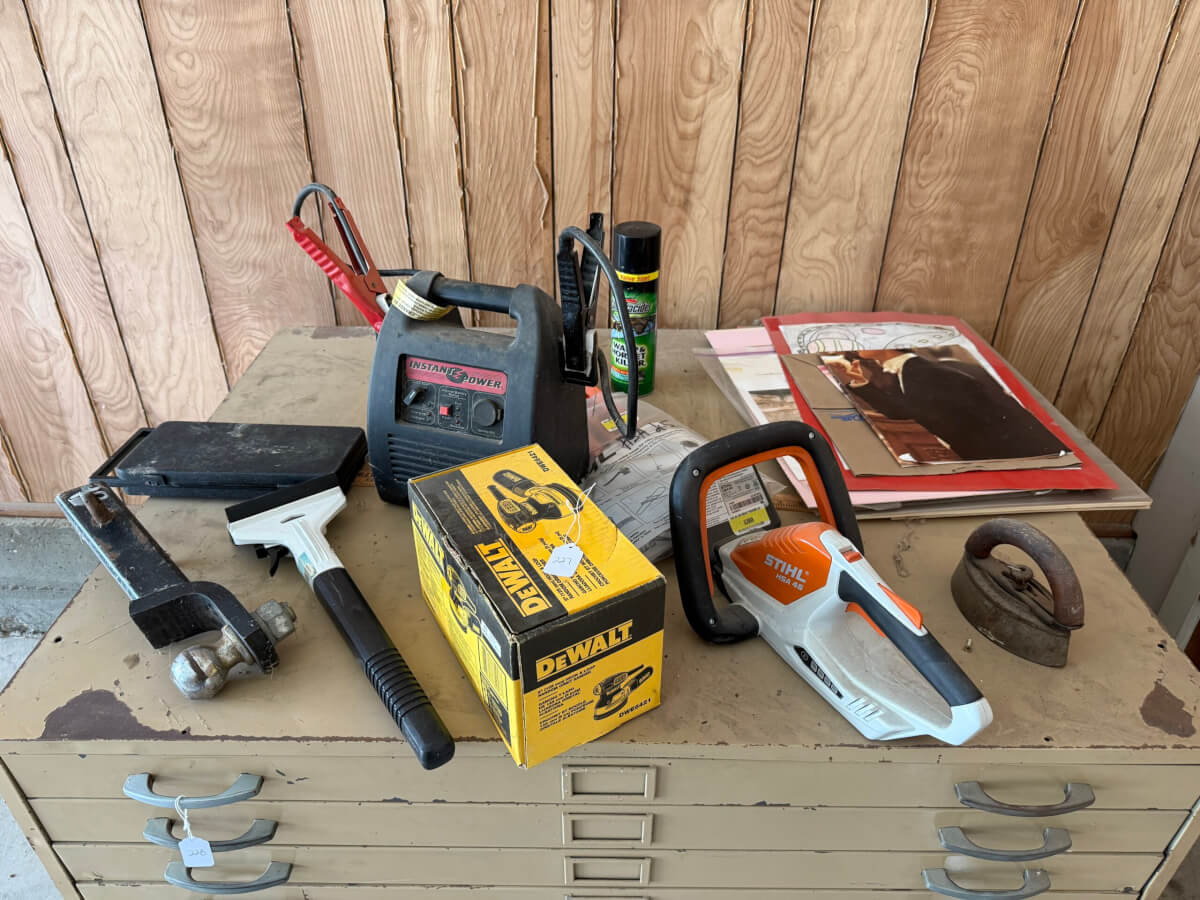 | 227 | Battery Charger, Stihl Hedge Trimmer, Dewalt Sander, Hitch & Misc |