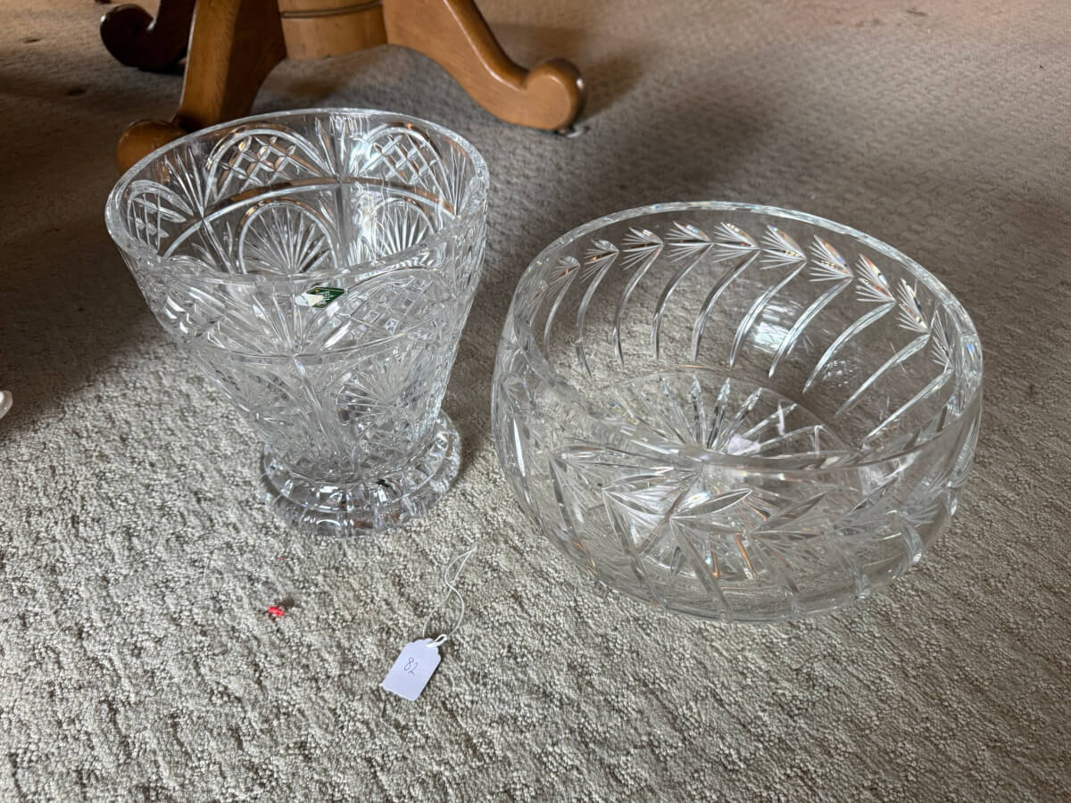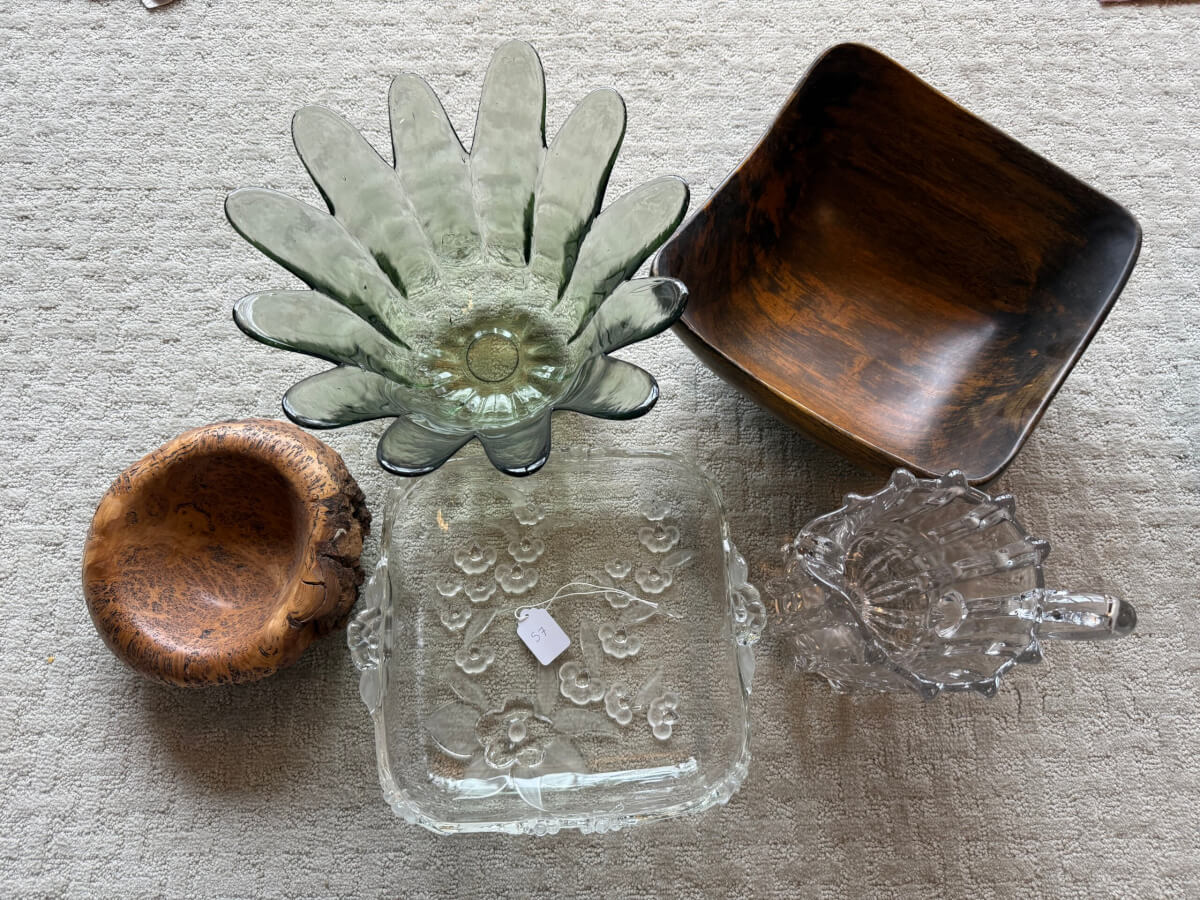 | 57 | (2) Wood Bowls, Glass Picher, Vase & Dish |