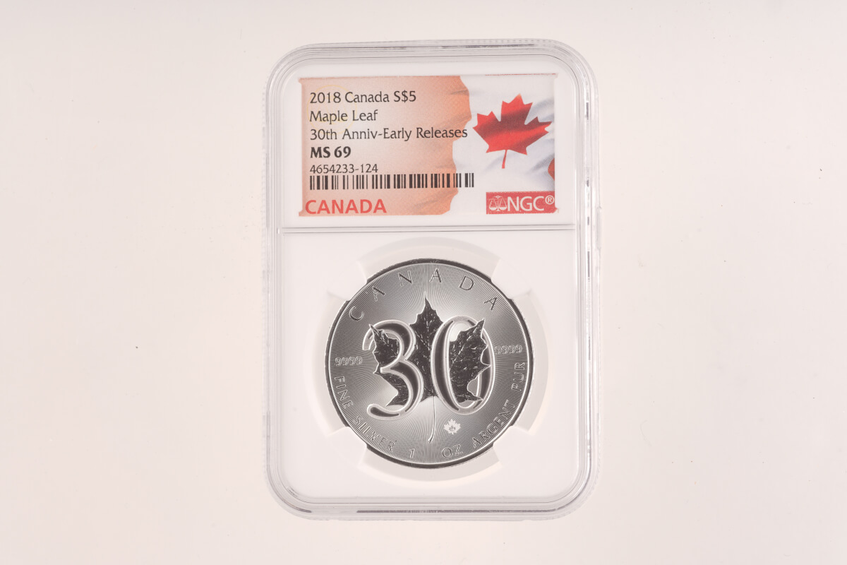 | 6 | 2018 .9999 Silver Maple $5 30th Anniversary Graded NGC MS 69 |