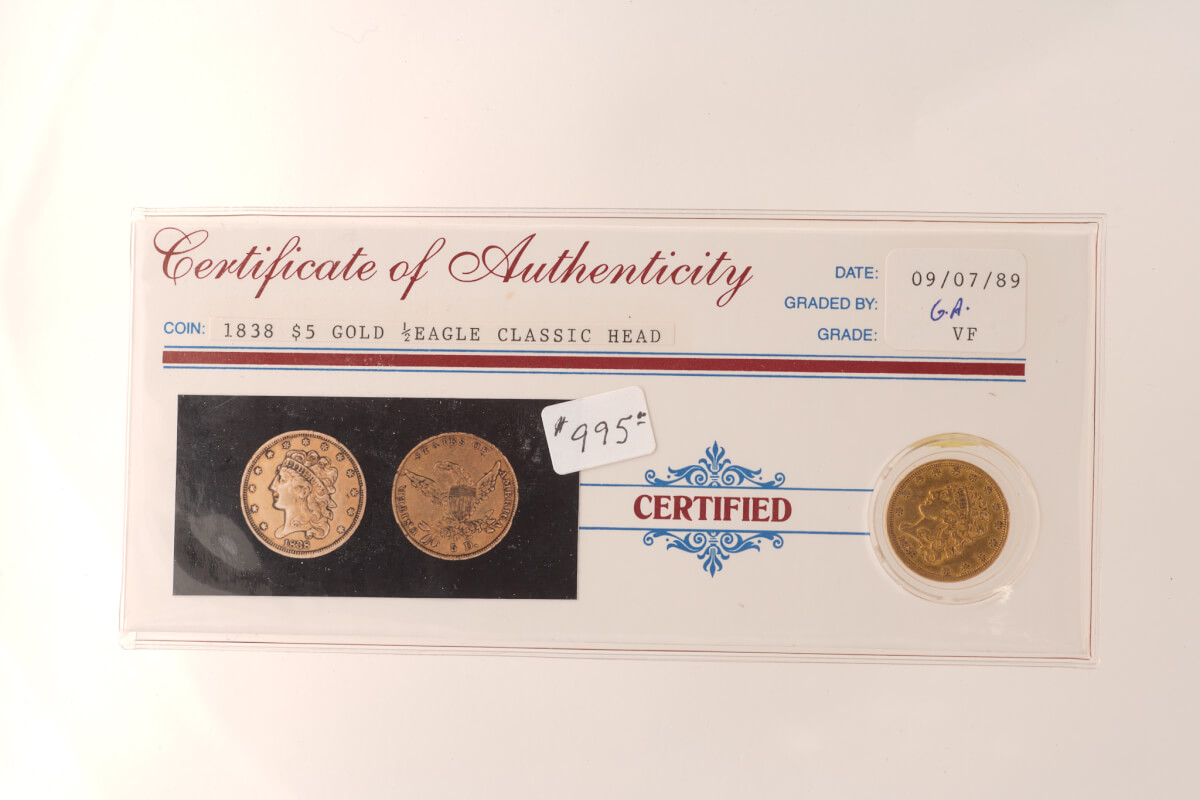 | 41 | 1838 $5 Gold 1/2 Eagle Classic Head Grade VF |