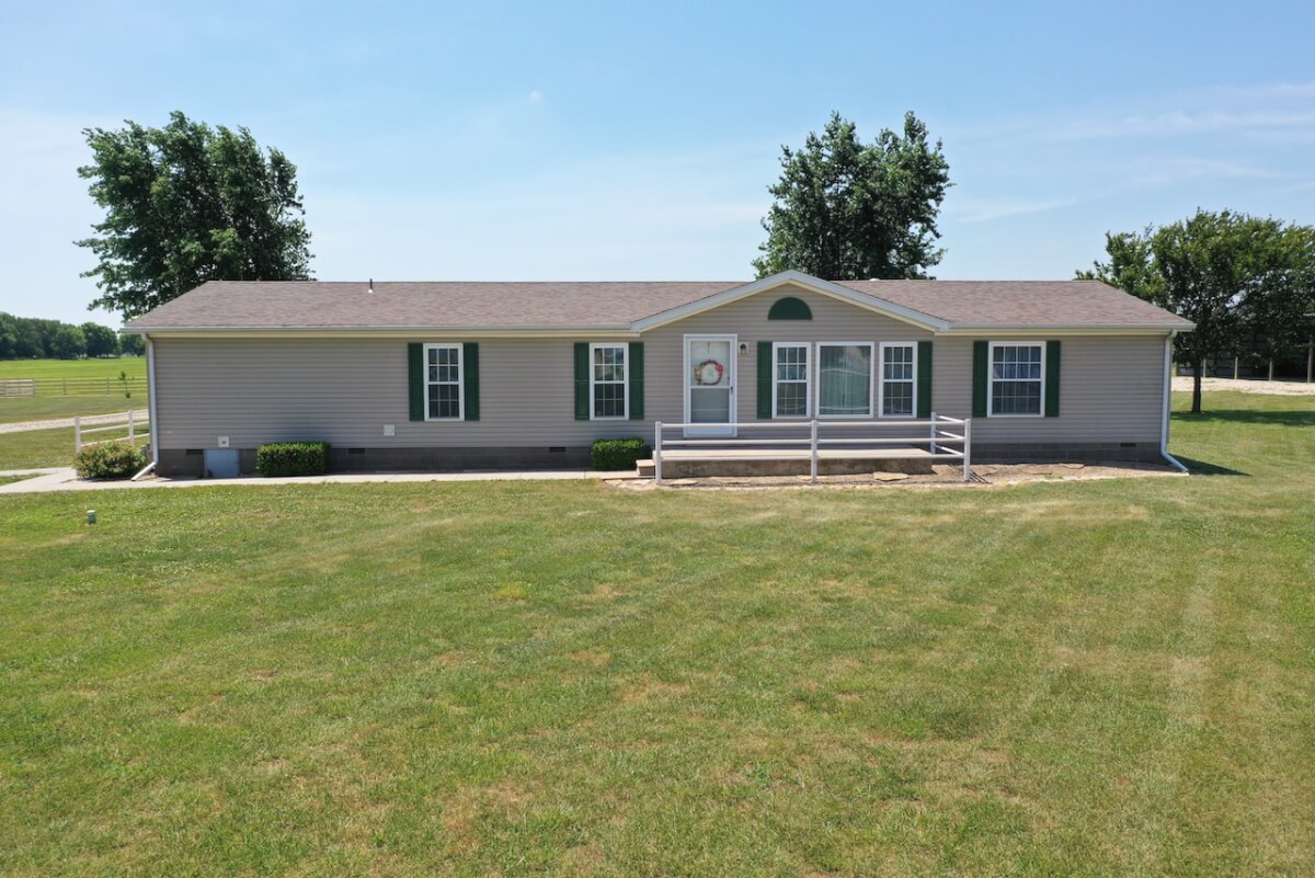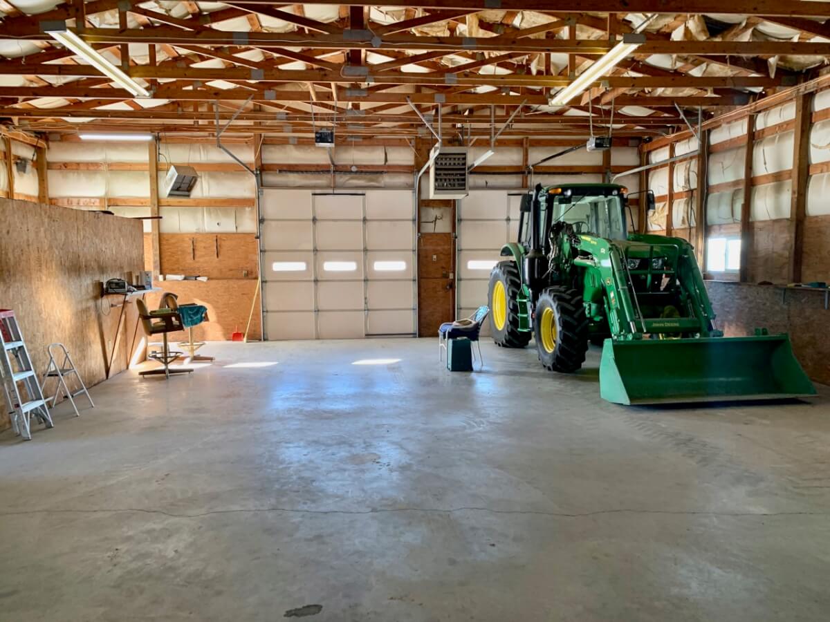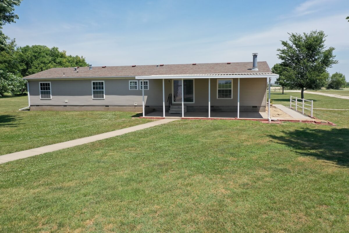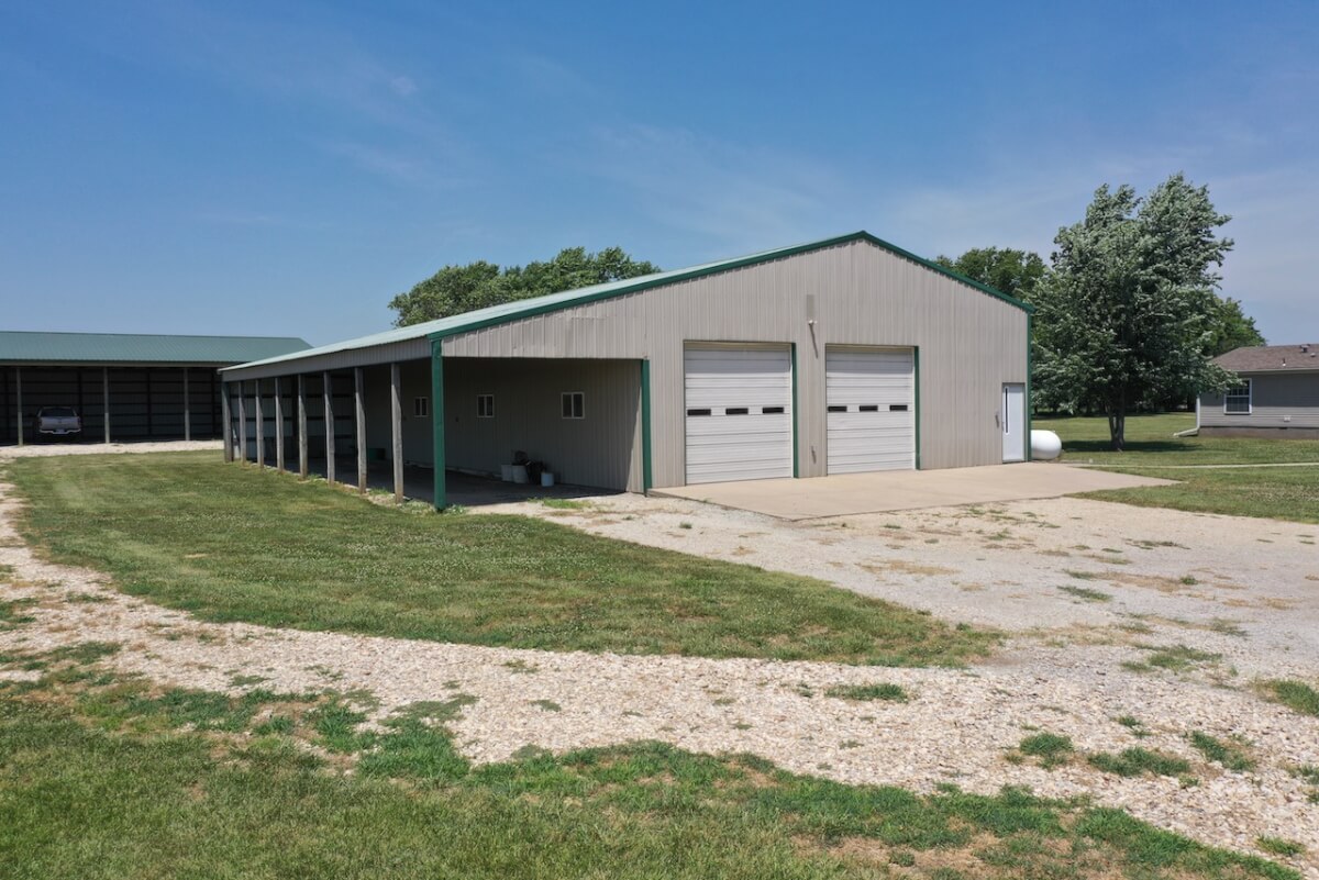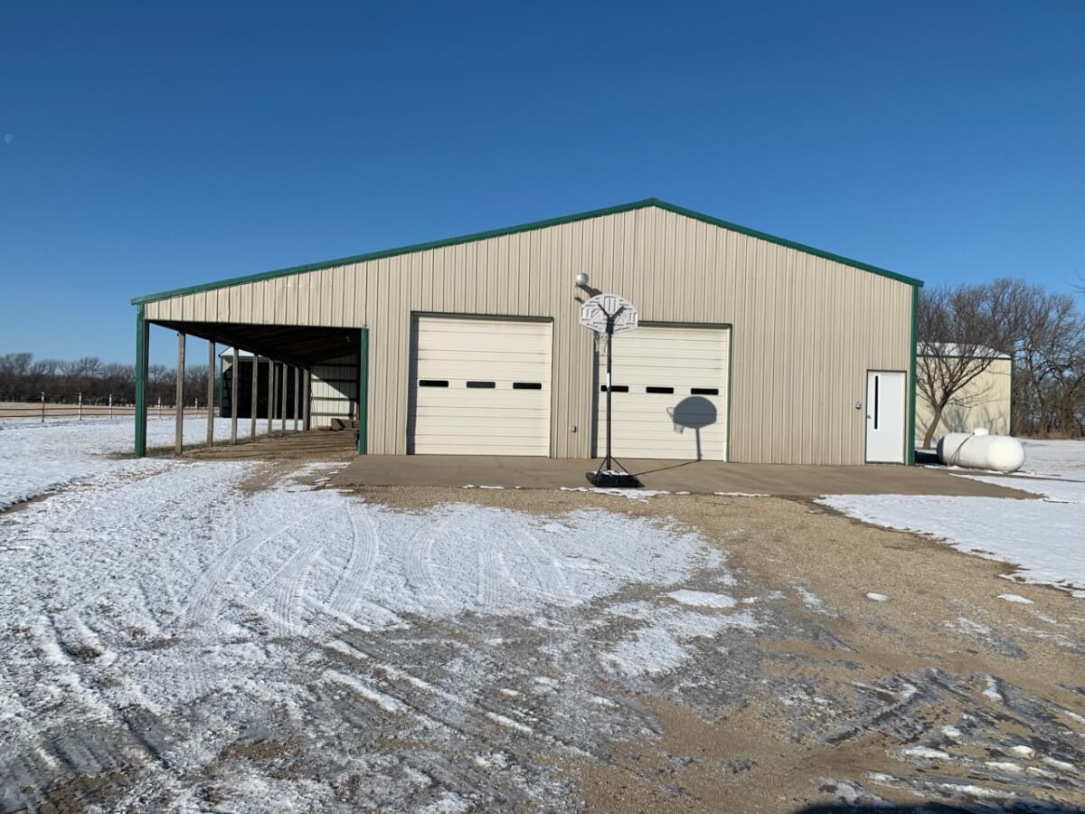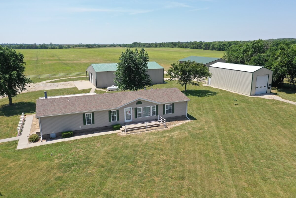 IMPROVEMENTS: The double wide manufactured home was built in 1996 and has 1836 square feet. This 3 bedroom two bath home has two living rooms, a dining area, and a wood burning fireplace. A large kitchen is open to both the dining room area and the living room w/ fireplace. In the master bedroom there re two closets and a master bath with separate tub & shower. The house sits on a permanent foundation and has a front porch and a covered back patio. Other buildings on the property include a 64′ x 40′ metal building w/ concrete floor, heat, a bathroom, and an additional 15′ lean-to all along the south side of the building. In addition, there is a 60′ x 40′ pole barn open on one side for equipment storage, and another building that is 50′ x 25′ with a concrete floor and (2) 14′ overhead doors adequate for RV parking.