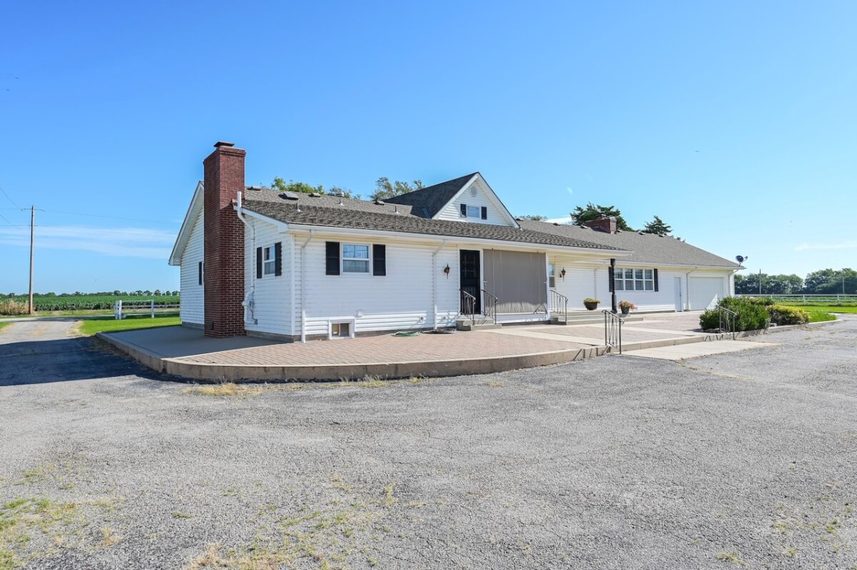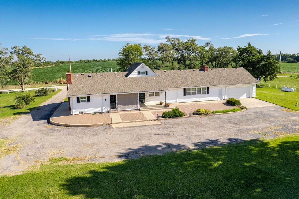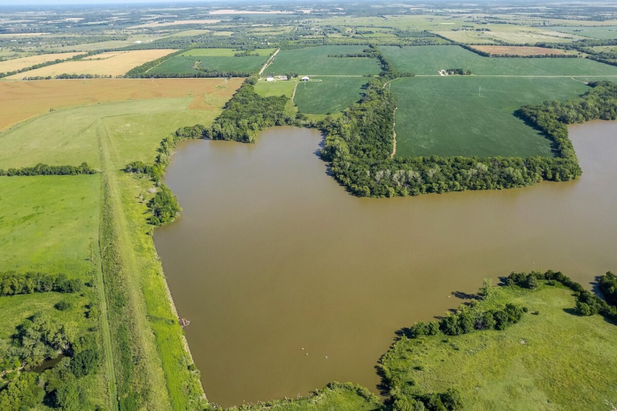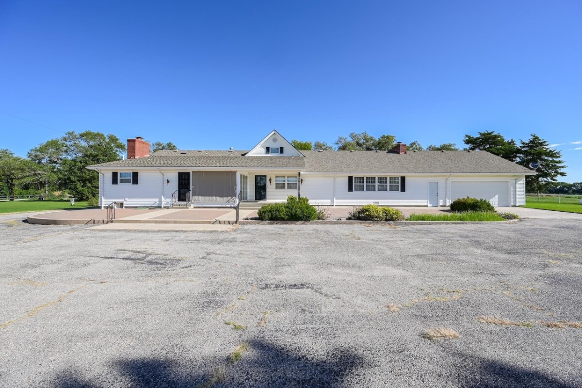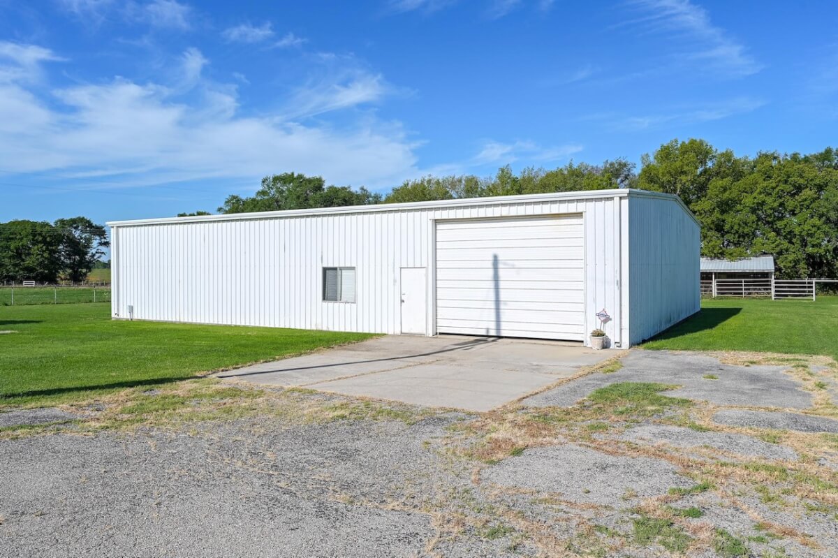 PROPERTY DESCRIPTION: Beautiful home on 80+- acres located southeast of Augusta in Butler County, Kansas. Land features include approximately 27 acres of tillable ground, fenced pasture area for livestock or horses, and smaller pens. A 75′ x 50′ shop building offers excellent storage and an office. The 84 x 54 building is the perfect place to store equipment and hay. Trees and habitat in the southern portion of the property offer habitat and cover around the large watershed lake. Approximately 9 acres of water is a part of this property, offering the opportunity for fishing, swimming, and boating! This large 3040 square foot sprawling home has many great classic features including a St. Charles kitchen, 2 fireplace inserts, vaulted ceilings in the living room, and a wet bar. The master bedroom on the main level has a large California closet. Other features include a large oversized finished 2 car attached garage. Home has large unfinished basement providing ample storage with a bonus full bath.