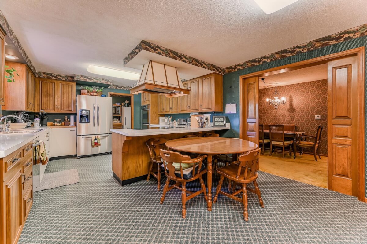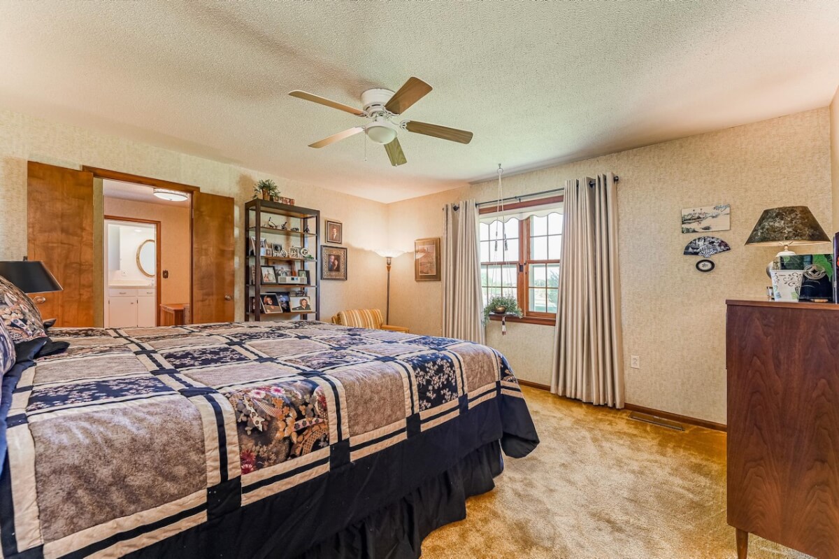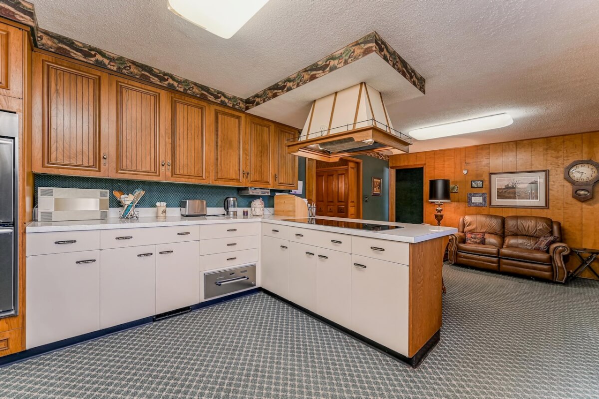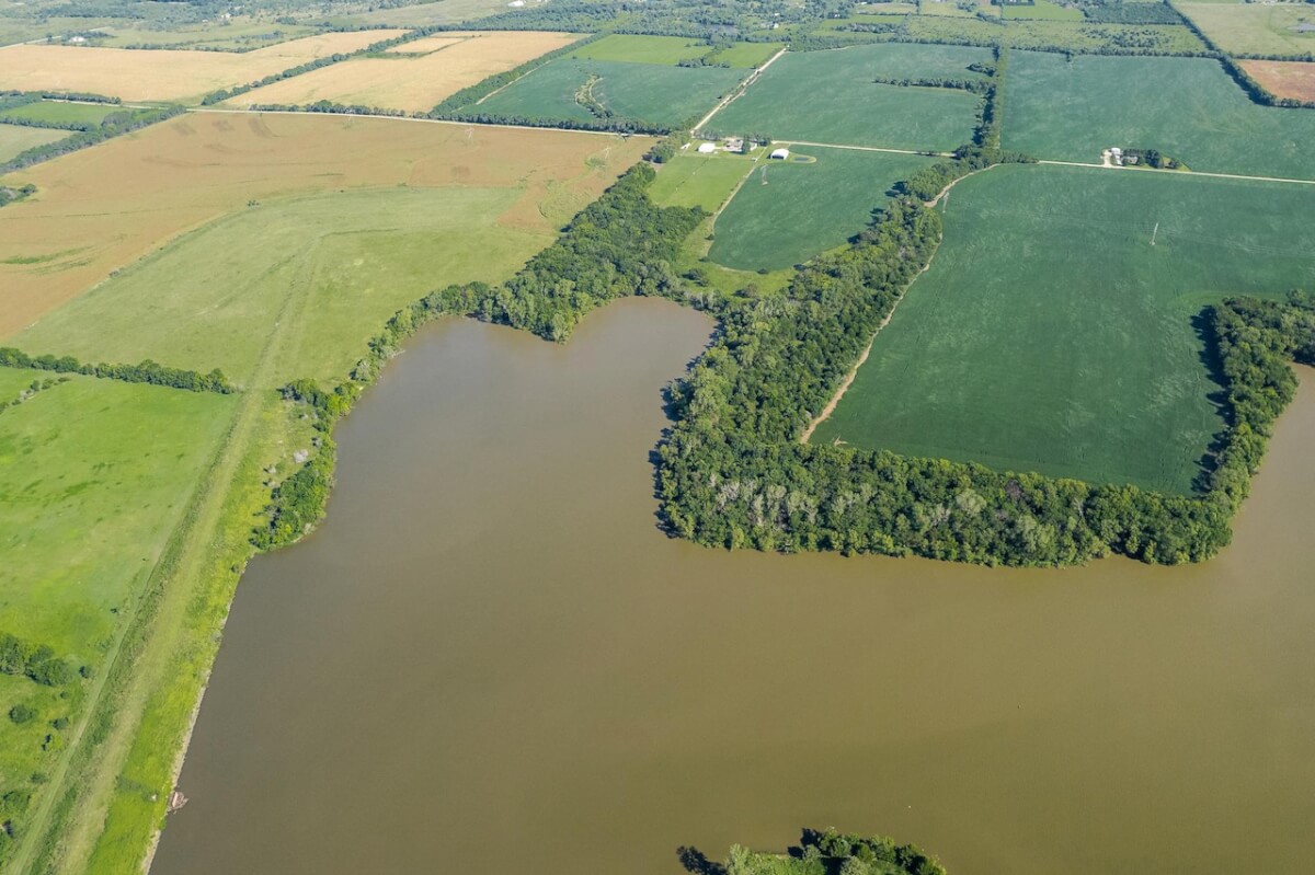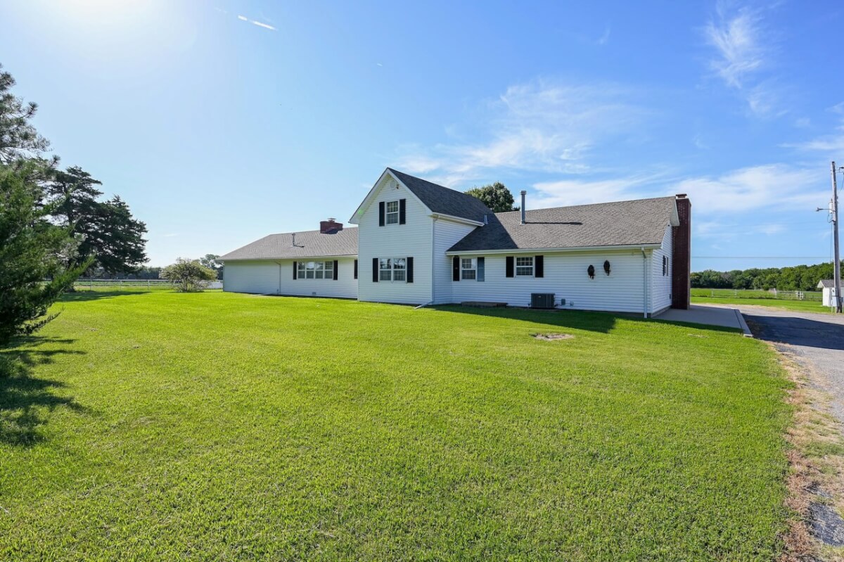PROPERTY DESCRIPTION: Beautiful home on 80+- acres located southeast of Augusta in Butler County, Kansas. Land features include approximately 27 acres of tillable ground, fenced pasture area for livestock or horses, and smaller pens. A 75′ x 50′ shop building offers excellent storage and an office. The 84 x 54 building is the perfect place to store equipment and hay. Trees and habitat in the southern portion of the property offer habitat and cover around the large watershed lake. Approximately 9 acres of water is a part of this property, offering the opportunity for fishing, swimming, and boating! This large 3040 square foot sprawling home has many great classic features including a St. Charles kitchen, 2 fireplace inserts, vaulted ceilings in the living room, and a wet bar. The master bedroom on the main level has a large California closet. Other features include a large oversized finished 2 car attached garage. Home has large unfinished basement providing ample storage with a bonus full bath.