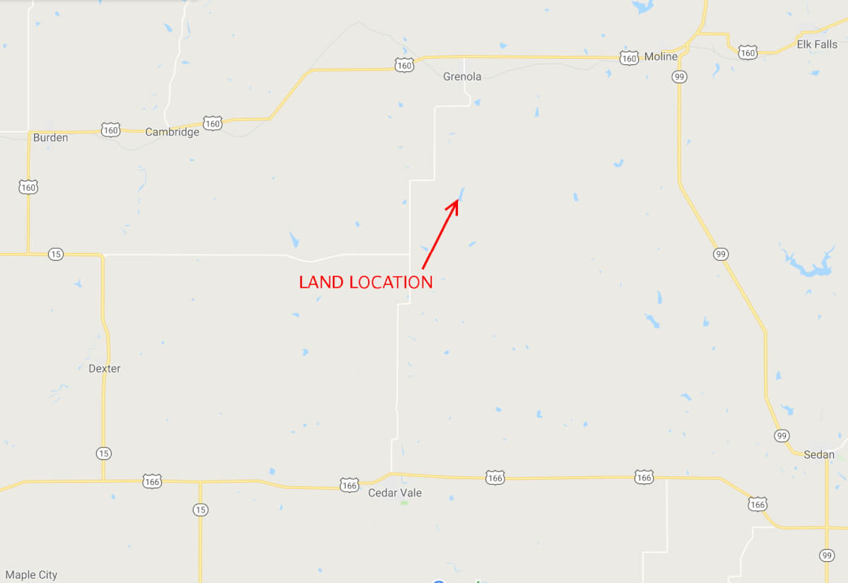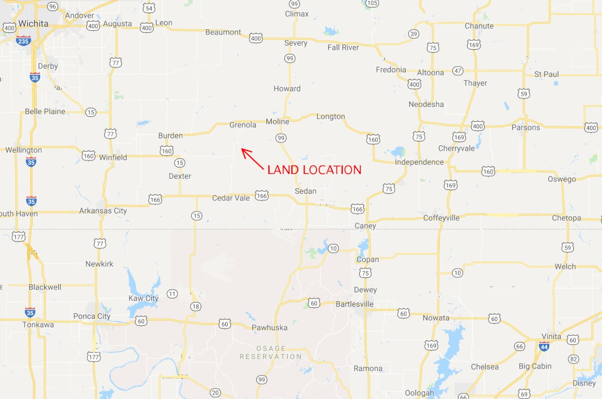 LAND LOCATION: From HWY 160 at Grenola Kansas, South on Road 6 (Main St) 5 Miles to Union Rd, West 1/2 Mile to Road 5, South 1 Mile to the property.