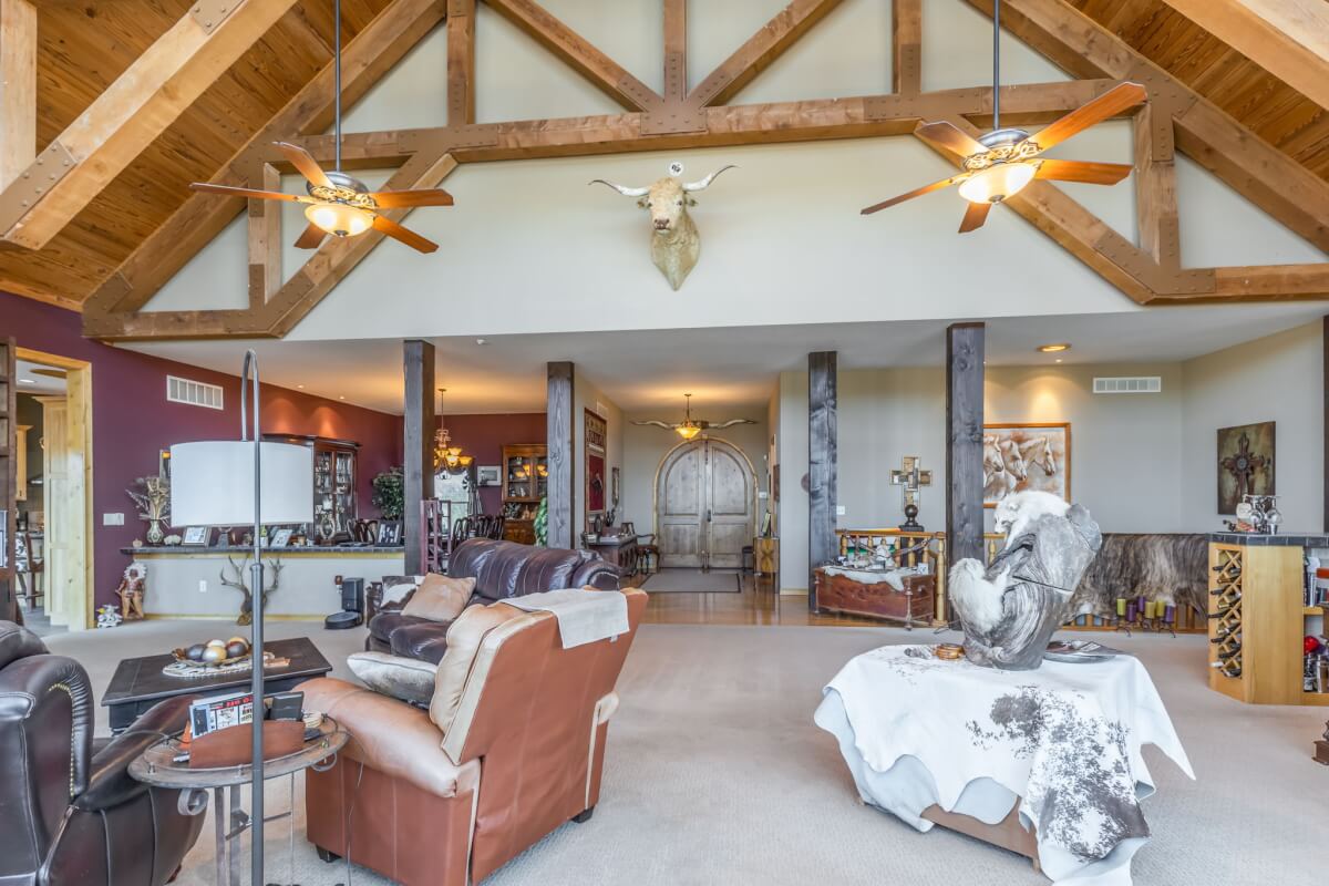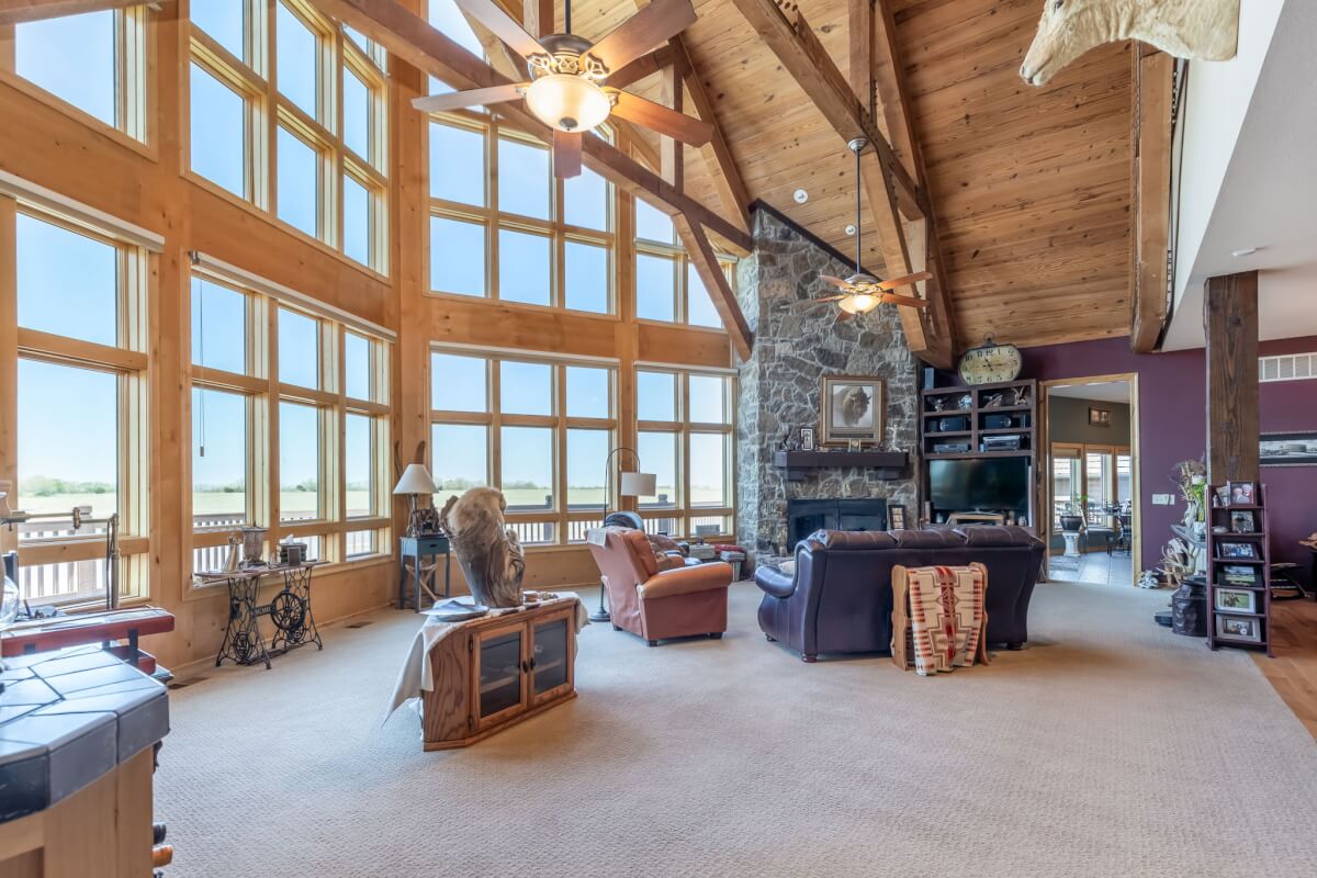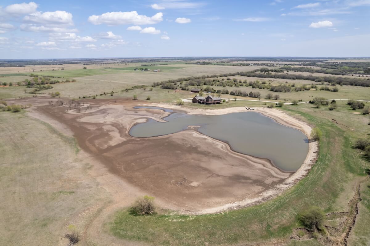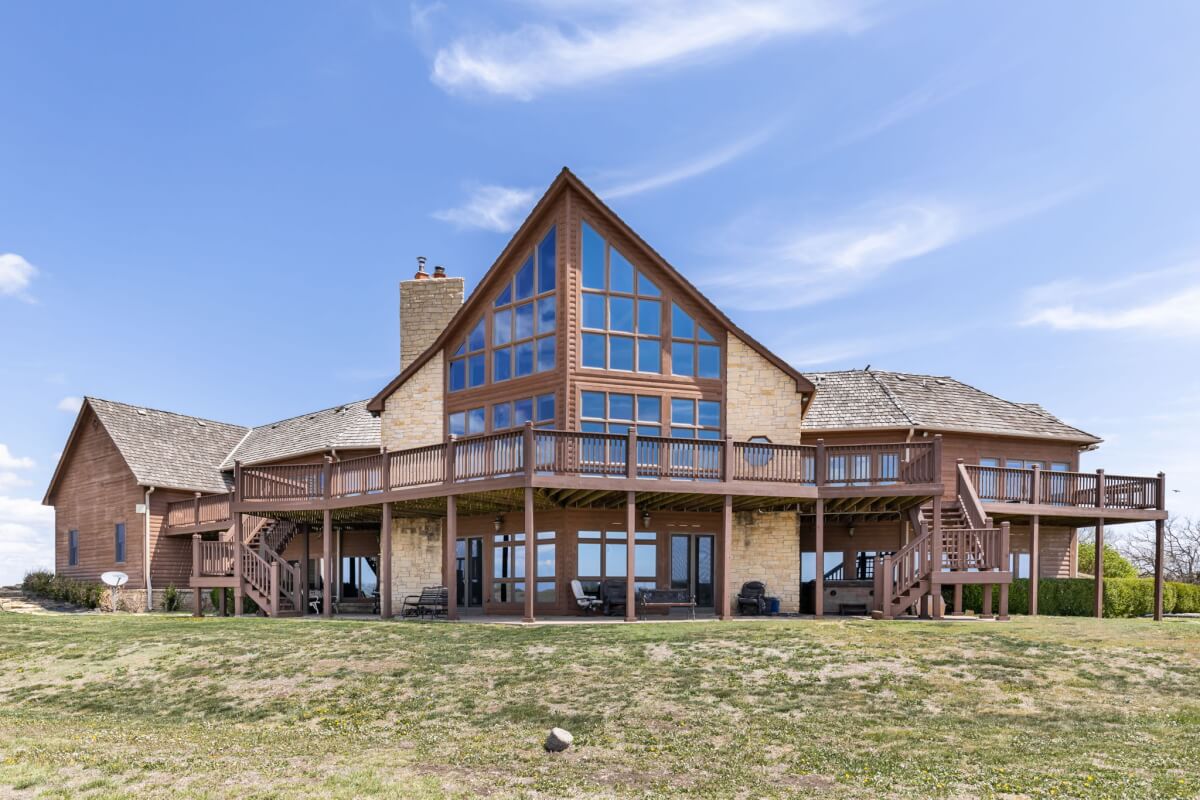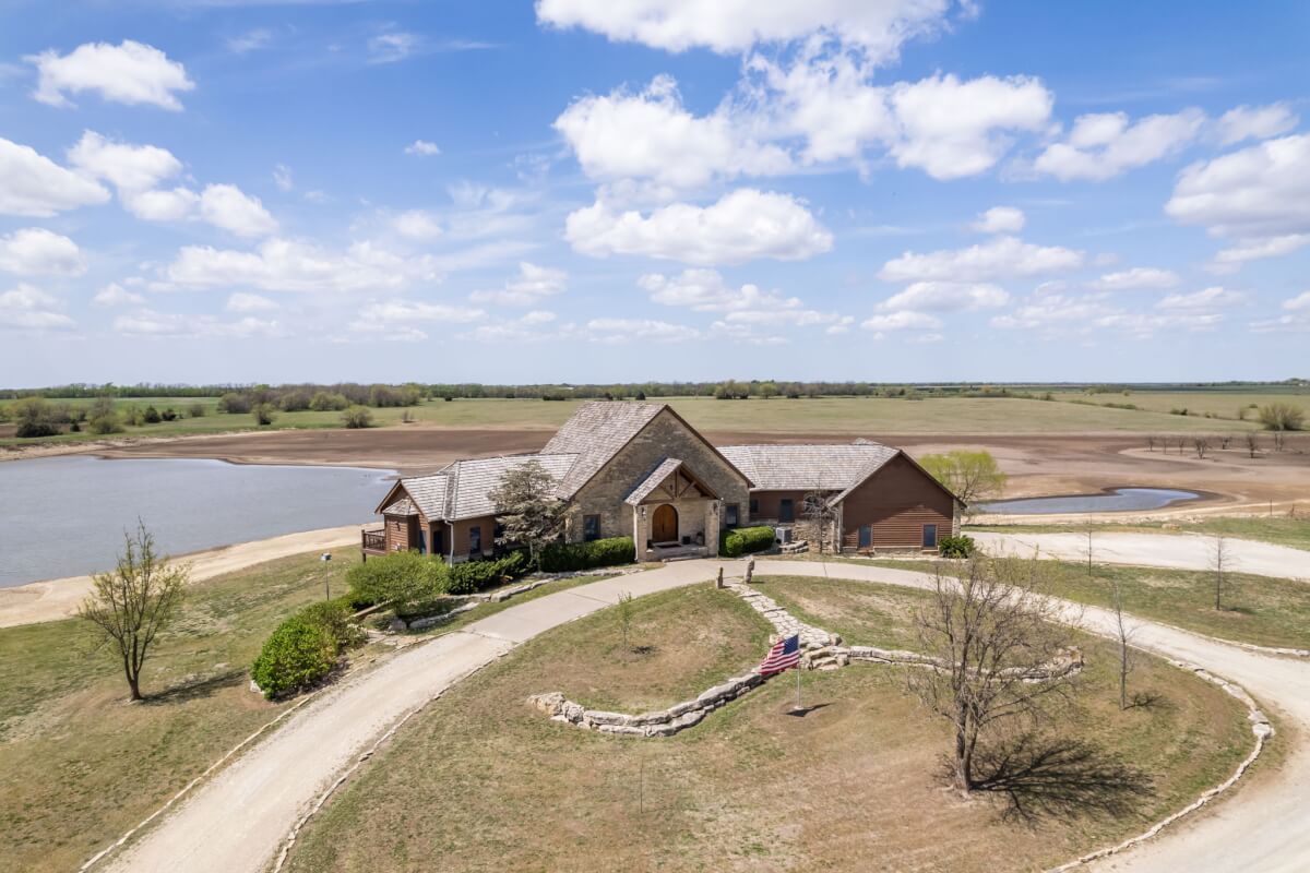 PROPERTY DESCRIPTION: NEW OPTION with additional acreage to own driveway in place. Beautiful gated entry offers secure entry into the private and secluded estate. What an amazing opportunity to own a beautiful house and horse barn on 110 acres in rural Butler County, Kansas east of Douglass. Overlooking an 18+- acre lake, of which a large portion is on this property, you won’t believe the amazing outdoor deck space offering tremendous views of every season! The house was built in 2006 with 3087 square feet of finished living area on the main level, plus another 1713 square feet of finished space in the basement, and a 3 car attached garage. There are currently 3 bedrooms and 5 1/2 baths. Approximately 28′ vaulted ceilings in the main floor living area are a sight to see! This house boasts 3 fireplaces, one in the main living area on each floor plus one in the master bedroom. Both of the living room fireplaces have inserts with blowers. The master bedroom fireplace is gas. Quality is abundant throughout, from the hard surface counter tops and high end stainless steel appliances in the kitchen, to the the beams and stone accents both on the interior and exterior. The horse barn has beautiful finish work both inside and out, with 4 stalls, a tack room, and a feed room. Additional exterior features of the property include good pasture, small creek, small pond, trees, and an area with the ground worked for an outdoor horse riding location. Utilities include a water well, electric, septic system and propane. A survey will be necessary to determine the exact property boundary and acreage.